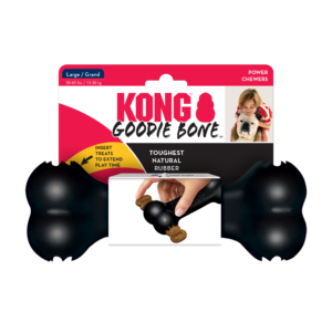 The KONG Extreme Goodie Bone™ toy delights dogs that are the toughest of chewers and that delight in chew sessions. Made from the most durable KONG Extreme unique, natural black rubber formula this bone is designed for determined chewers. The KONG Extreme Goodie Bone™ also features patented Goodie Grippers ™ that turn this entertaining toy into a fun treat dispensing challenge that can be stuffed with your dog’s favorite kibble.