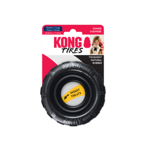 KONG Tires is a durable tire chew designed to provide the ultimate chewing experience. The uniquely shaped sidewalls and thick outer tread create a super durable, elastic barrier. The sidewalls are designed to double up and rebound when compressed to provide an active chewing experience, and the Tires are perfect for bouncy games of fetch.