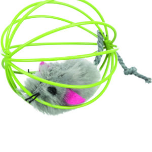 | A mouse encased in a wire ball – rolls, jingles, and keeps cats curious. |