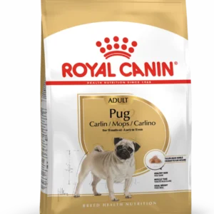 Suitable for dogs over 10 months old, ROYAL CANIN® Pug Adult is specially formulated with all the unique nutritional needs of your adult Pug in mind.Because the Pug’s skin is folded, and the folds can become warm and retain unwanted humidity, it’s important that your dog’s diet helps to support the health of its skin. ROYAL CANIN® Pug Adult’s exclusive formula helps to support the skin’s “barrier” role, as well as overall skin health.ROYAL CANIN® Pug Adult also contains a balance of nutrients that help to support your Pug’s muscle tone.Pugs have very specific features: a large head and a body with short, square muscles. Its jaws and very thick lips can make it difficult for it to pick up its food