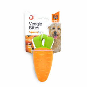 Fofos Vegi-bites Carrot is an engaging screaming squeaker dog toy that generates a loud squeaky noise. This fun toy can float in water and can be used during bath times to distract your pet for a hassle-free experience. This dog toy has a bumpy texture and is good for massaging teeth and gums. The green top of this toy is made from soft foam rubber and the bottom is made using durable TPR. Interactive dog toys such as this allow your dog to chew, fetch, and bite on them while getting the right amount of exercise. This toy is ideal for x-small-small dogs (0-10kg) of various breeds such as dachshund, pom, spitz, etc . This toy is strong but not indestructible and is best suited for pet dogs that have moderate chewing, and fetch playing style. Not recommended aggressive chewers.