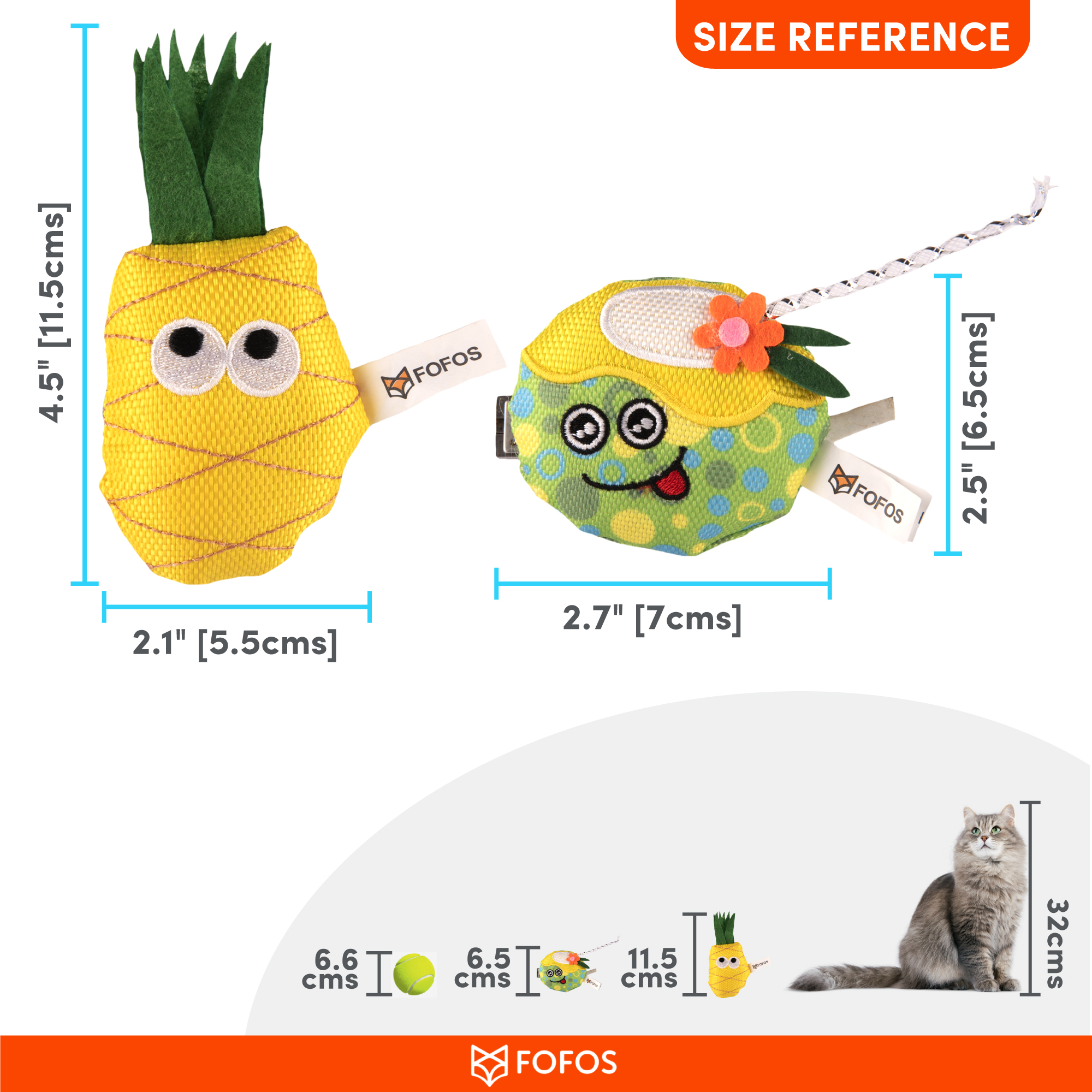 Catnip is a plant related to mint and contains an essential oil called nepetalactone that is known to cause euphoric, calming, and relaxing effects on cats. Catnip in small doses is completely safe, non-addictive for your kitten as the effects last about 10 mins for most cats. Fofos summer cat toys (juice and pineapple) are cute cat playing toys filled with imported US grade catnip dried leaves and grass powder. These Interactive toys allow your cat to chew, swat,nip, play,and even promote harmless biting and scratching. Fun engaging cat toys give your cat a mouse chase-like feeling ensuring good physical stimulation while the catnips give them a calm and relaxing experience. Ideal for small pet kittens above 6 months of age as well as for older cats of Persian and other breeds as well.