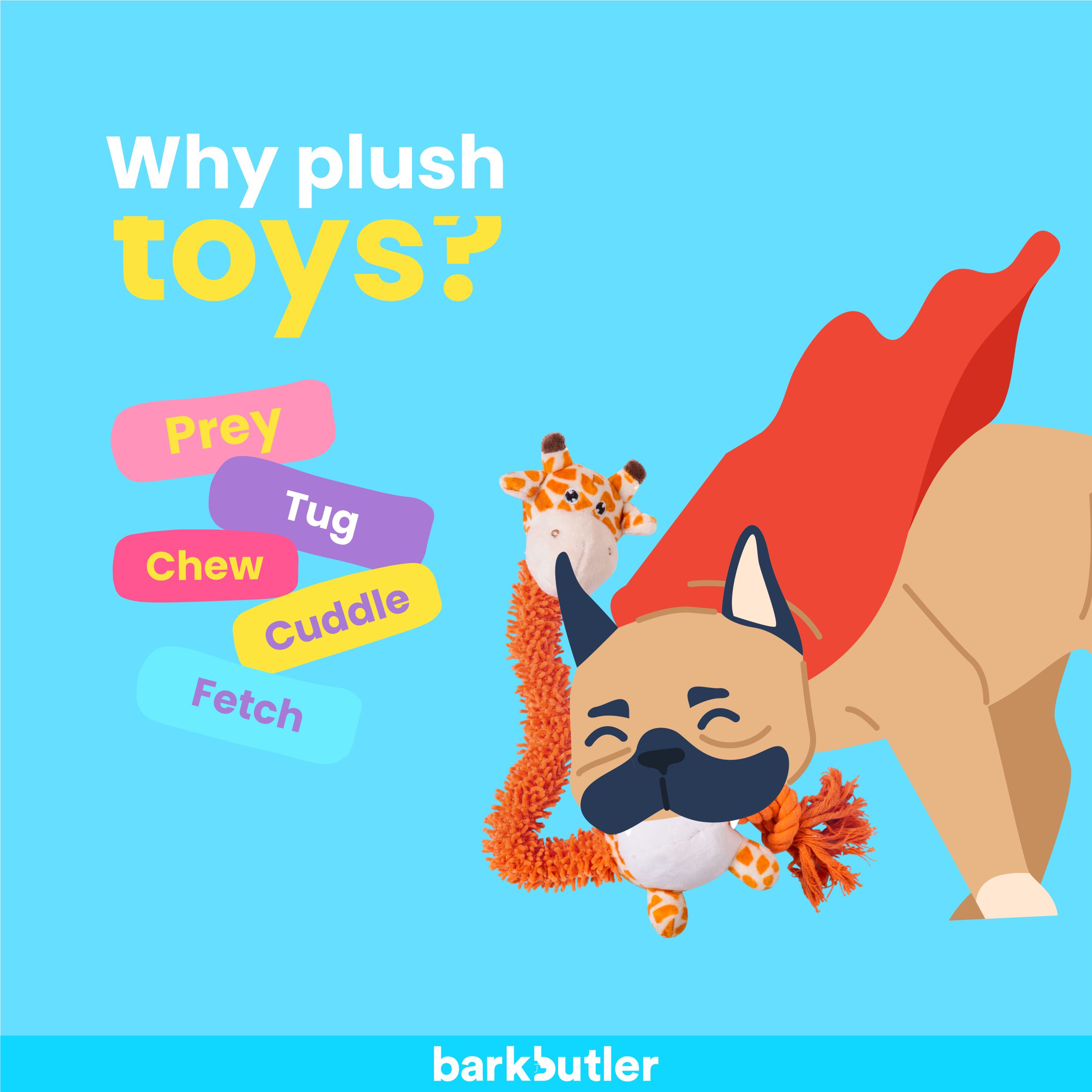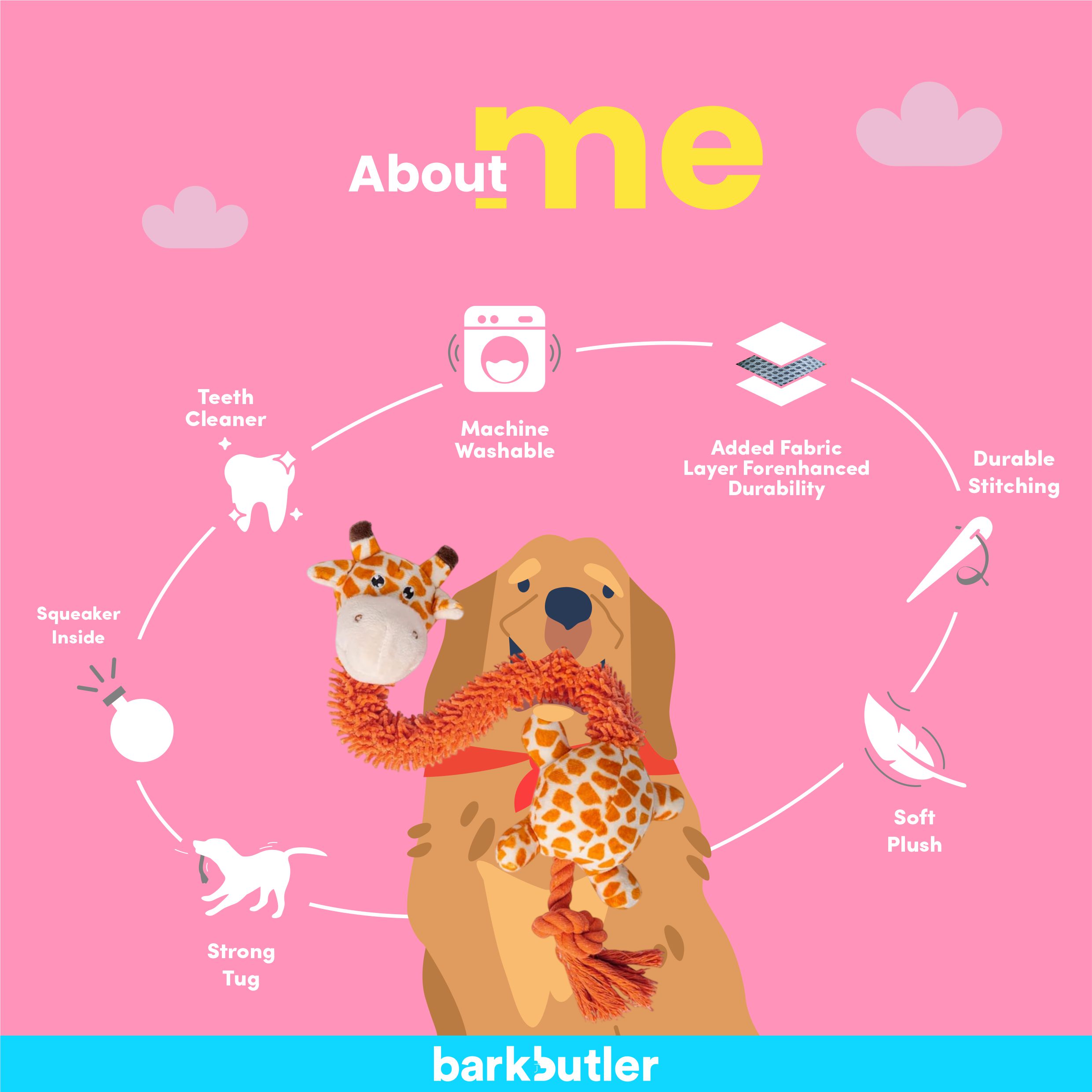 The dog toys squeaky feature adds another layer of interactivity to the dog biting toys, keeping your dog engaged and happy with these dog sound toys. These durable dog toys are also machine washable, ensuring the plush toys for dogs remain clean. The BarkButler Garry The Giraffe is a toy for dogs that’s a must-have addition to your plush dog toys collection. The tugging action with these dog rope toys helps clean teeth and massage gums. The dog rope toy enables interactive play. The soft fabric of this dog chew toy is easy on your dog’s mouth while remaining tough enough for strong chewers.