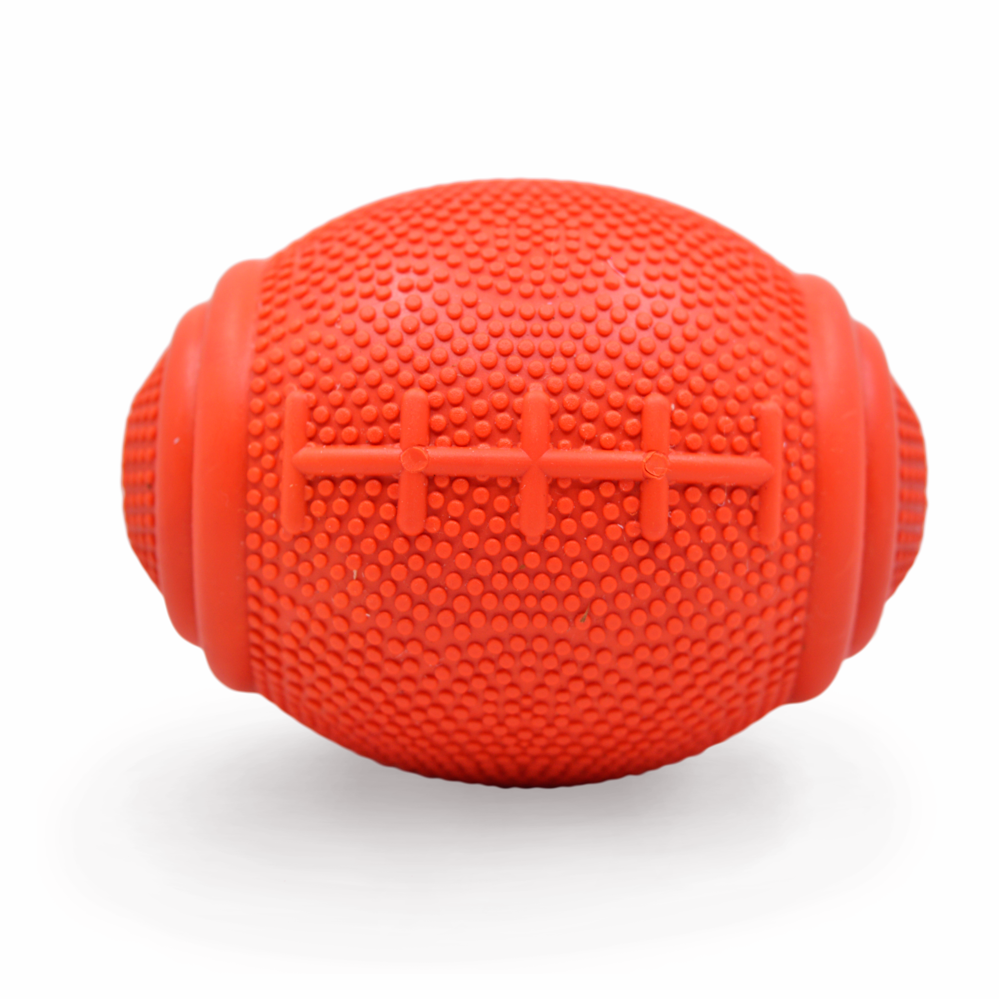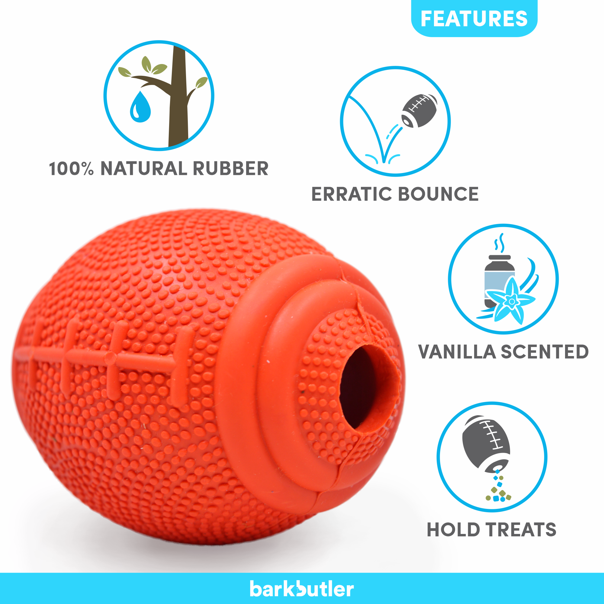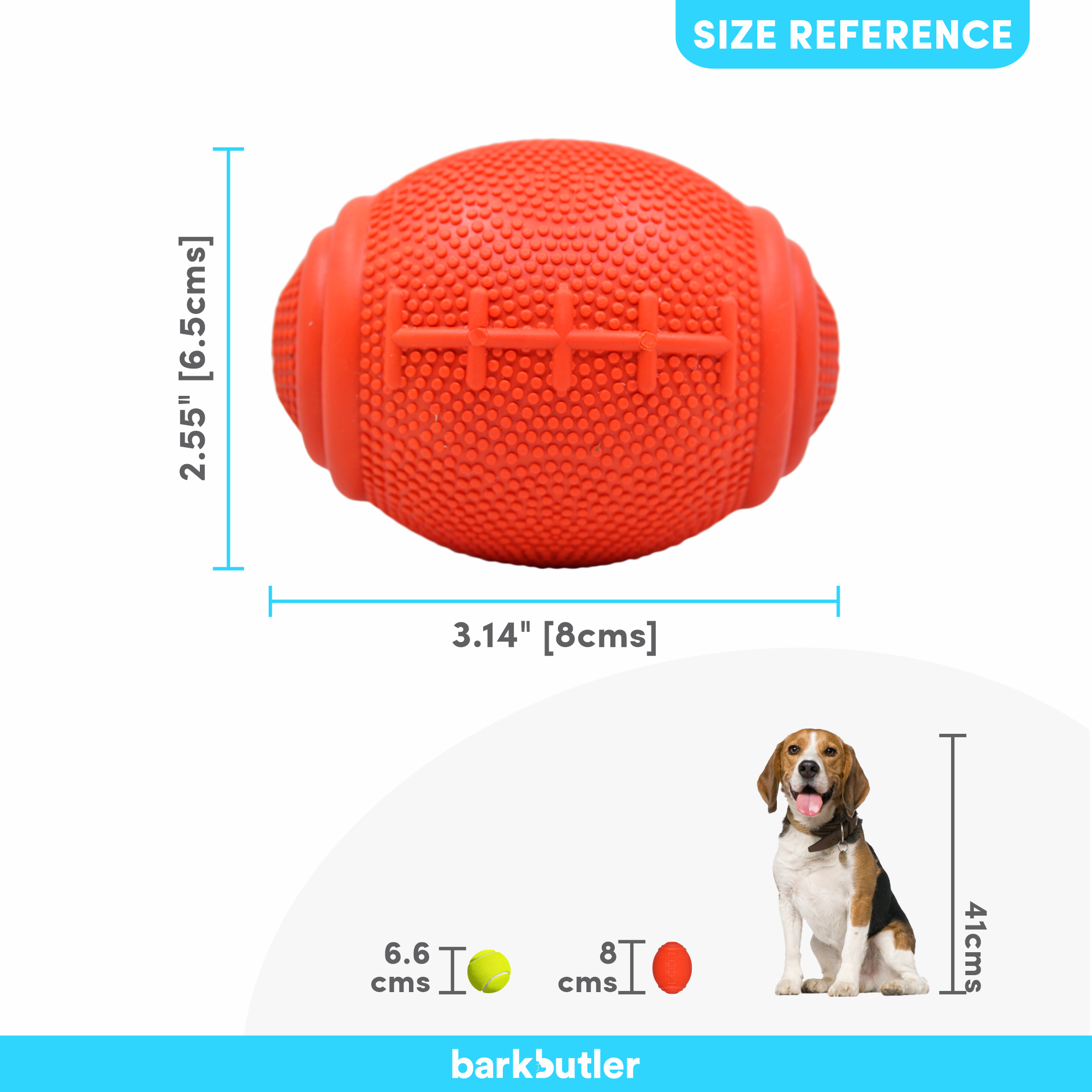 Barkbutler Basics – Just a fooball is a durable dog chew toy made from soft 100% natural rubber. It has an erratic bounce that makes playtime engaging for your puppy. Ball toys are perfect for a fun game of fetch, chase, and catch. This interactive toy is vanilla scented & treat-dispensing which means you can stuff food or treats inside the toy, keeping your dog busy and get the right amount of exercise. Fetching toys such as these are ideal for small-medium dogs (5-20kg) of breeds such as Shih Tzu, Beagle, Pug, dachshund, spitz, and Pom. This toy is strong but not indestructible, and is best suited for pet dogs that have aggressive chewing and fetch playing styles. Not recommended for extremely aggressive chewers.