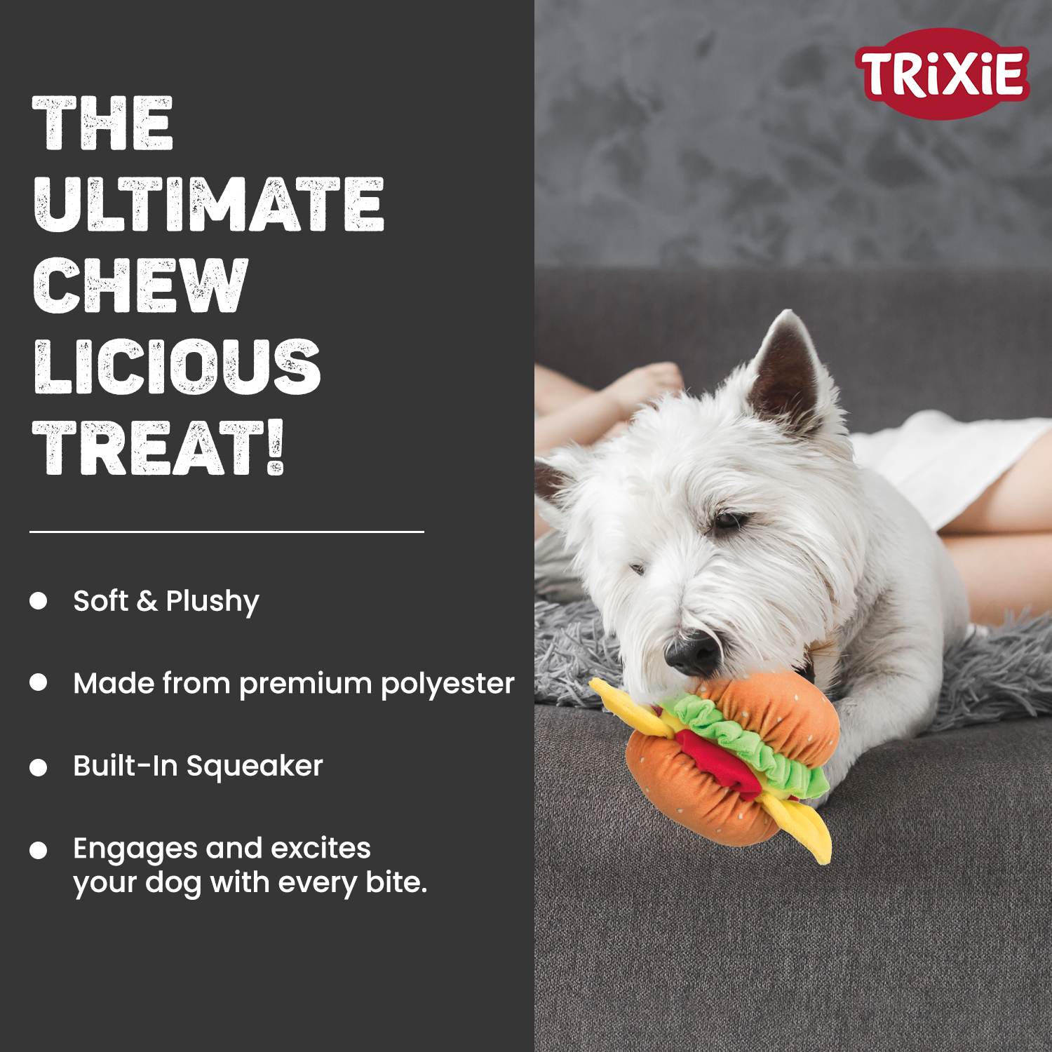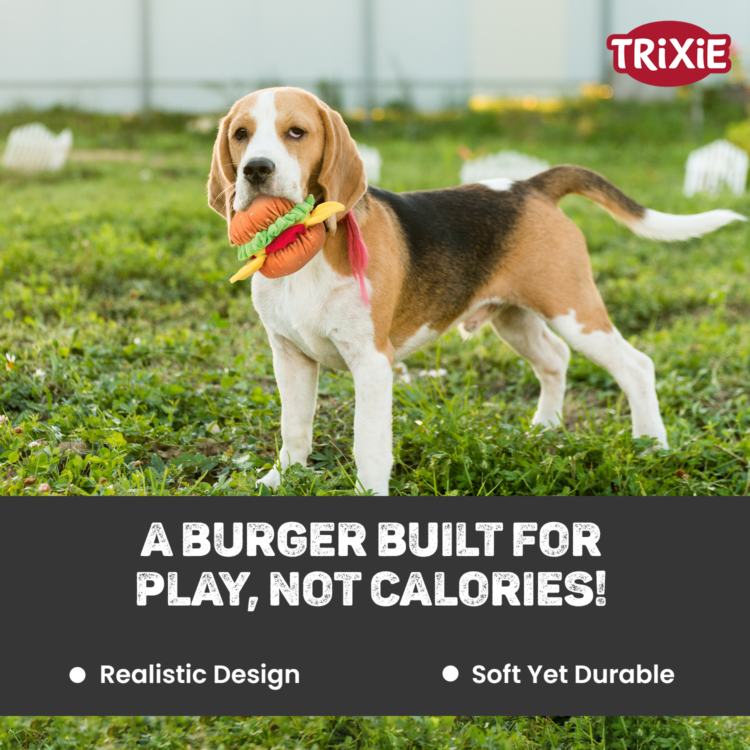 | A playful burger-shaped toy that’s perfect for bite-sized chewing and tugging fun. |