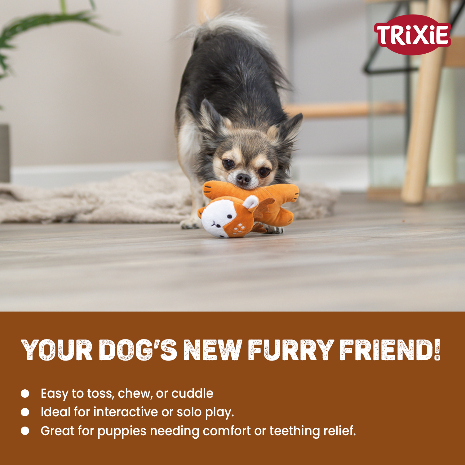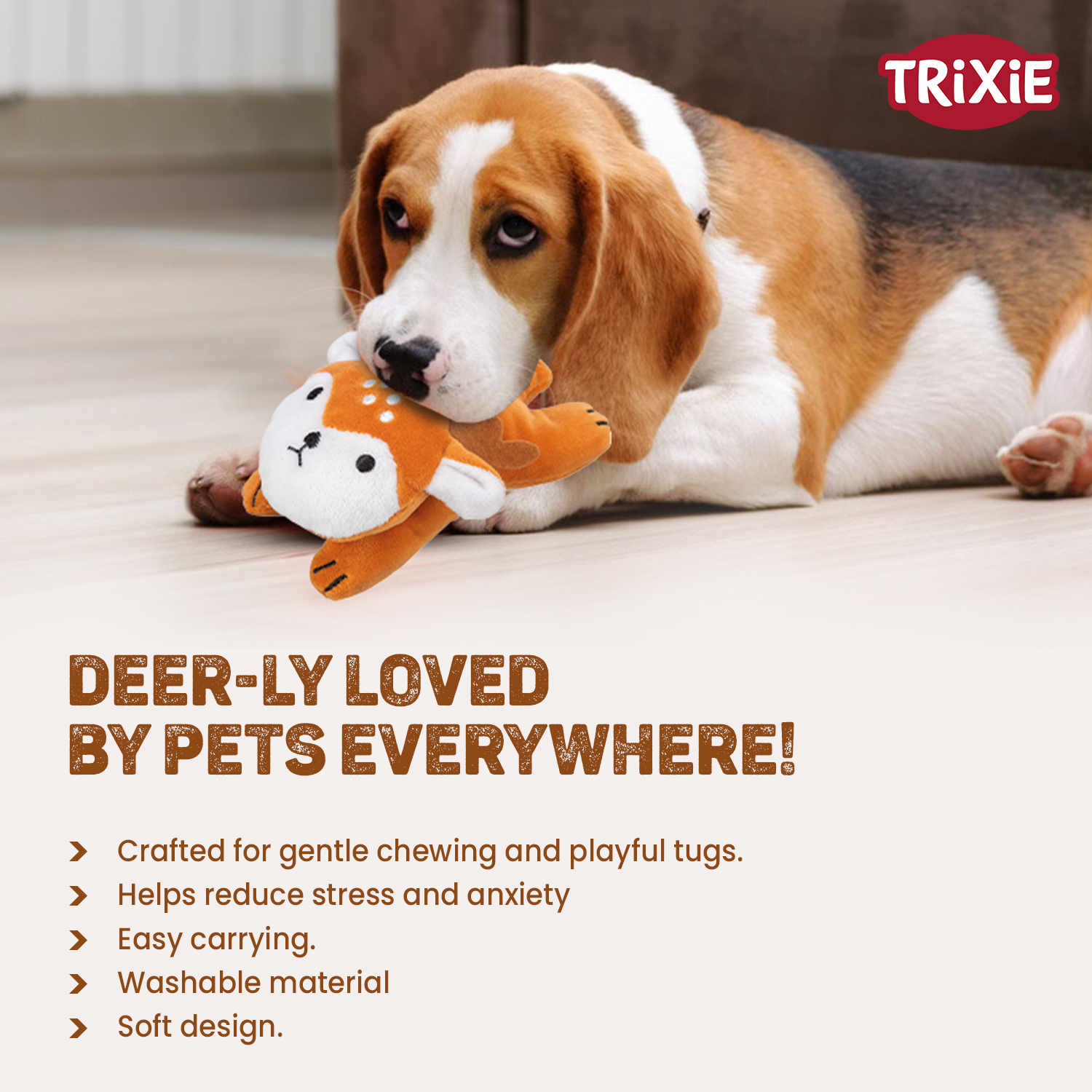 | A super soft and cuddly deer plush toy made for gentle chewers and snuggle time. |