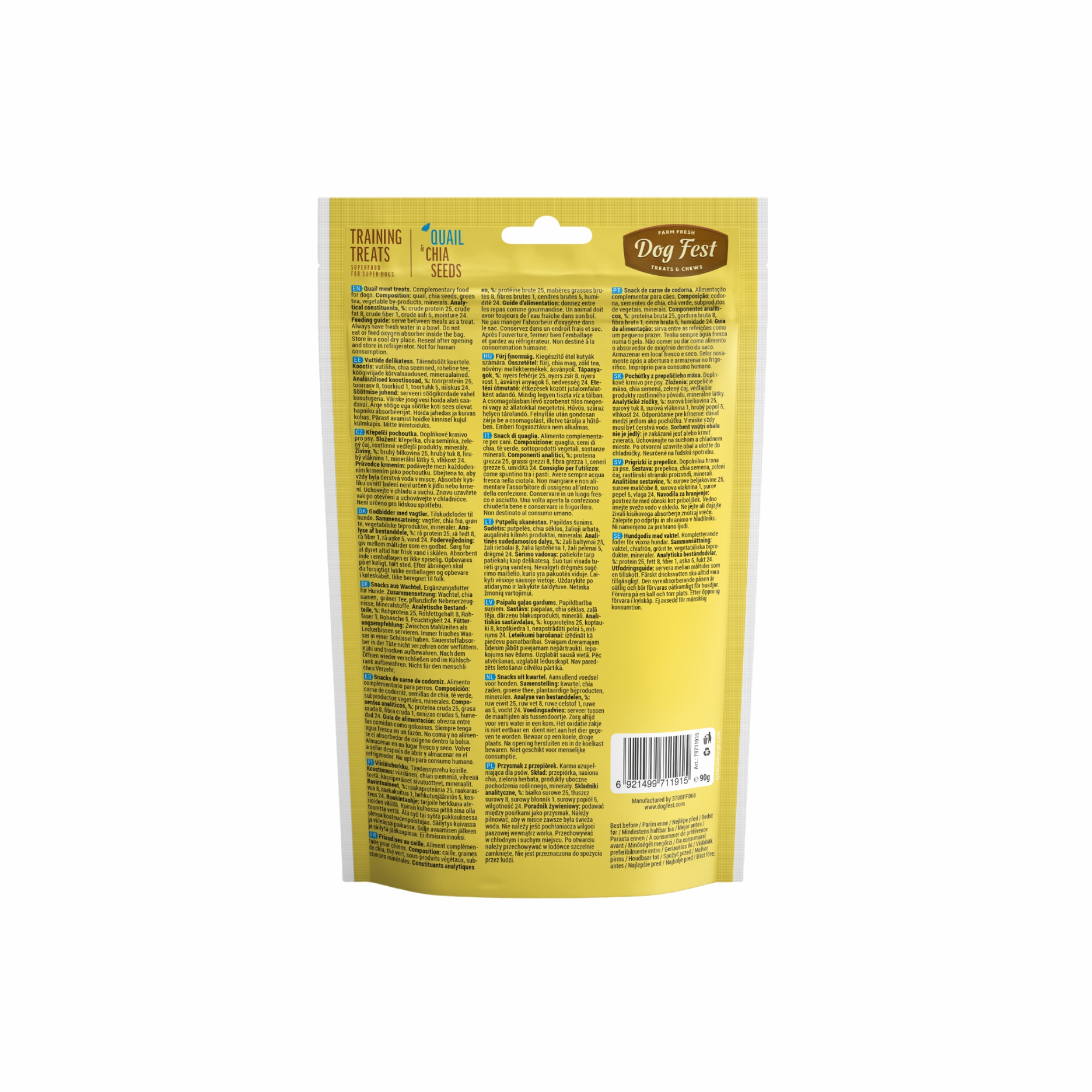 Introducing Dogfest Training Treats, crafted with premium quail meat and nutrient-rich chia seeds. Each bite is packed with high-quality, human-grade protein, ideal for fueling your furry friend’s active lifestyle. Infused with the natural goodness of chia seeds, these treats aid digestion and possess anti-inflammatory properties, rich in calcium and overall well-being.