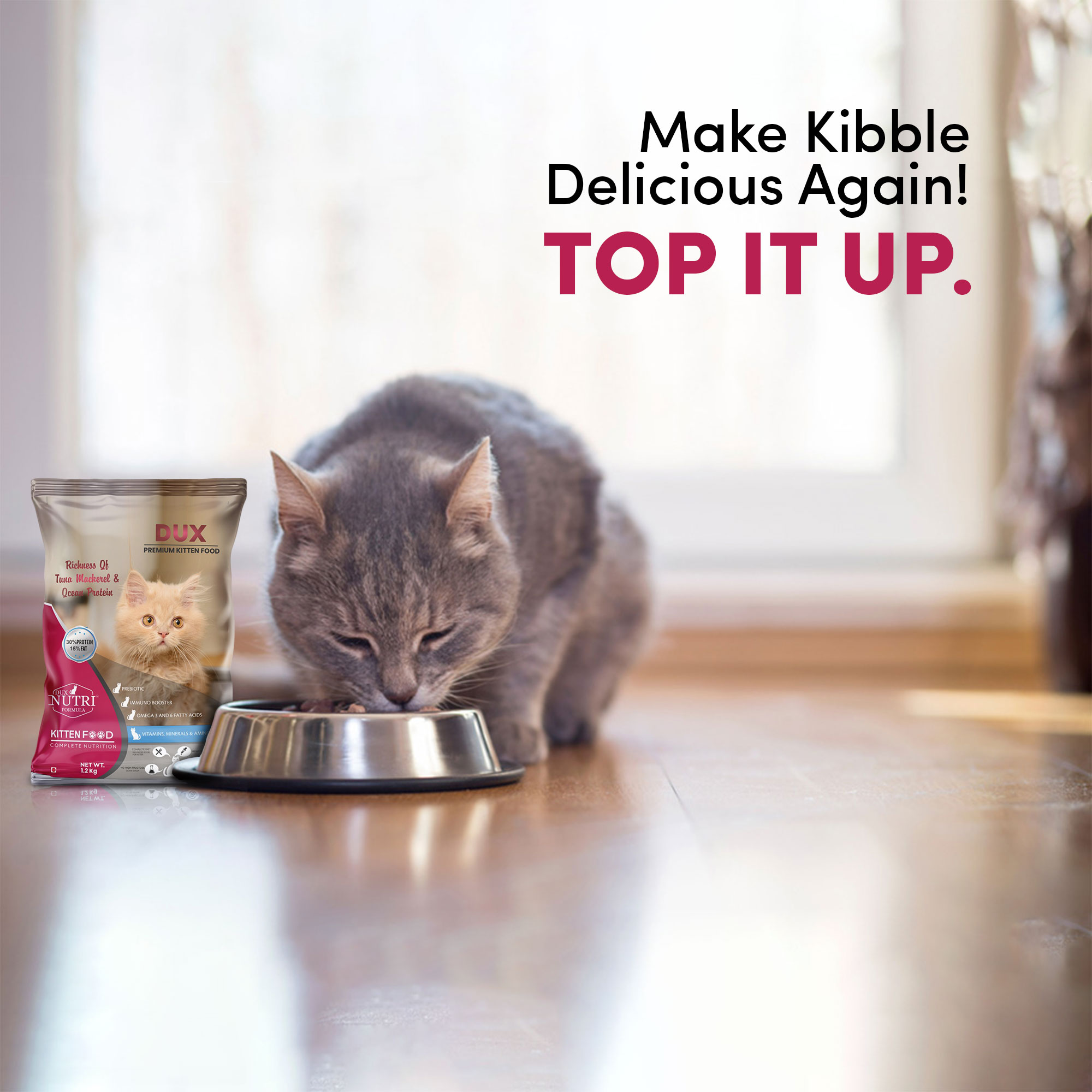 Barkbutler x DUX Premium Kitten Food is a complete & balanced low fat diet with rich flavors & enticing aromas which contains the essential nutrients a growing kitten needs. Made with the goodness of tuna & chicken to serve as rich, natural sources of protein. Omega 3 supports your feline companion’s heart health, promotes a silky coat, reduces itchy and flaky skin, and can help relieve allergies and joint pain. It can even help strengthen their immune system and could help them fight cancer. Your cat will not be a chonky one with this low fat diet. Essential Nutrients & Antioxidants ensure the betterment of your kitten.