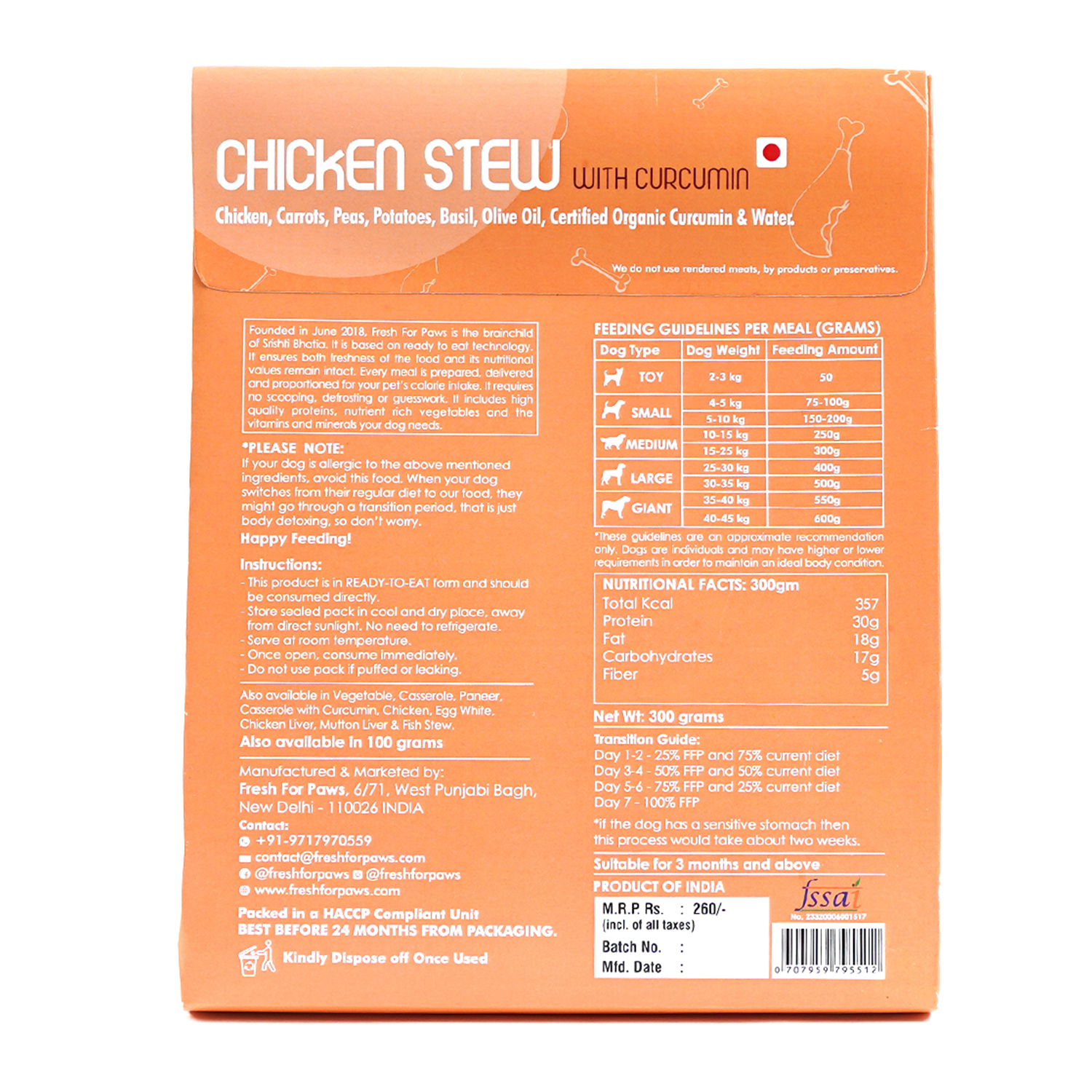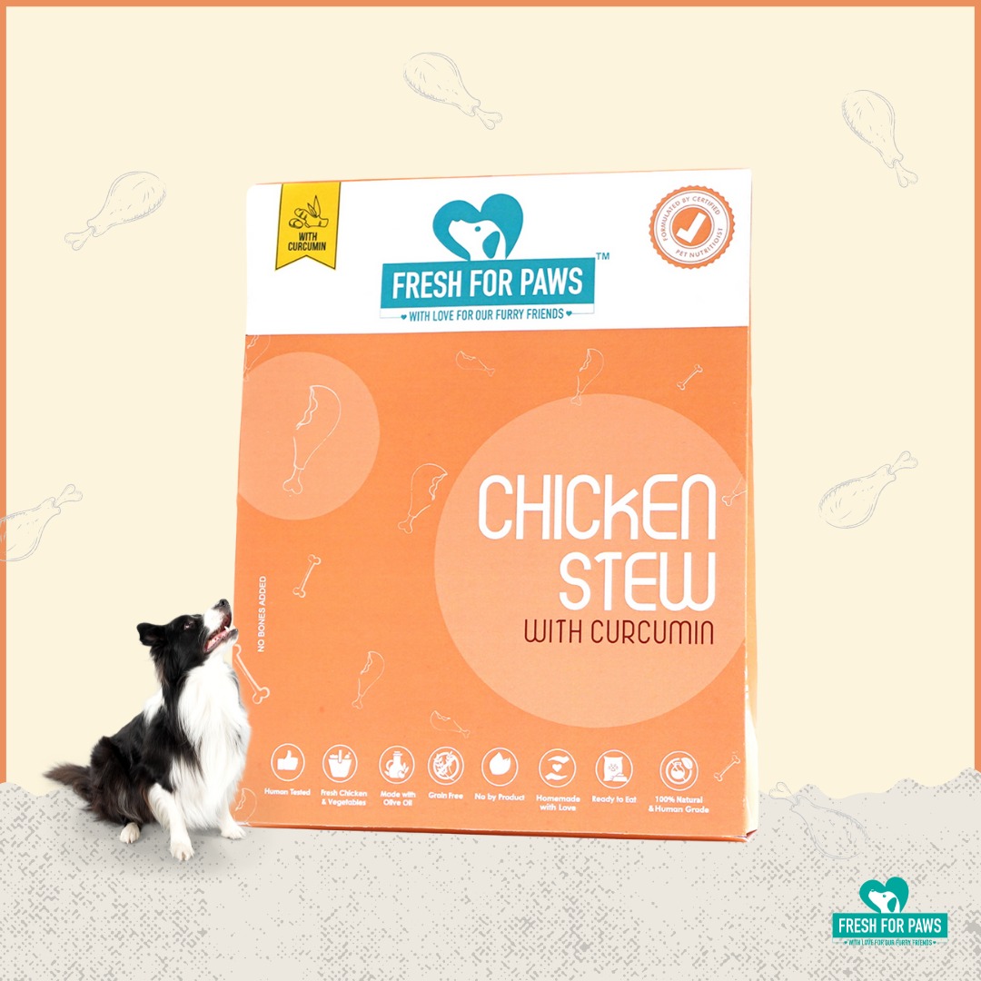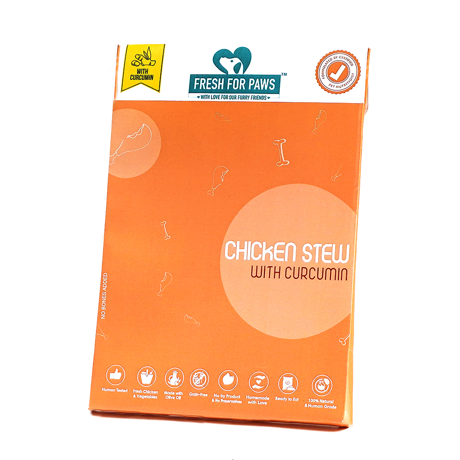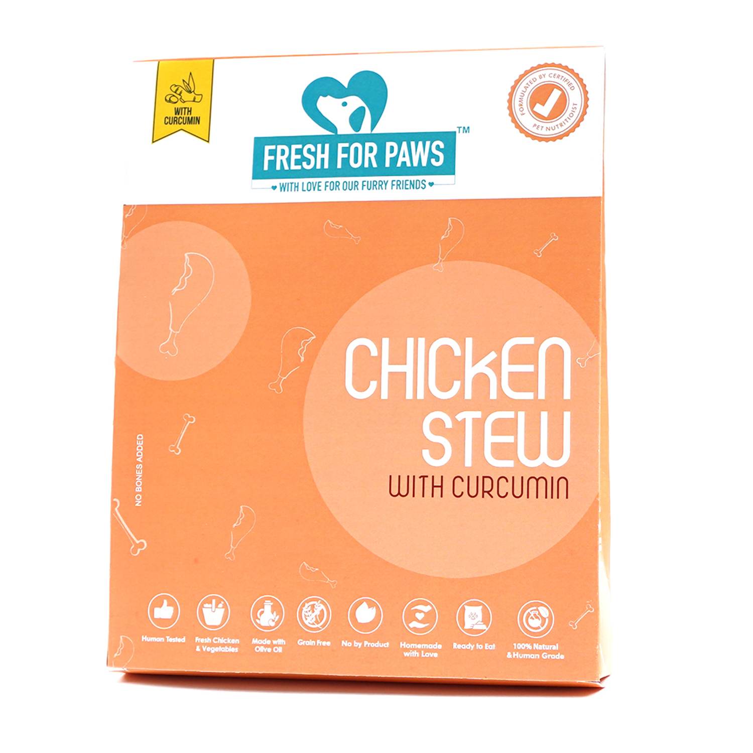Delicious chicken curcumin stew with real chunky chicken and the goodness of veggies, Fresh for Paws packs a complete balanced diet for all your furry babies needs. Delicious home cooked meals made with the same ingredients you cook with. Wet food is better appreciated by dogs who do not drink water regularly. No preservatives or other toxic additives. Human grade food made by humans in a human food facility ensures that the treatment, to the pet and its food, is fair.
