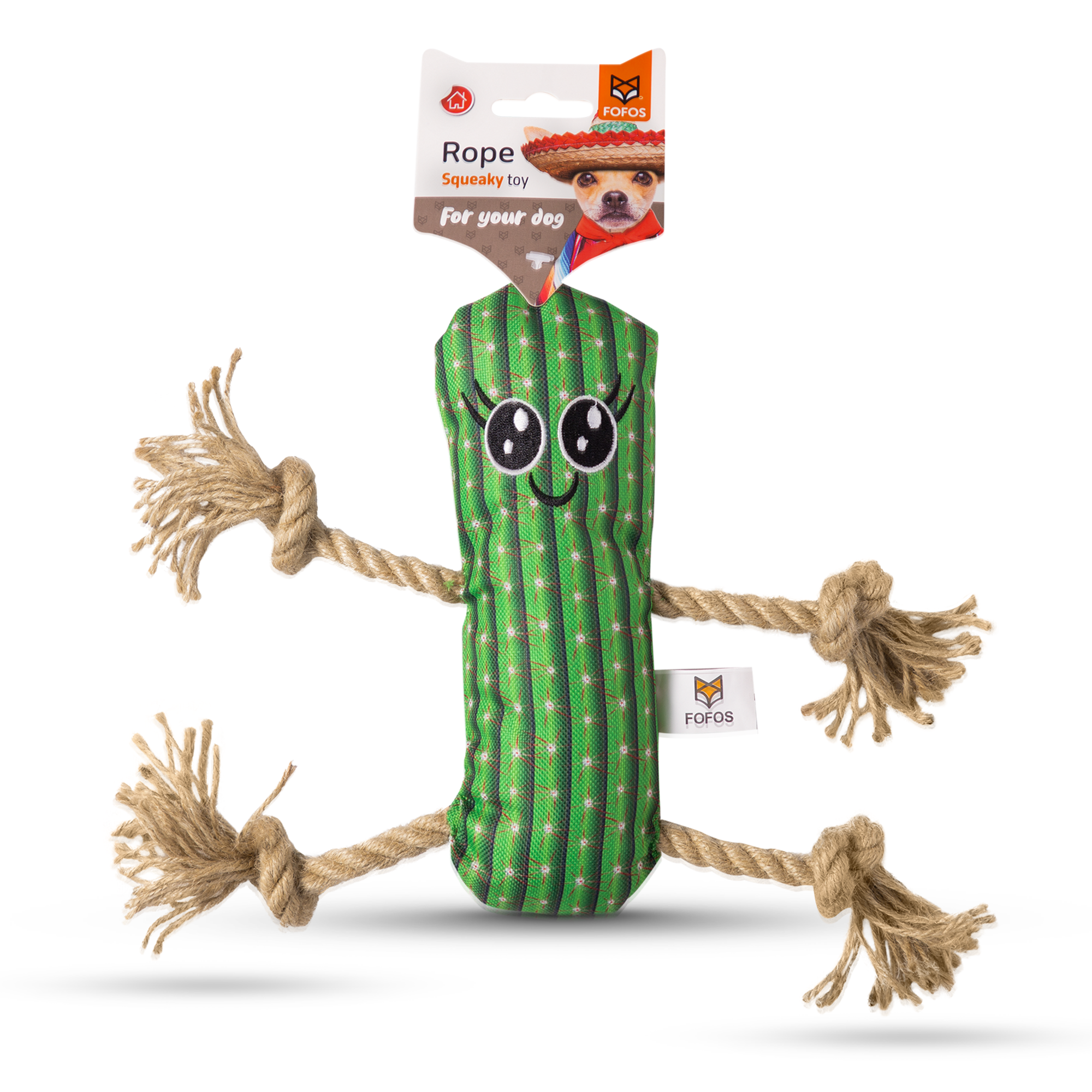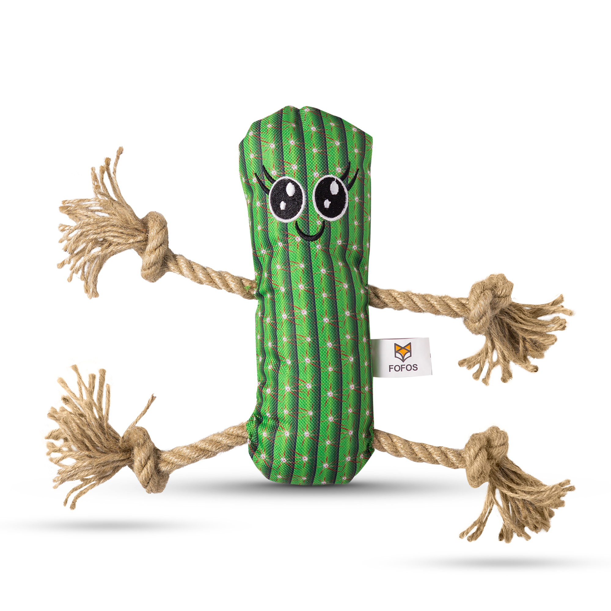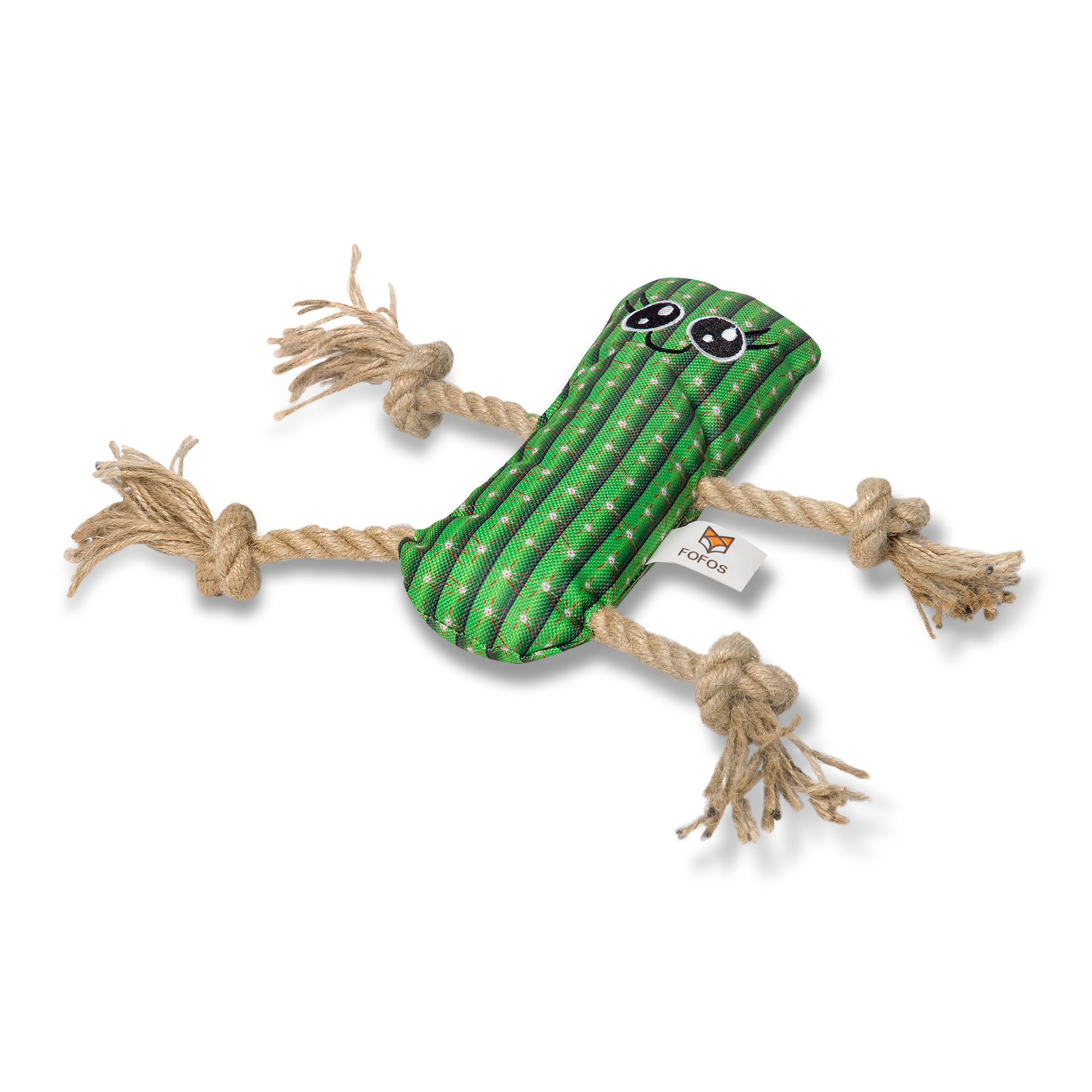 Fofos cactus man with hemp rope is a durable stuffed plush toy for dogs with a hemp rope attached to it. Hemp is an eco-friendly plant fibre and dogs are known to love the smell and texture of hemp products. This tug toy has a squeaker inside that generates a squeaky noise to make playtime engaging. It is perfect for games like tug of war. This dog toy is made from soft polyester fabric + hemp rope and is machine washable. Interactive dog toys such as this allow your dog to chew, tug, and bite on it while getting the right amount of exercise. This soft toy is ideal for small-medium dogs (5-20kg) of various breeds such as dachshund, pom, labrador, etc . This toy is strong but not indestructible and is best suited for pet dogs that have light chewing, fetch, cuddle and indoor playing styles. Not recommended for aggressive chewers.
