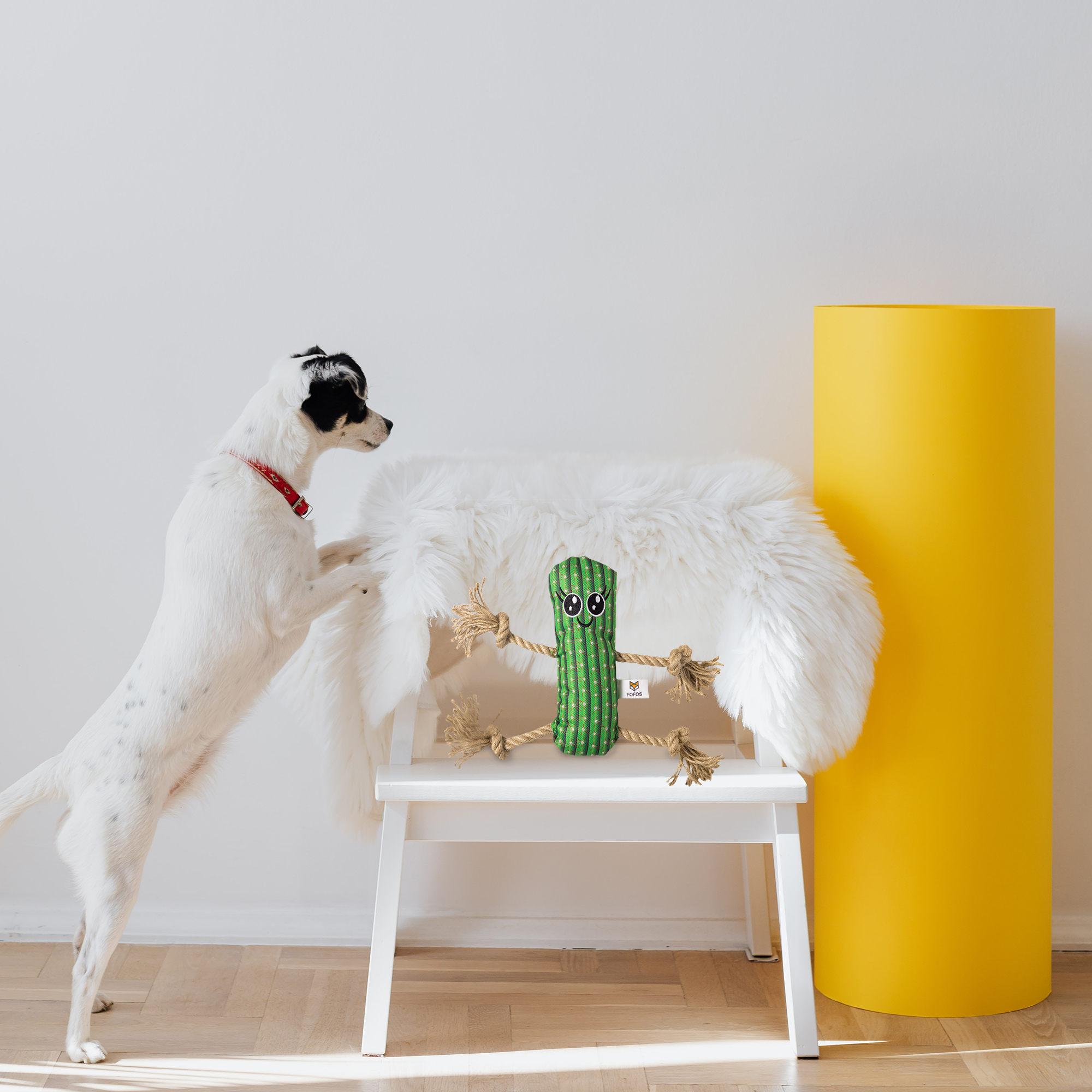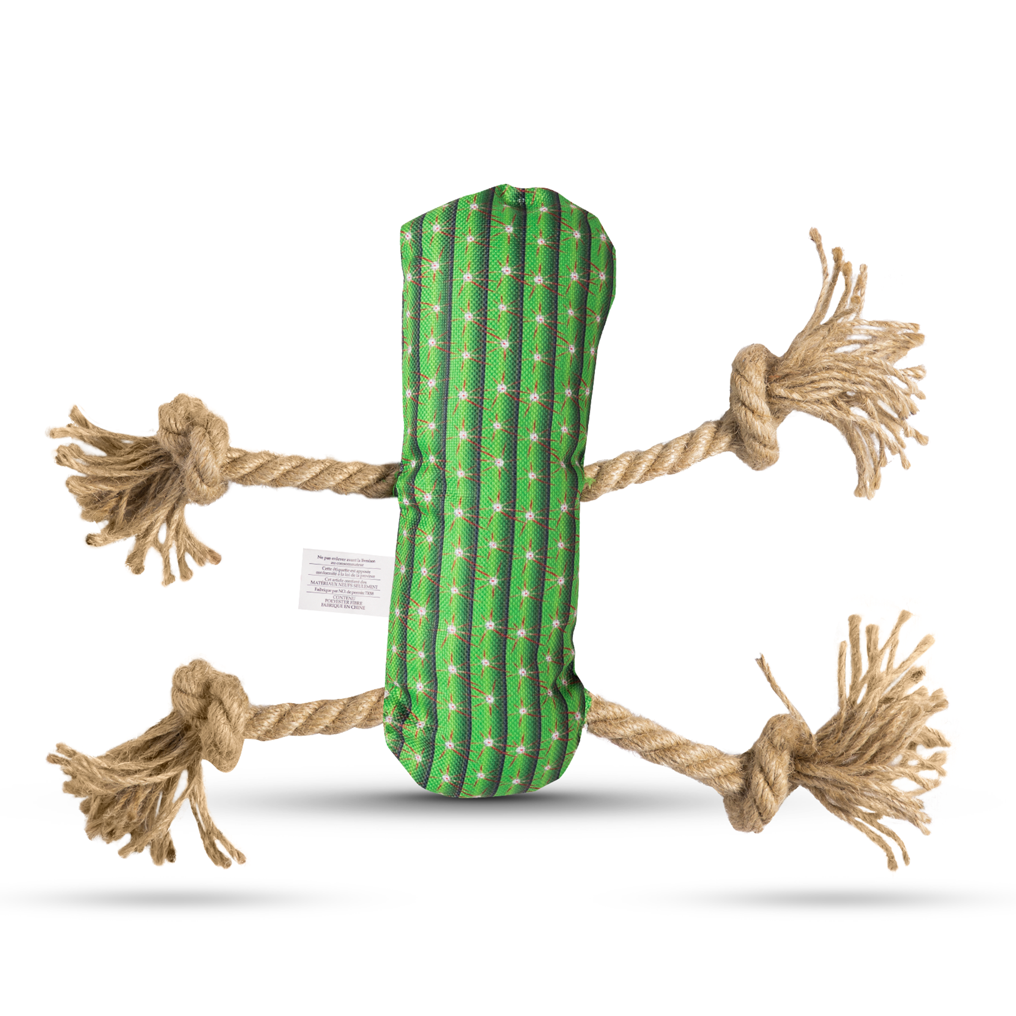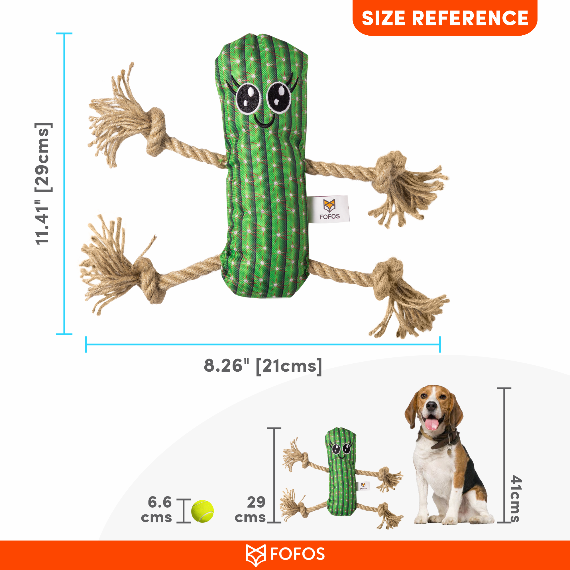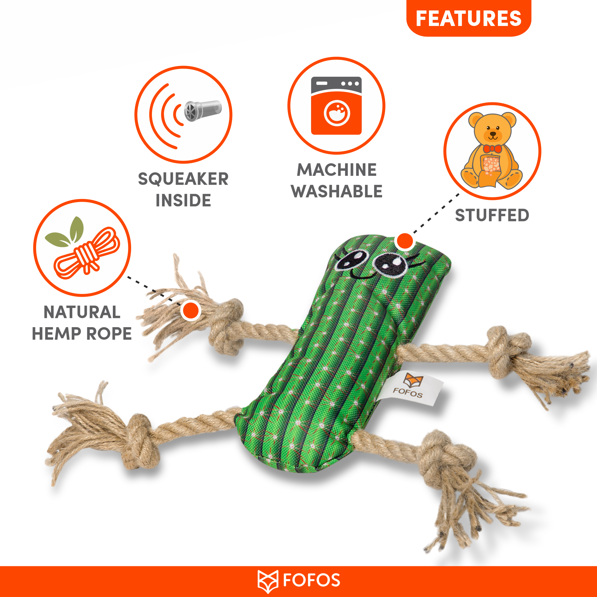 Fofos cactus man with hemp rope is a durable stuffed plush toy for dogs with a hemp rope attached to it. Hemp is an eco-friendly plant fibre and dogs are known to love the smell and texture of hemp products. This tug toy has a squeaker inside that generates a squeaky noise to make playtime engaging. It is perfect for games like tug of war. This dog toy is made from soft polyester fabric + hemp rope and is machine washable. Interactive dog toys such as this allow your dog to chew, tug, and bite on it while getting the right amount of exercise. This soft toy is ideal for small-medium dogs (5-20kg) of various breeds such as dachshund, pom, labrador, etc . This toy is strong but not indestructible and is best suited for pet dogs that have light chewing, fetch, cuddle and indoor playing styles. Not recommended for aggressive chewers.