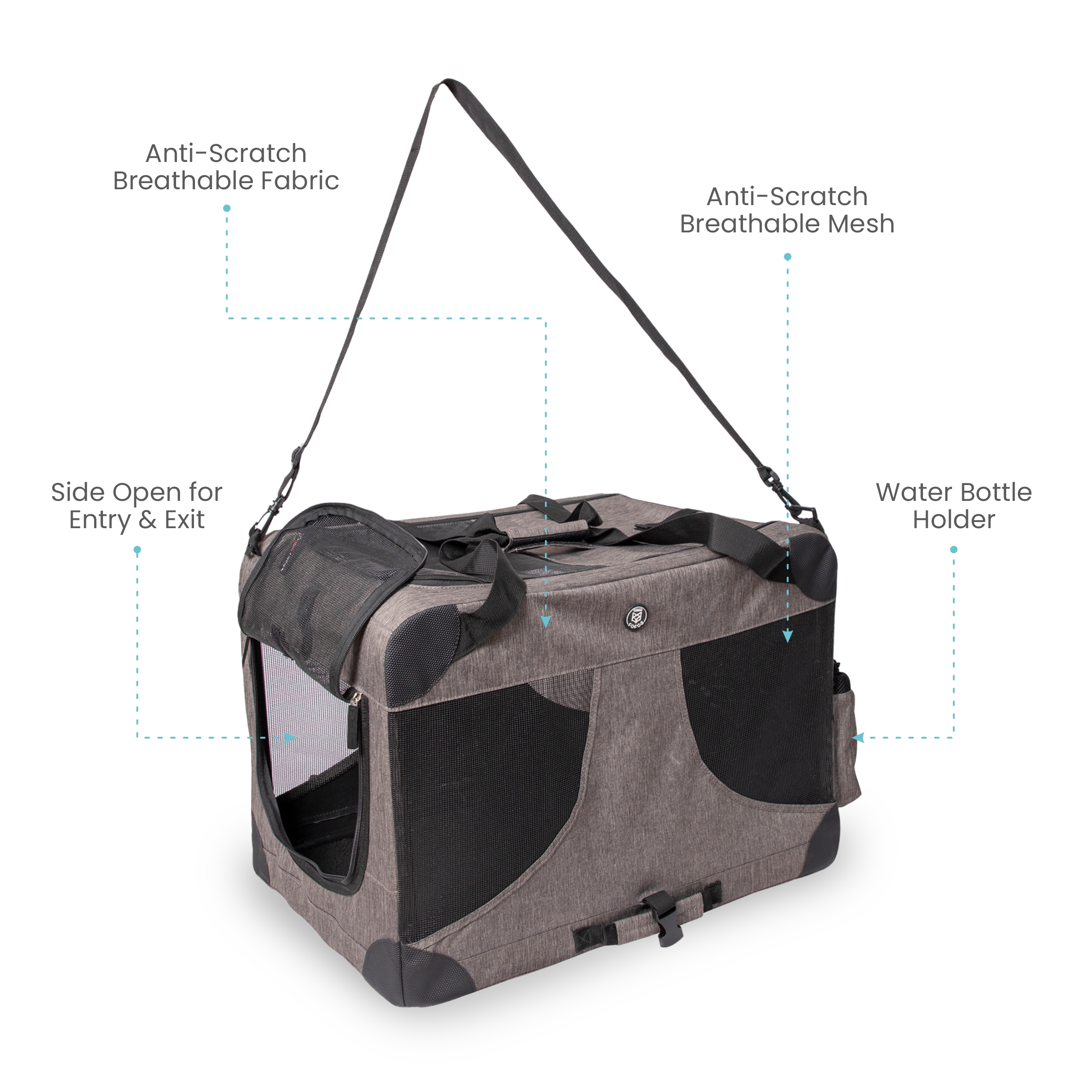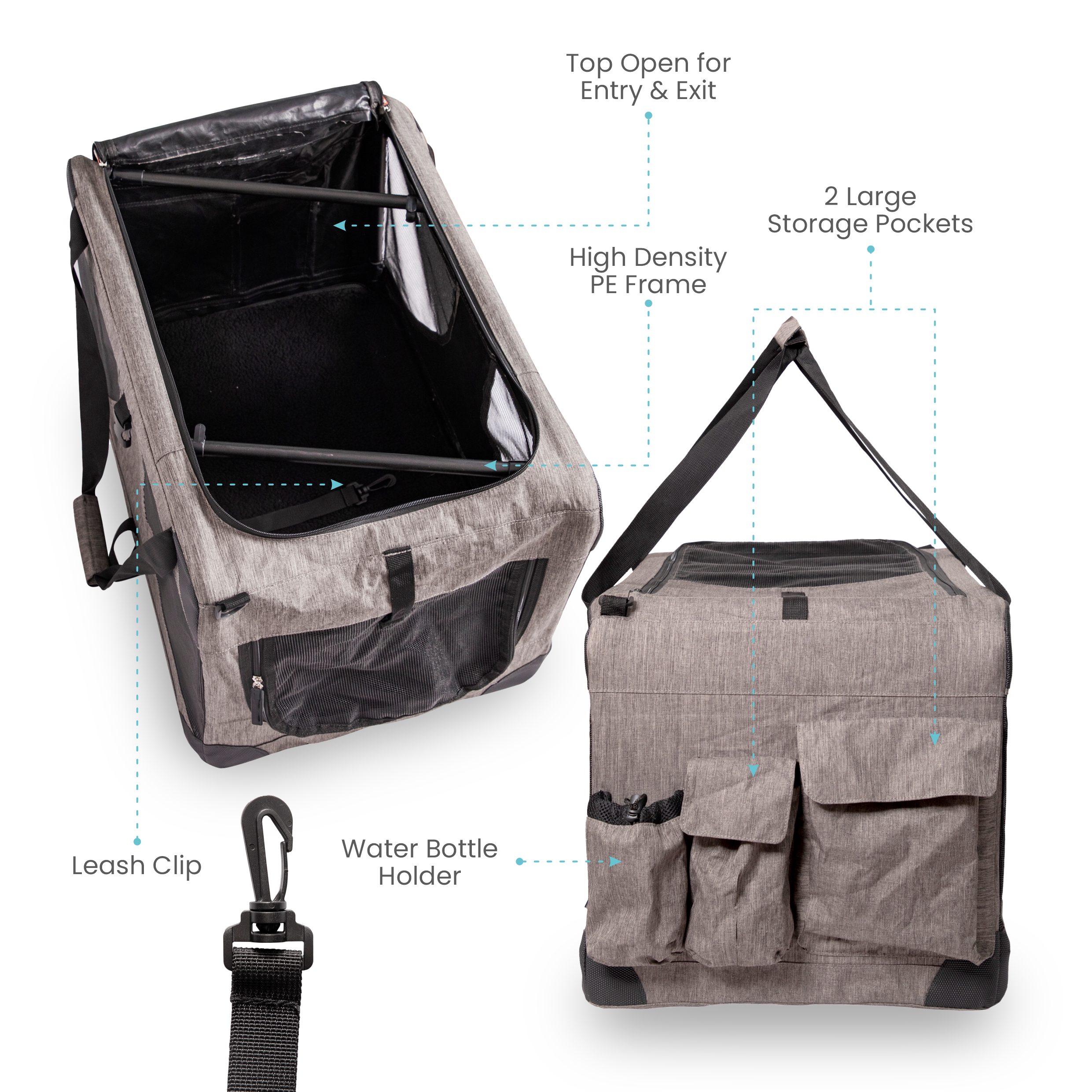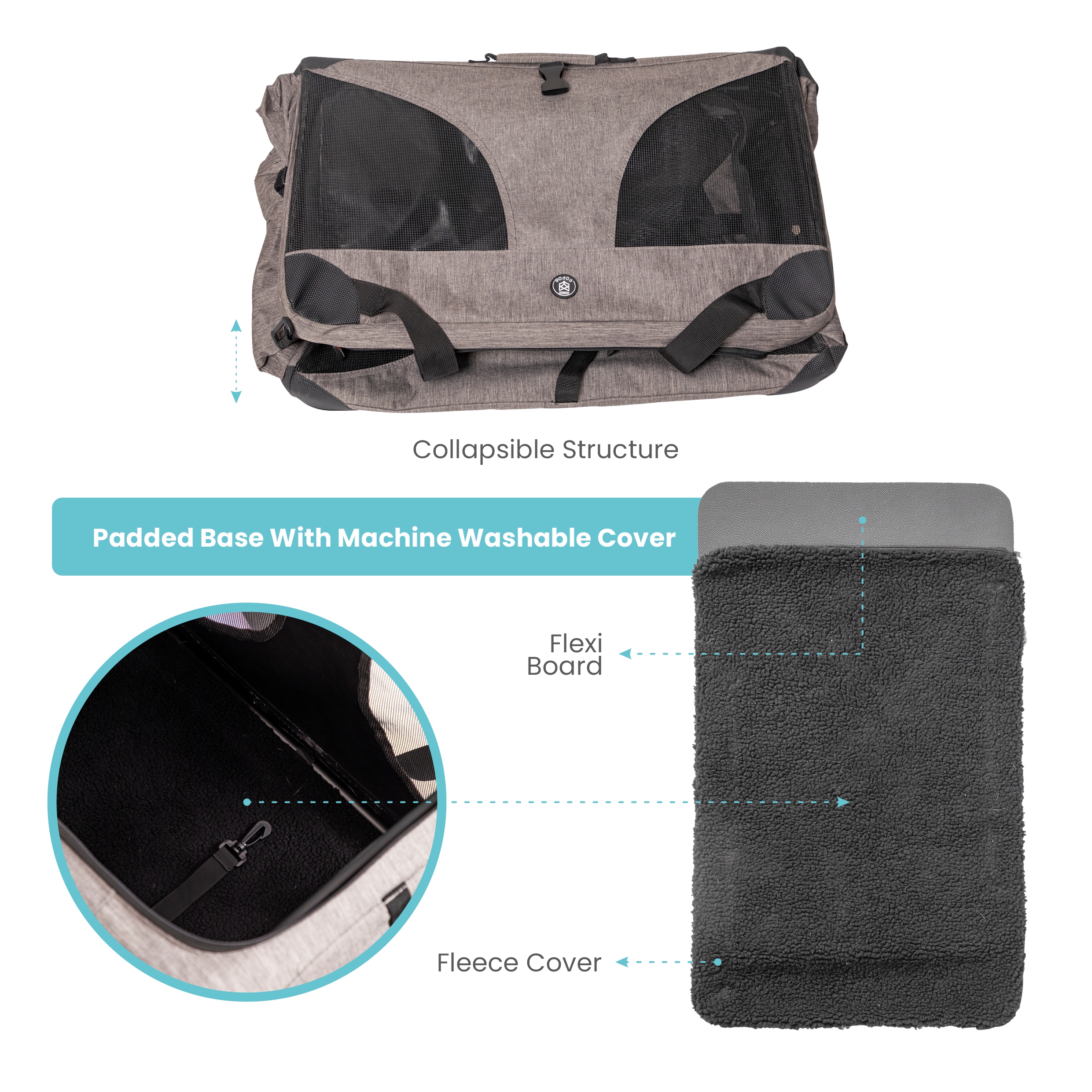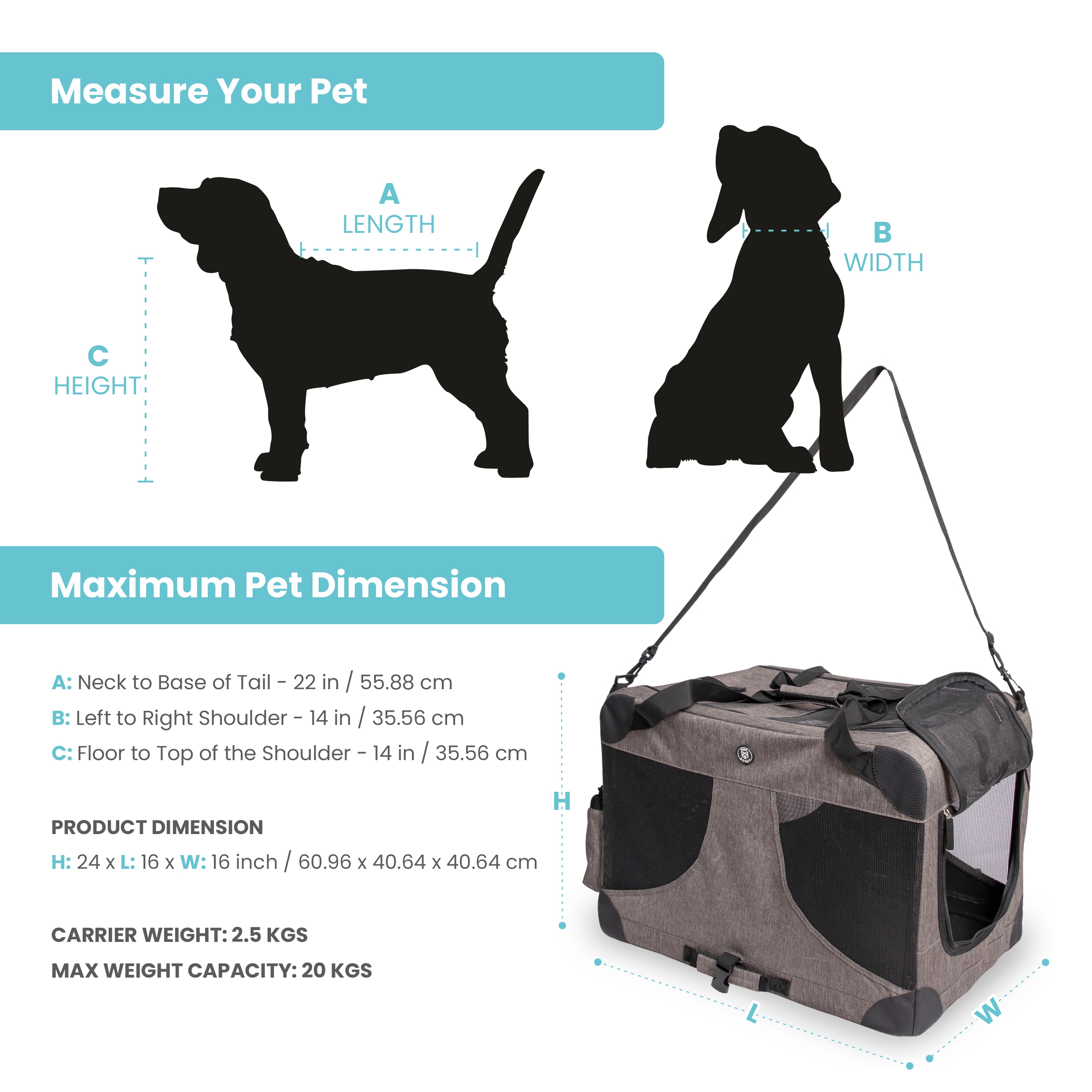 Soft-sided expandable pet carrier with an anti-scratch breathable mesh window, fabric for maximum airflow/ventilation and vision. The bottom has a removable soft-padded base with a machine washable cover that acts like a cushion allowing your pet to rest with ease while travelling. Durable rubber gripped zippers are added for ease of use. 2 large storage pockets are provided to hold food, treats, toys etc and a water bottle holder is provided. This lightweight carrier comes with sturdy straps for hand & shoulder carry. A durable ABS plastic leash is provided for extra security. This pet carrier opens from the top and one side for entry and exit. It can be easily folded into a briefcase structure to fit in your car or suitcase making it convenient to travel with. It provides a cosy and restful environment for your pet and reduces stress and anxiety travel. To choose the right carrier for your pet measure your pet’s length from neck to base of the tail (L), height from floor to top of the shoulder (H) and width (B) Carrier dimensions :L = x B = x H = in Max pet dimensions L = 22 x B = 14 X H = 14IN Max weight capacity of 20 kgs This will ensure enough support and room for your pet to stretch and get comfortable. This pet carrier is suitable for fitting into large bicycle baskets, road travel, trips to the vet/groomer, outdoor events etc