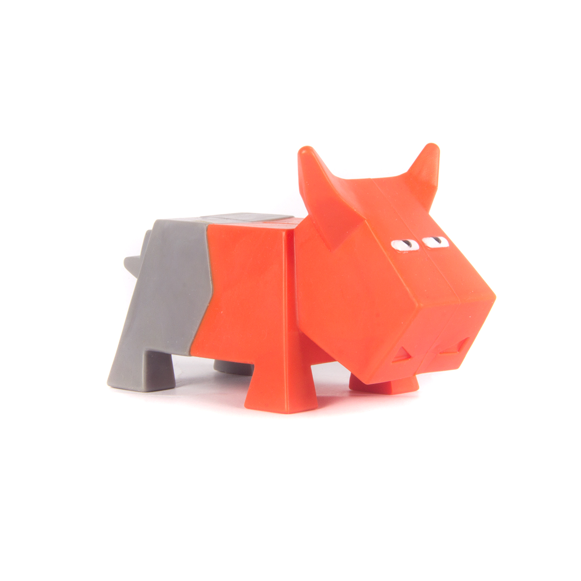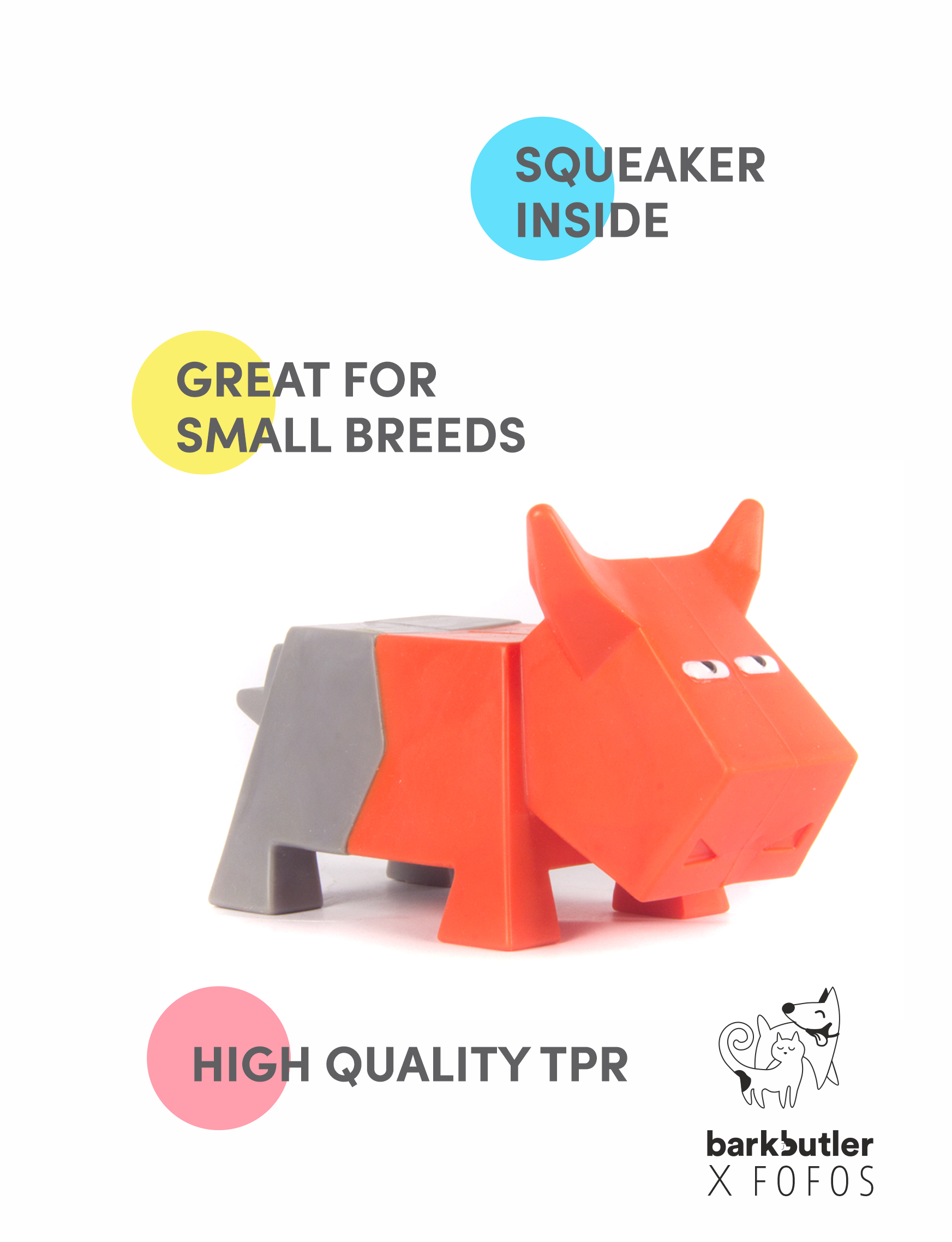 This ox rocks! If your dog is a nibbler, don’t think twice. This toy keeps hyper-active dogs busy as its inviting texture gives them something to do- chew. This squeaky toy for dogs squeaks when thrown, bitten into or pounced upon. Made from non-toxic Thermoplastic Rubber.