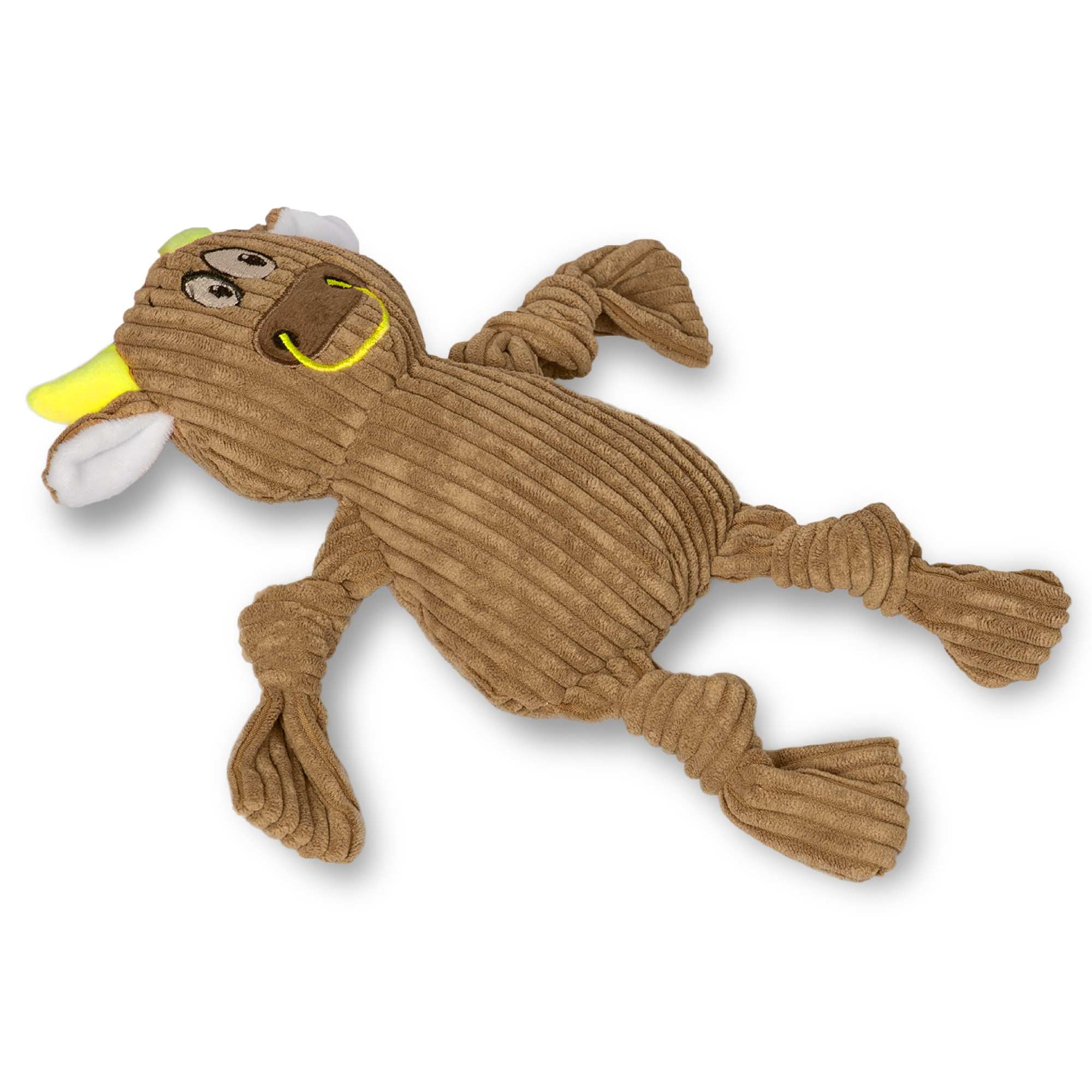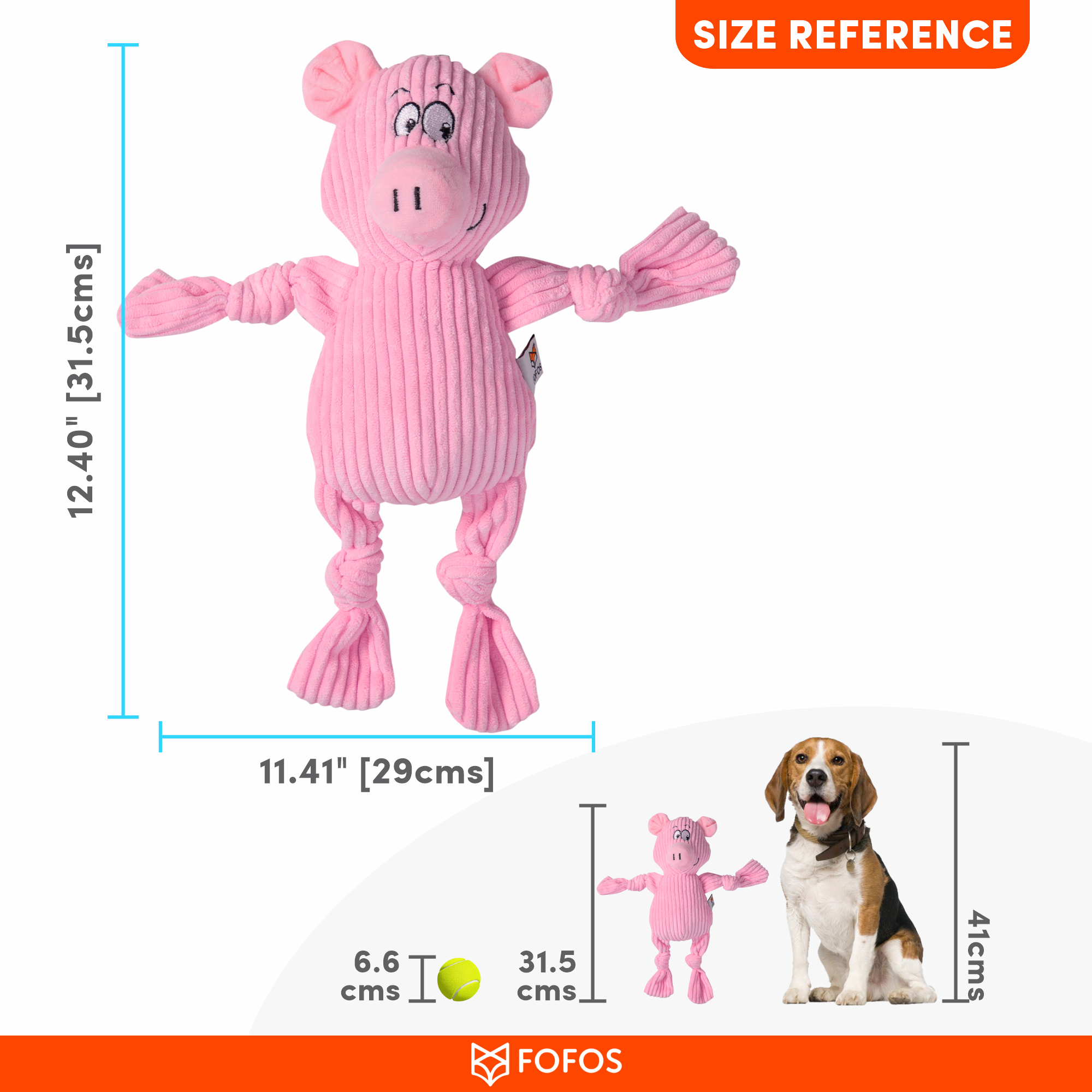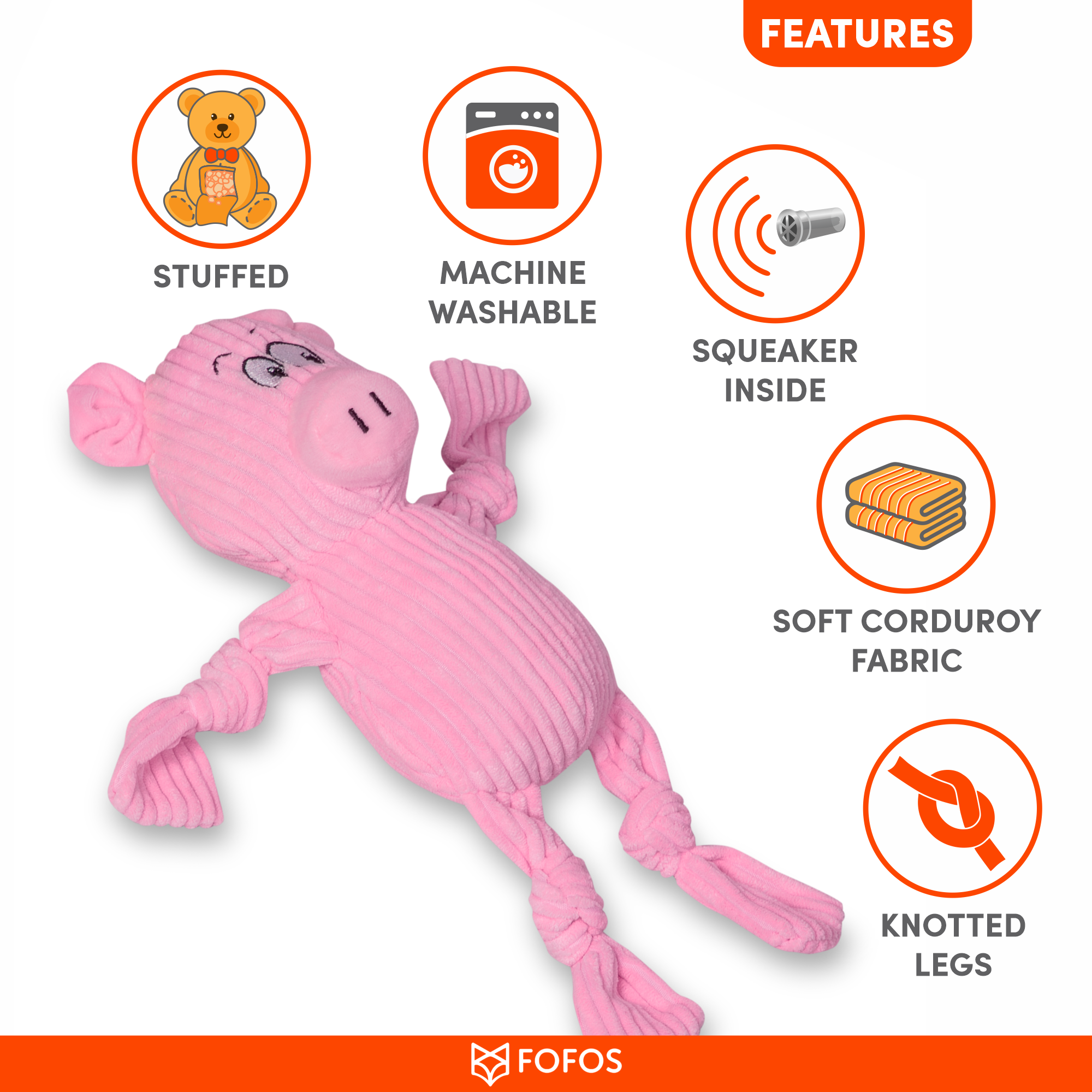 Fofos Fluffy Cow is a stuffed plush toy for dogs. This tug toy has a squeaker inside that generates a squeaky noise to make playtime engaging. It also has knotted legs which makes it perfect for games like tug of war. This dog toy is made from soft corduroy fabric and is machine washable. Interactive dog toys such as this allow your dog to chew, tug, fetch and bite on it while getting the right amount of exercise. This soft toy is ideal for x-small-small dogs (0-10kg) of various breeds such as dachshund, pom, spitz etc. These toys are recommended for dogs who like to tug, snuggle, fetch and chew mildly. Not recommended for aggressive chewers.