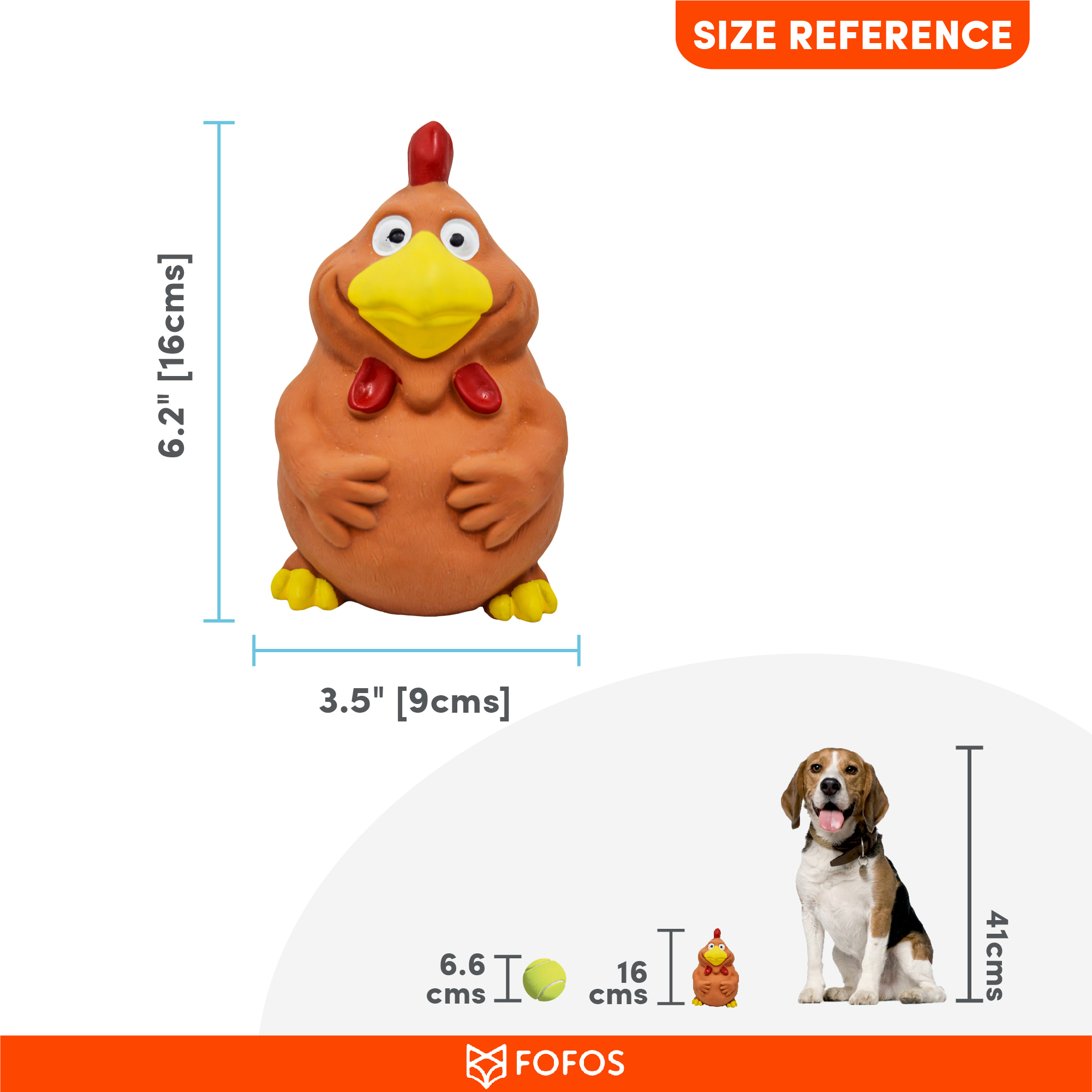 Fofos latex bi toy rooster is a dog toy with a squeaker inside that gives rise to a squeaky noise when it is head tilted. This toy is made from 100% natural latex rubber. It has a unique soft texture to it and is gentle on teeth and gums. The squeaker inside makes this toy engaging for your pet. Interactive dog toys such as this allow your dog to chew, fetch, and bite on it while getting the right amount of exercise. This squeaky toy is ideal for small-medium dogs (5-20kg) of various breeds such as dachshund, pom, spitz, etc . These toys are recommended for dogs who like to tug, snuggle, fetch and chew mildly. Not recommended for aggressive chewers.