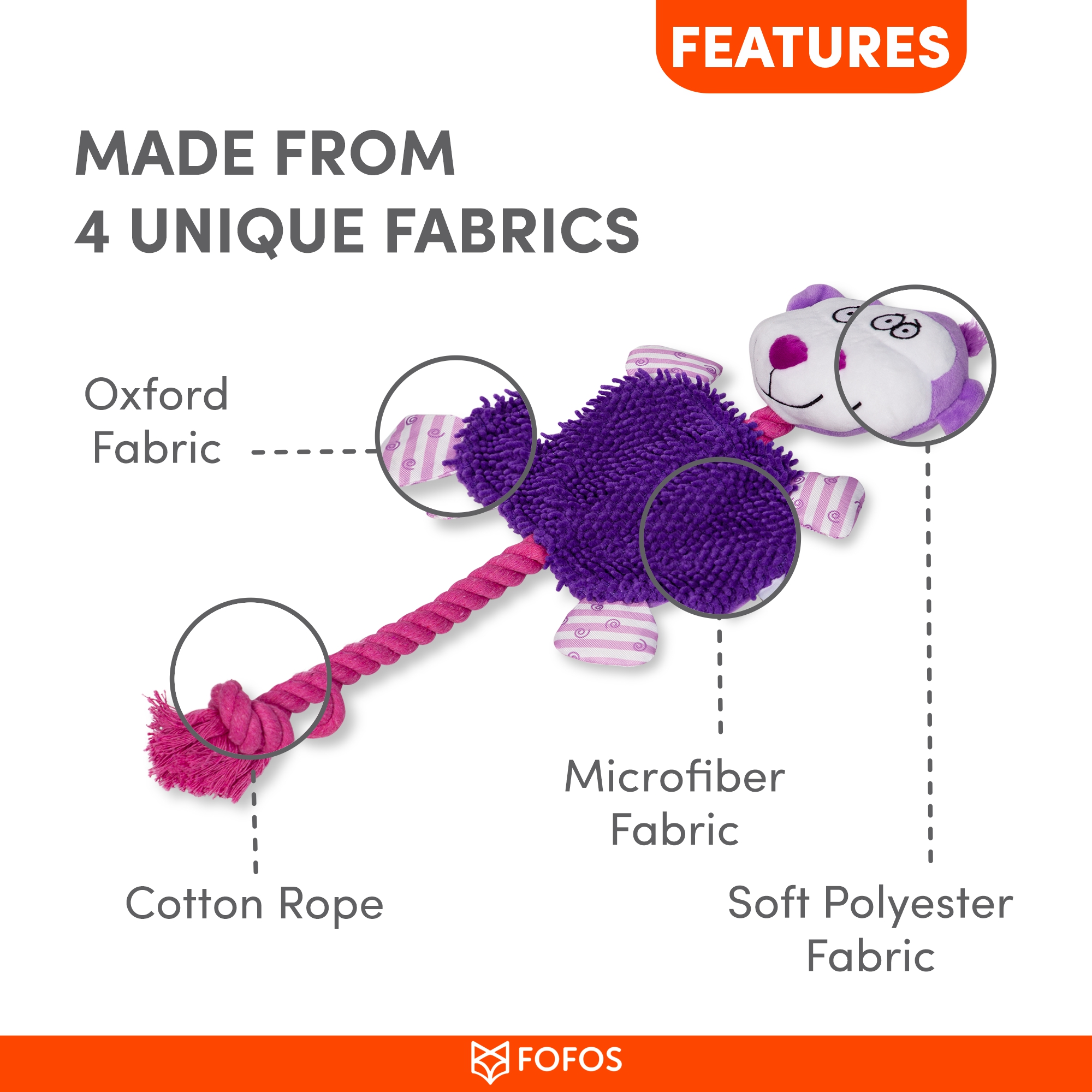 Fofos Puppy Rope Monkey is a dog toy that helps soothe teething pain in puppies while being gentle on the gums.This toy comes with minimal stuffing and is made from a combination of 4 different materials and a squeaker that makes a squeaky noise along with krinkle paper inside to make playtime interactive. This rope toy is a perfect playmate for chewers who enjoy a fun game of tug. This toy is made from soft polyester fabric + cotton rope and is machine washable. Engaging dog toys such as this allow your dog to chew, fetch, tug and bite on them while getting the right amount of exercise. This toy is ideal for small-medium puppies (5-20kg) of various breeds such as dachshund, pom, spitz, etc. Teething toys are soft and designed specifically to help soothe teething pain in puppies’ gums. It is a set of strong but not indestructible toys and is best suited for pet dogs that are teething, and have a chew, tugging, indoor fetch and cuddle playing style. Not recommended for dogs with adult teeth or aggressive chewers.
