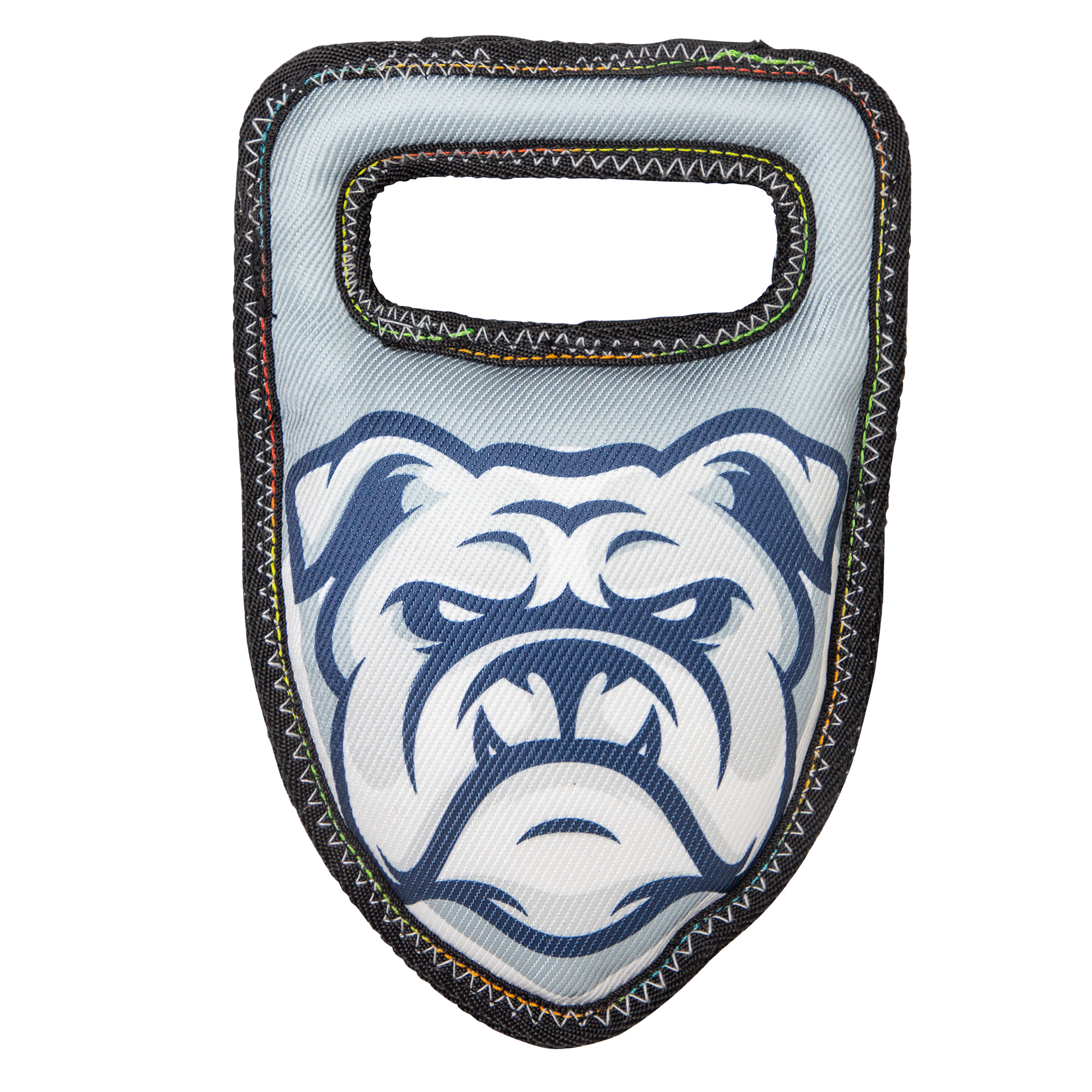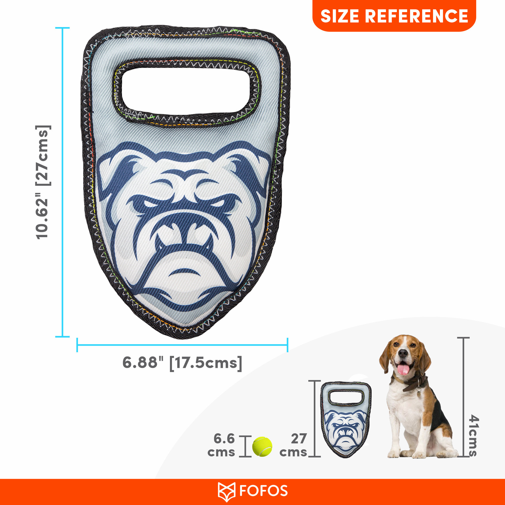 Fofos strong bulldog is a stuffed plush tug toy with reinforced seams to increase resistance.This dog toy has a squeaker inside that makes a squeaky noise every time your pet interacts with it and also helps clean the teeth and gums. It is made from a combination of strong fabric + TPR. Interactive dog toys such as this allow your dog to chew, fetch tug, and bite on it while getting the right amount of exercise. This soft toy is ideal for medium-large dogs (10-30kg) of various breeds such as dachshund, pom, labrador, st. Bernard etc . This toy is strong but not indestructible and is best suited for pet dogs that have aggressive chewing, fetching and tug playing styles. Not recommended for aggressive chewers.
