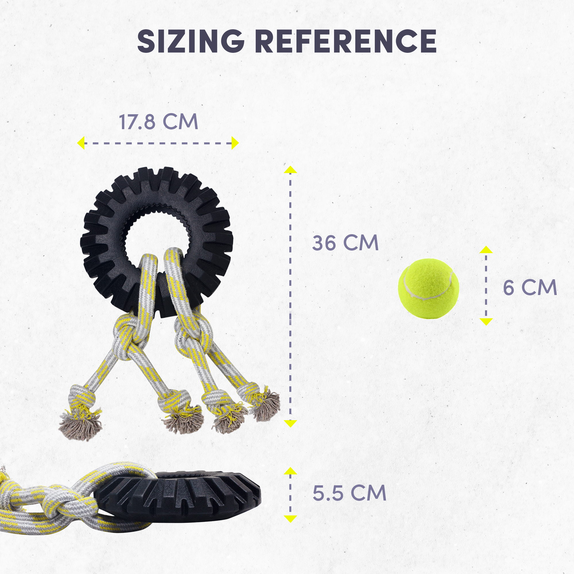 Fofos tyre large rope toy is a durable super chewer dog toy that is long-lasting and is best suited for most aggressive chewers. The tough rubber tyre shape is strategically designed for fun games of fetch and tug and also promotes independent play in dogs. This chew toy is treat-dispensing and can hold treats, peanut butter, dahi etc and helps keep your dog engaged. It is made from high-density TPR material and a durable cotton rope. Interactive dog toys such as this allow your puppy to chew, fetch tug, and bite on it while getting the right amount of exercise. This toy is ideal for large-X-Large dogs (20-40kg) of various breeds such as st bernards, labradors, german shepherds, rottweilers, mastiffs etc. This super chew toy is strong and durable but not indestructible and is best suited for pet dogs that have aggressive chewing, fetching and tug playing styles. Recommended for most aggressive chewers.