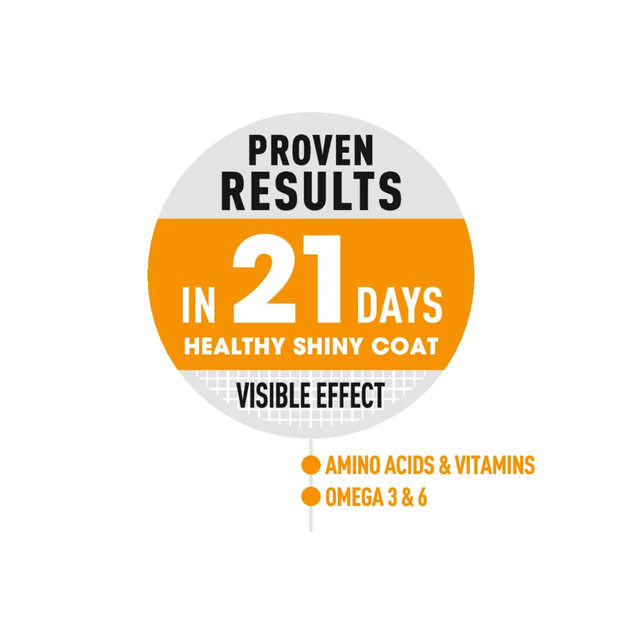 Proven results / in 21 days / healthy shiny coat / visible effect / amino acids & vitamins /omega 3 & 6 : Proven results: the exclusive use of Hair And Skin Care brings a significant improvement in coat shine after 21 days*. *Royal Canin internal study, 200
