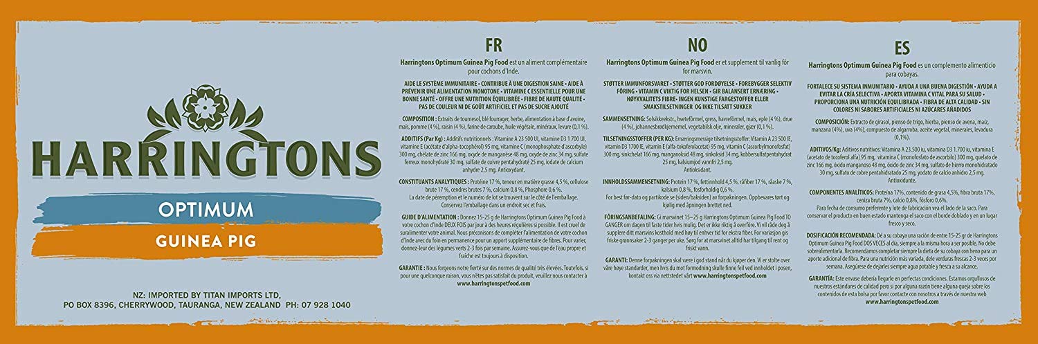 | Harringtons Optimum Guinea Pig Food is specially formulated to provide a balanced, all-in-one nugget that helps avoid selective feeding and enriches your pet’s diet. With added vitamin C in a protected form, along with essential vitamins and minerals, this food is promotes wound healing and overall development of your Guinea Pig Give your guinea pig the nutrition they deserve for a long and healthy life with Harringtons Optimum Guinea Pig Food! |