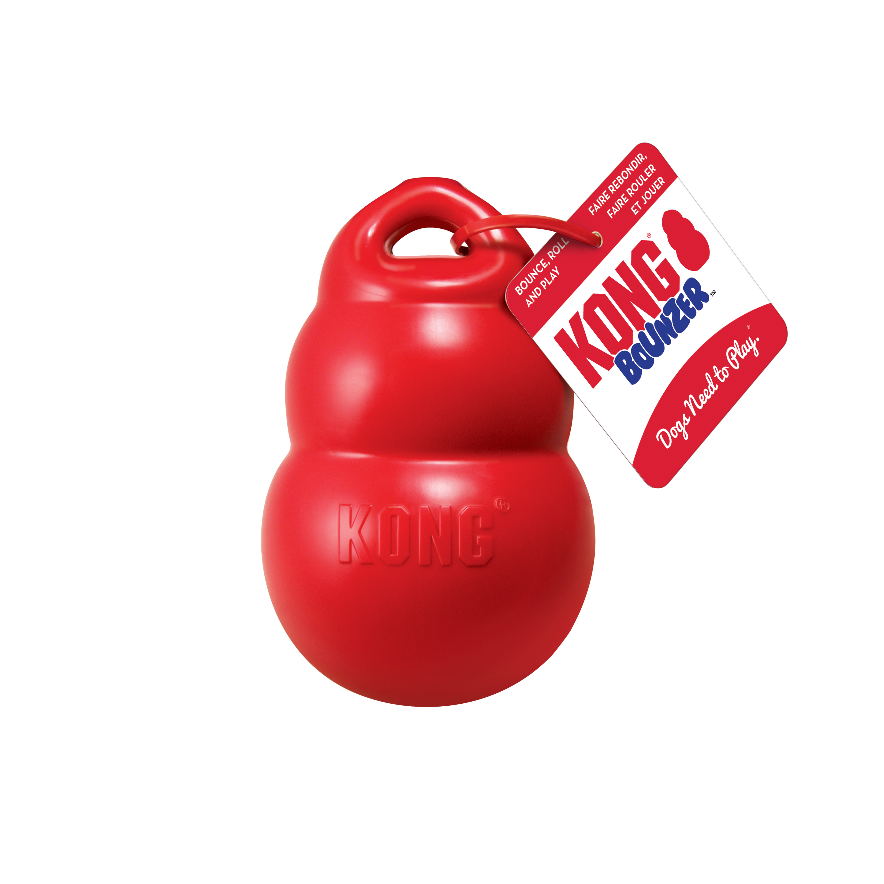 Dogs will go crazy for the KONG Bounzer™! Made in the over-sized classic KONG silhouette, The lighter material makes for a fun game of fetch and retrieve. The Bounzer™ compresses when grabbed by the dog, releasing air from the toy, which encourages self play. And, it bounces right back to its original shape. The top handle makes tossing even easier. Dogs will love to bounce, roll and play with these oversized, KONG-shaped toys!