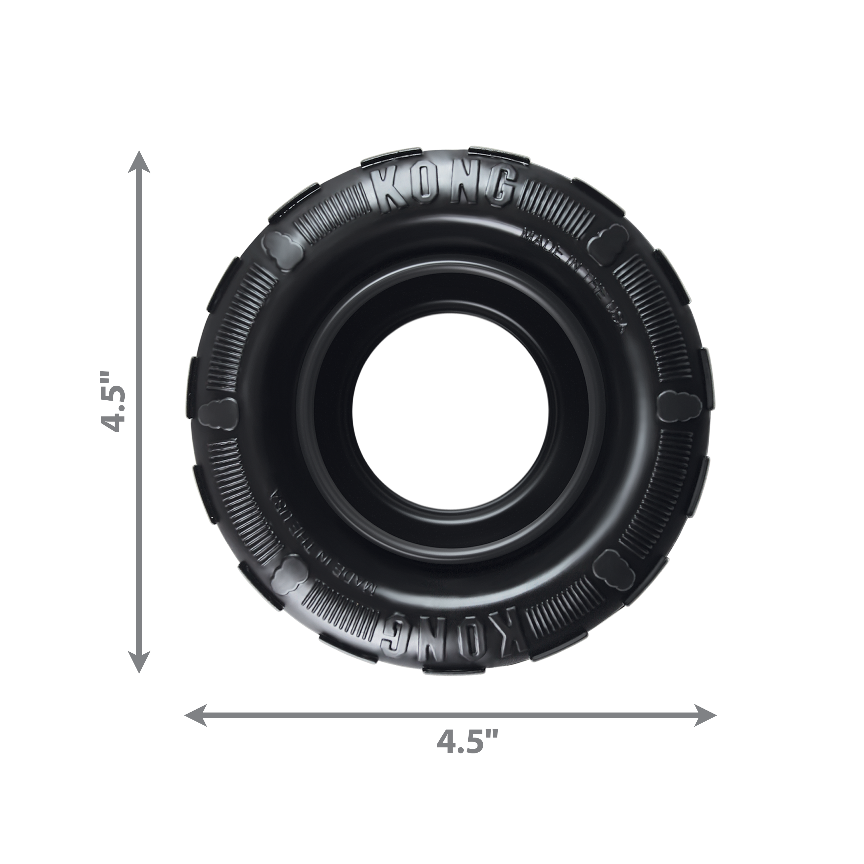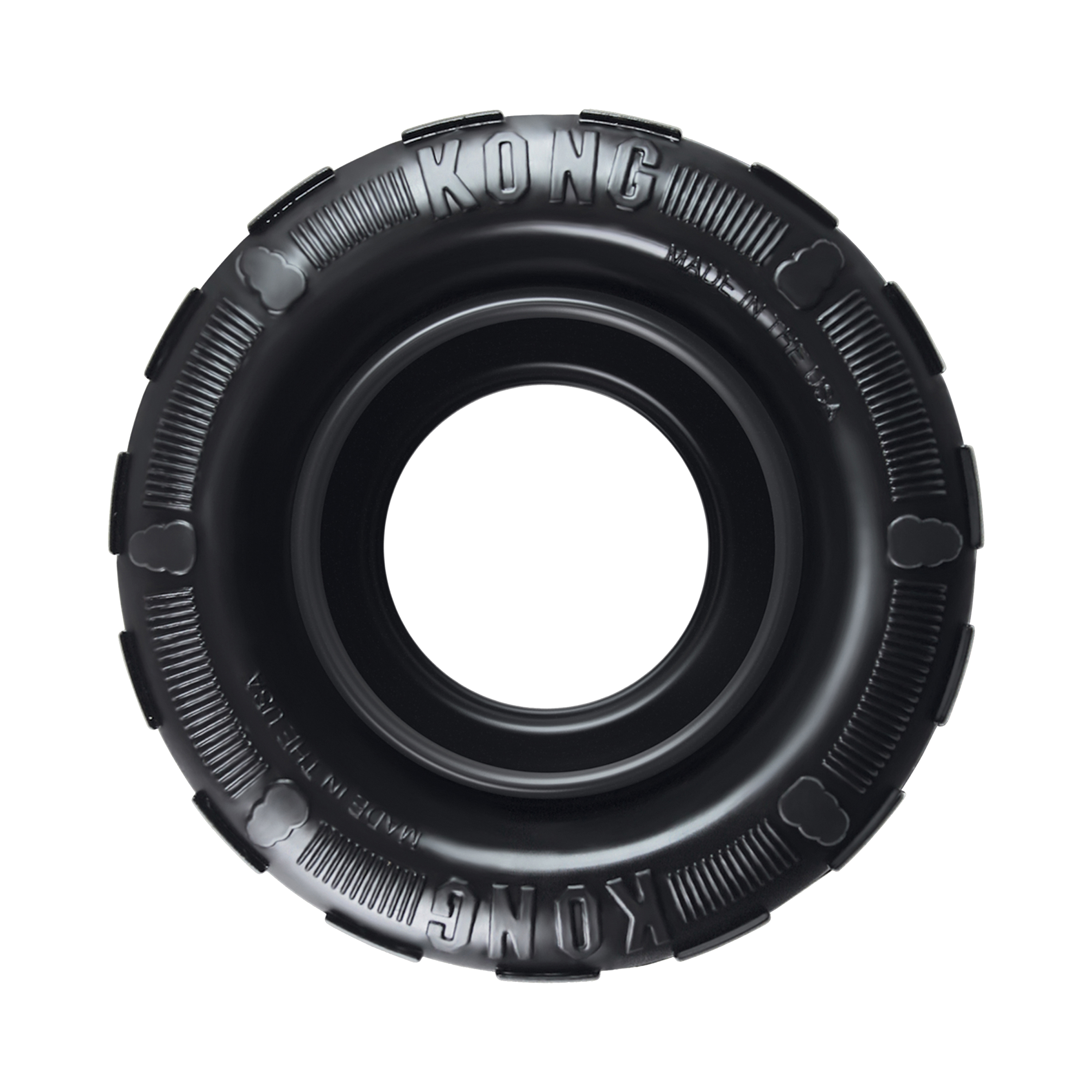 KONG Tires is a durable tire chew designed to provide the ultimate chewing experience. The uniquely shaped sidewalls and thick outer tread create a super durable, elastic barrier. The sidewalls are designed to double up and rebound when compressed to provide an active chewing experience, and the Tires are perfect for bouncy games of fetch.