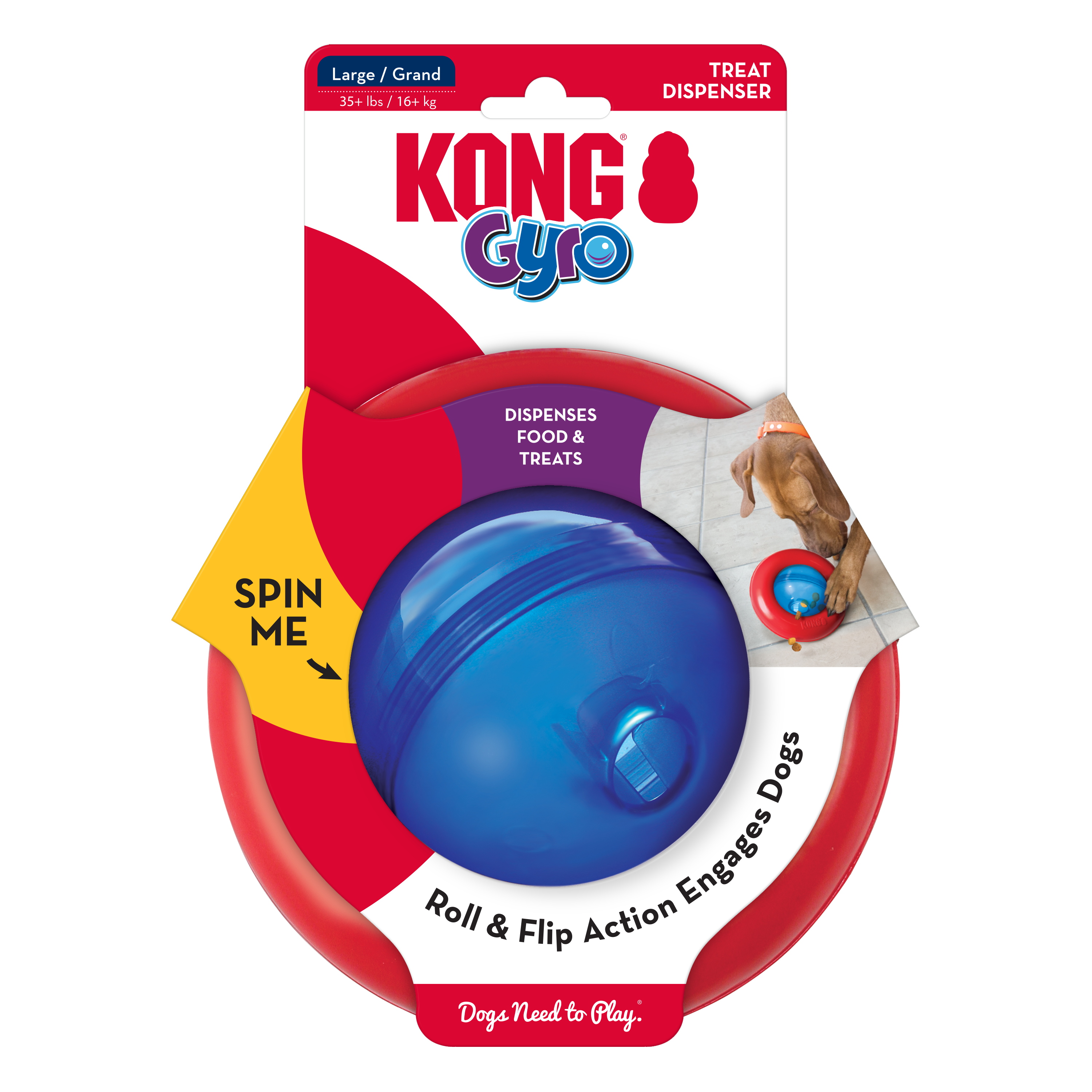 | The KONG Gyro is sure to entertain with irresistible roll and flip action keeping dogs enticed and intrigued. With the center spinning orb and static outer ring, this dynamic toy encourages dogs to push, paw and roll the GYRO, delightfully dispensing tasty treat rewards along the way. Ideal for independent play, stuff with snacks or kibble for added fun and extended playtime. |
