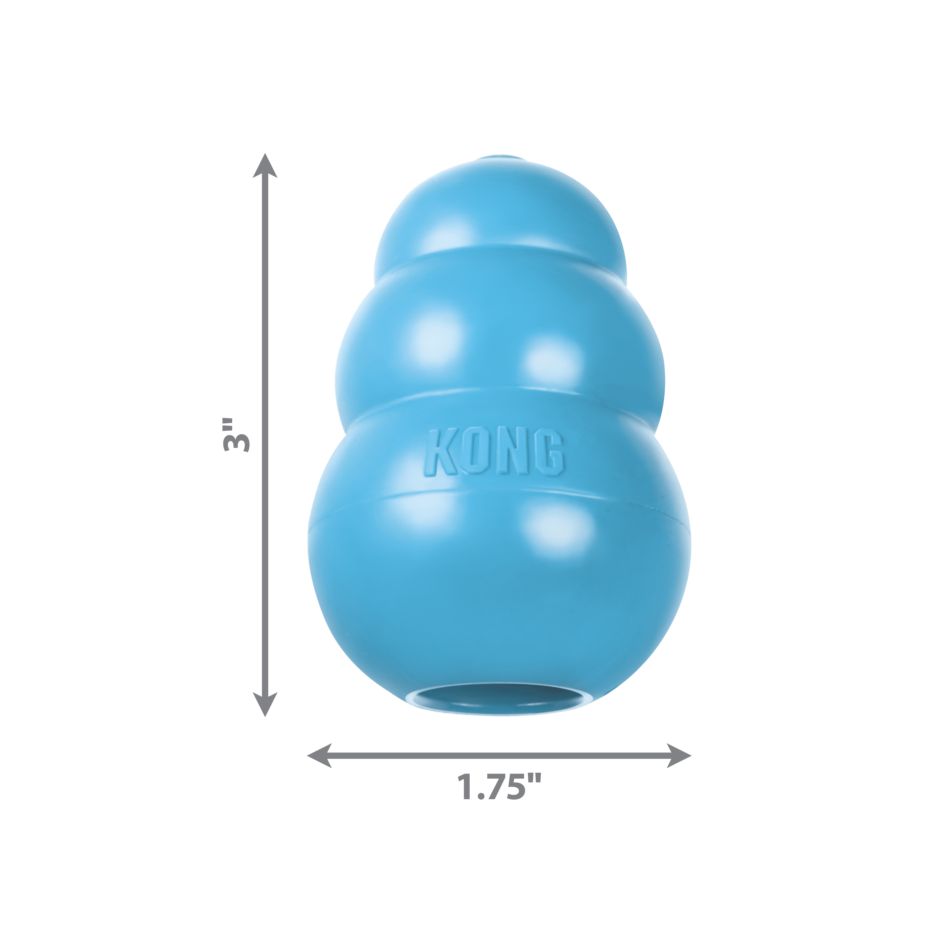 | The Puppy KONG dog toy is customized for a growing puppy’s baby teeth, the unique, natural rubber formula is the most gentle within the KONG rubber toy line. Designed to meet the needs of a puppy’s 28-baby teeth, it helps teach appropriate chewing behavior while offering enrichment and satisfying a younger pup’s instinctual needs while the erratic bounce make it ideal for those pups that just want to play. A stuffed Puppy KONG occupies busy little ones while allowing pet parents the freedom to attend to their unique needs. Want to make crate training easier or extend play time? Be sure to stuff with puppy kibble and a dash of peanut butter. |