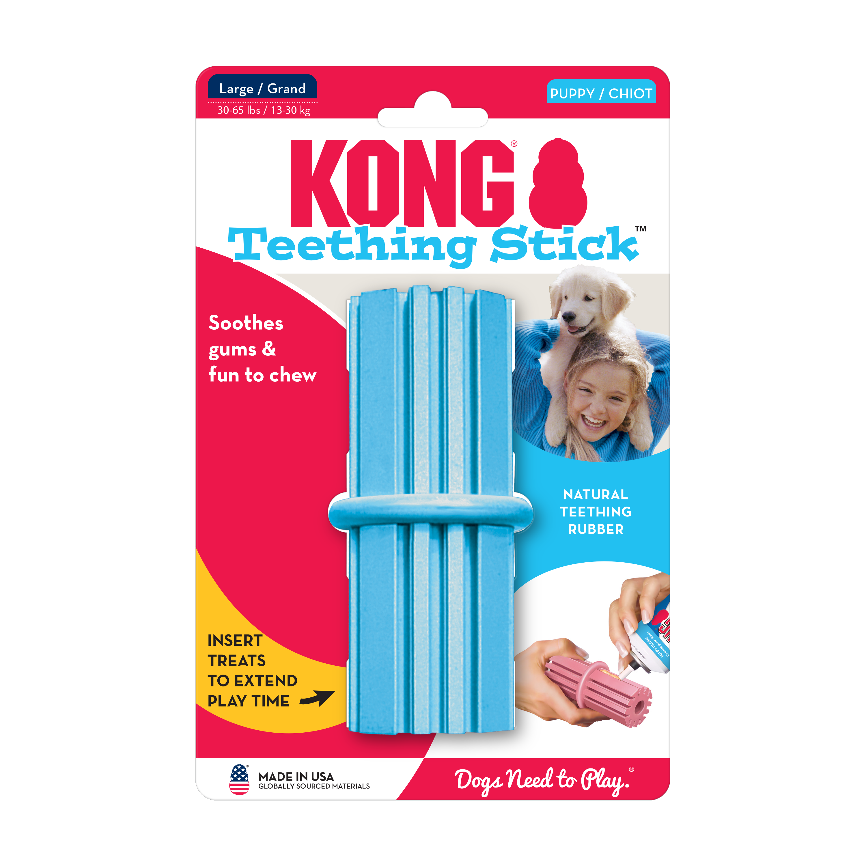 | The KONG Puppy Teething Stick is made with unique KONG Classic puppy rubber. The ridges gently clean teeth and soothe sore gums when chewed. Fill them with Easy Treat or Peanut Butter to encourage long-lasting play sessions. Playing with the Puppy Teething Stick helps teach puppies appropriate chewing behavior. Use with puppies until they reach 9 months, then they can graduate to KONG Classic Rubber toys. |