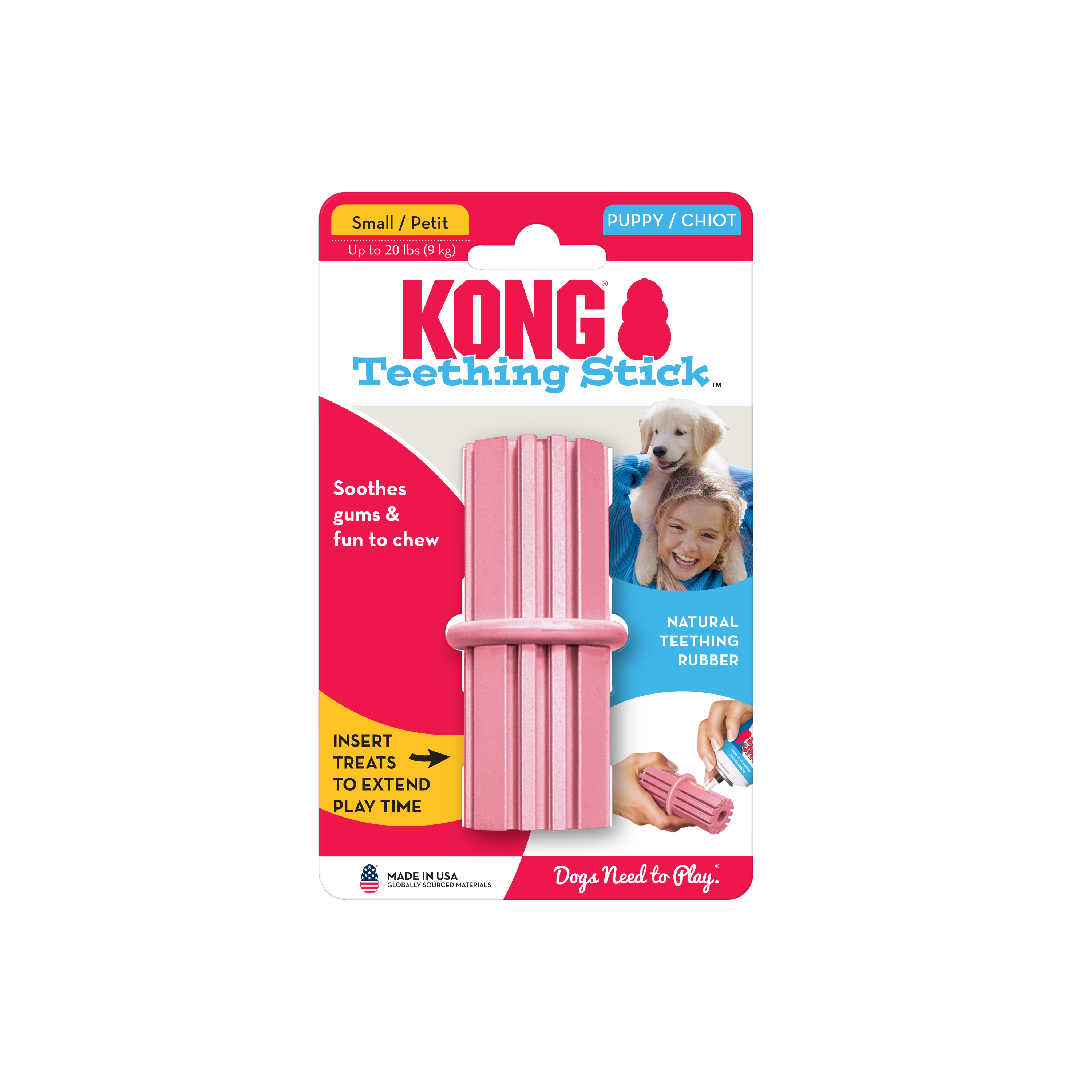 | The KONG Puppy Teething Stick is made with unique KONG Classic puppy rubber. The ridges gently clean teeth and soothe sore gums when chewed. Fill them with Easy Treat or Peanut Butter to encourage long-lasting play sessions. Playing with the Puppy Teething Stick helps teach puppies appropriate chewing behavior. Use with puppies until they reach 9 months, then they can graduate to KONG Classic Rubber toys. |
