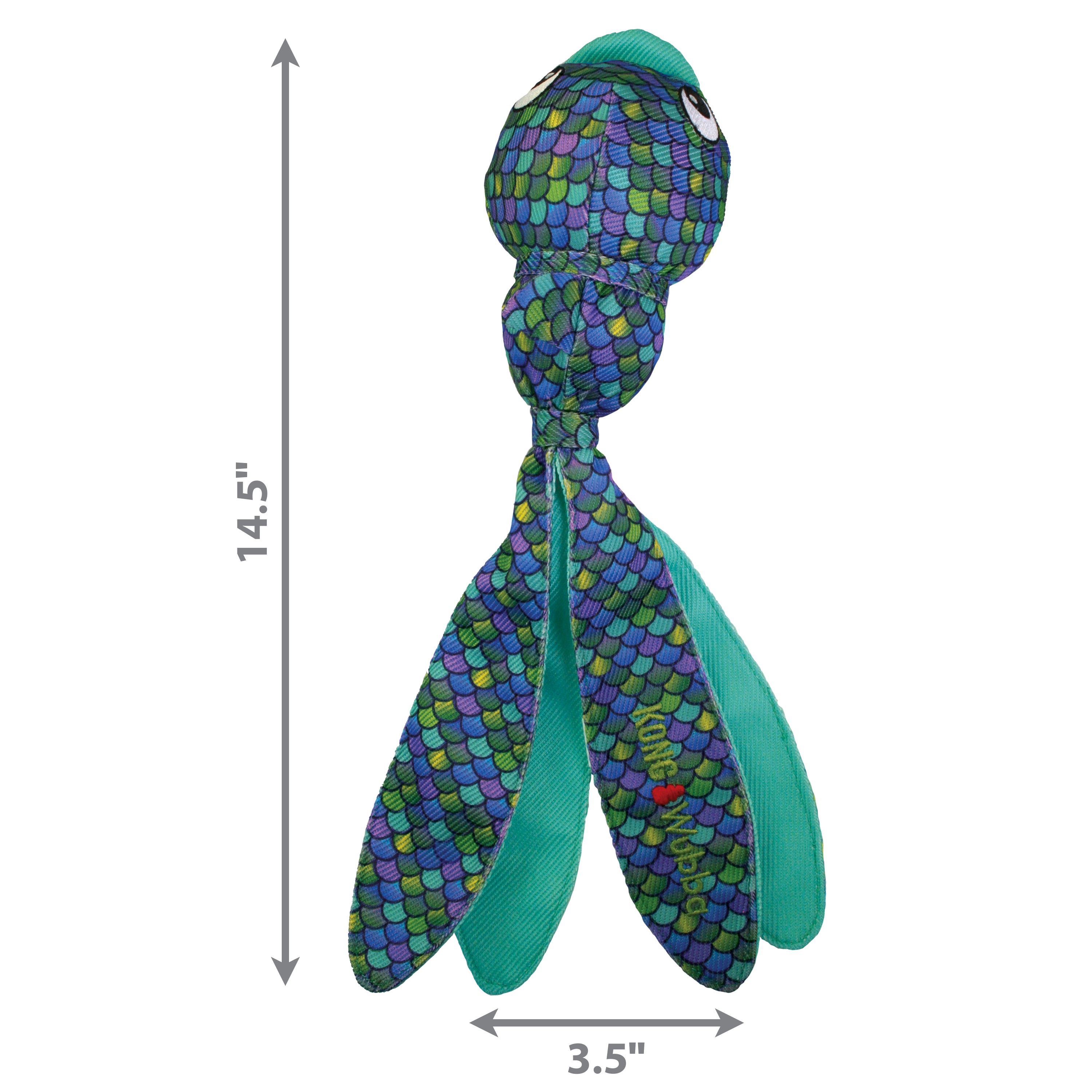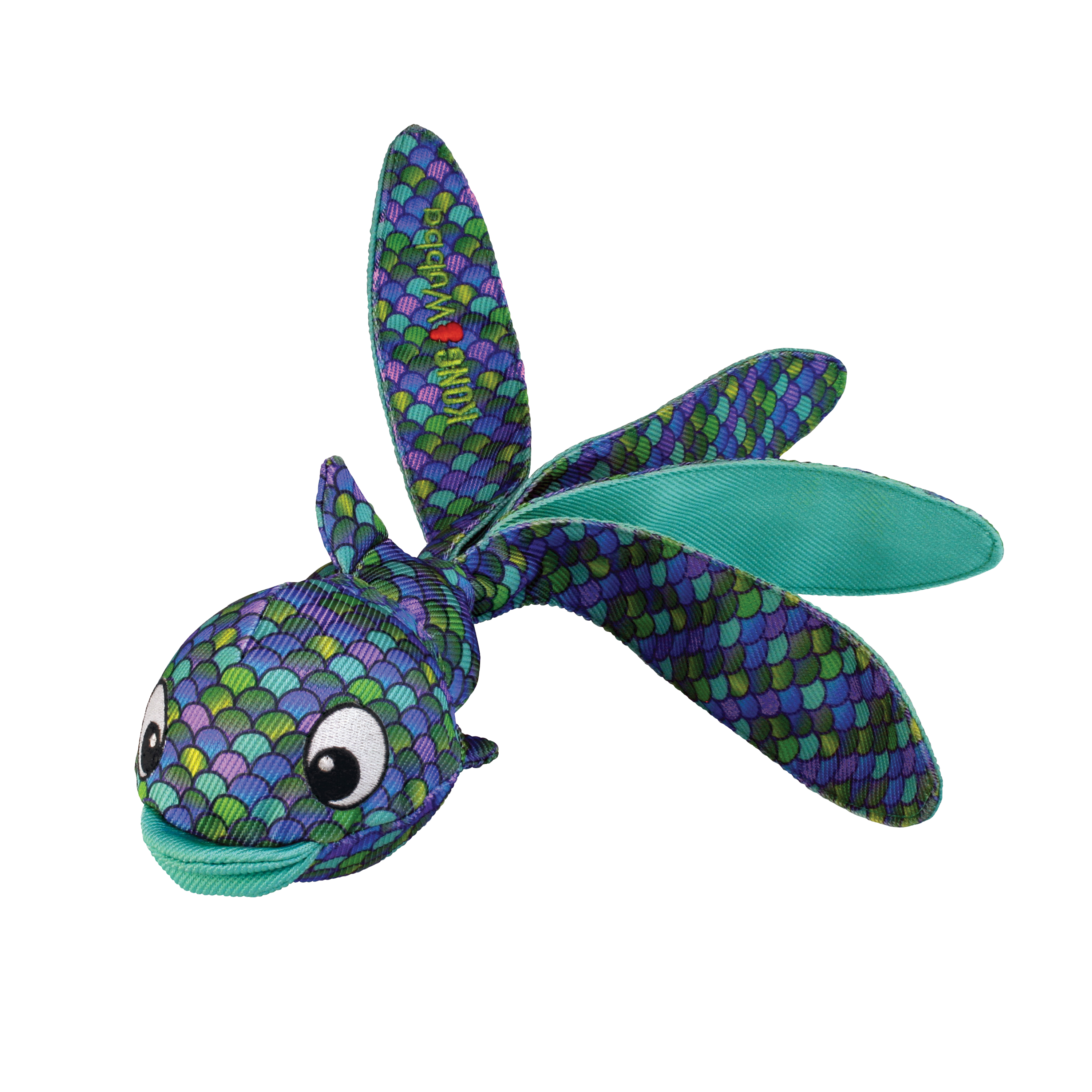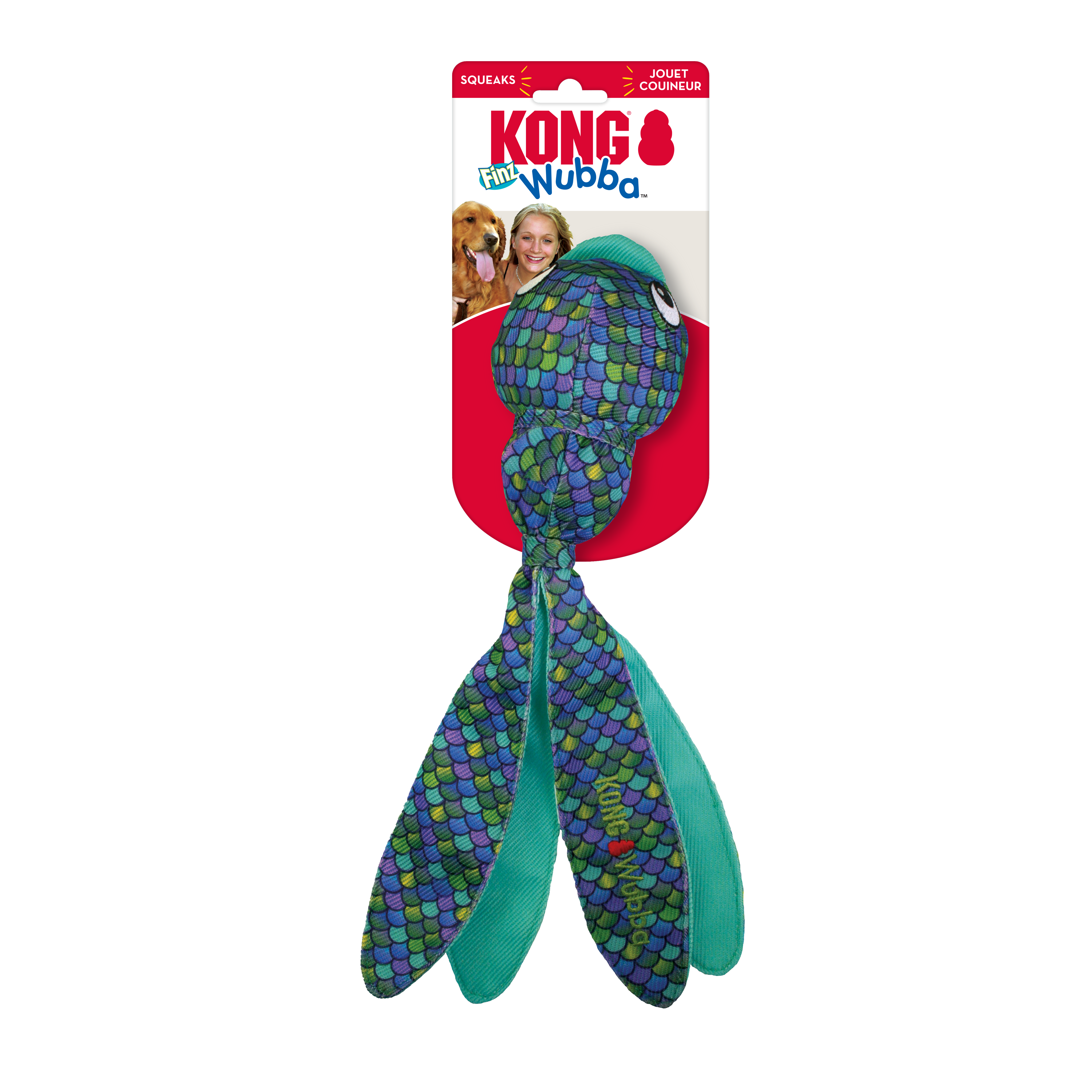 | The new KONG Wubba Finz has long floppy tails that make it easy for tugging and super fun for your dog to shake, satisfying natural thrashing instincts. Two balls inside help KONG Wubba Finz bounce and squeak, extending games of catch and release for tons of healthy, active play. This flying fish is made to soar through the air and launch your dog into a fetching frenzy! |