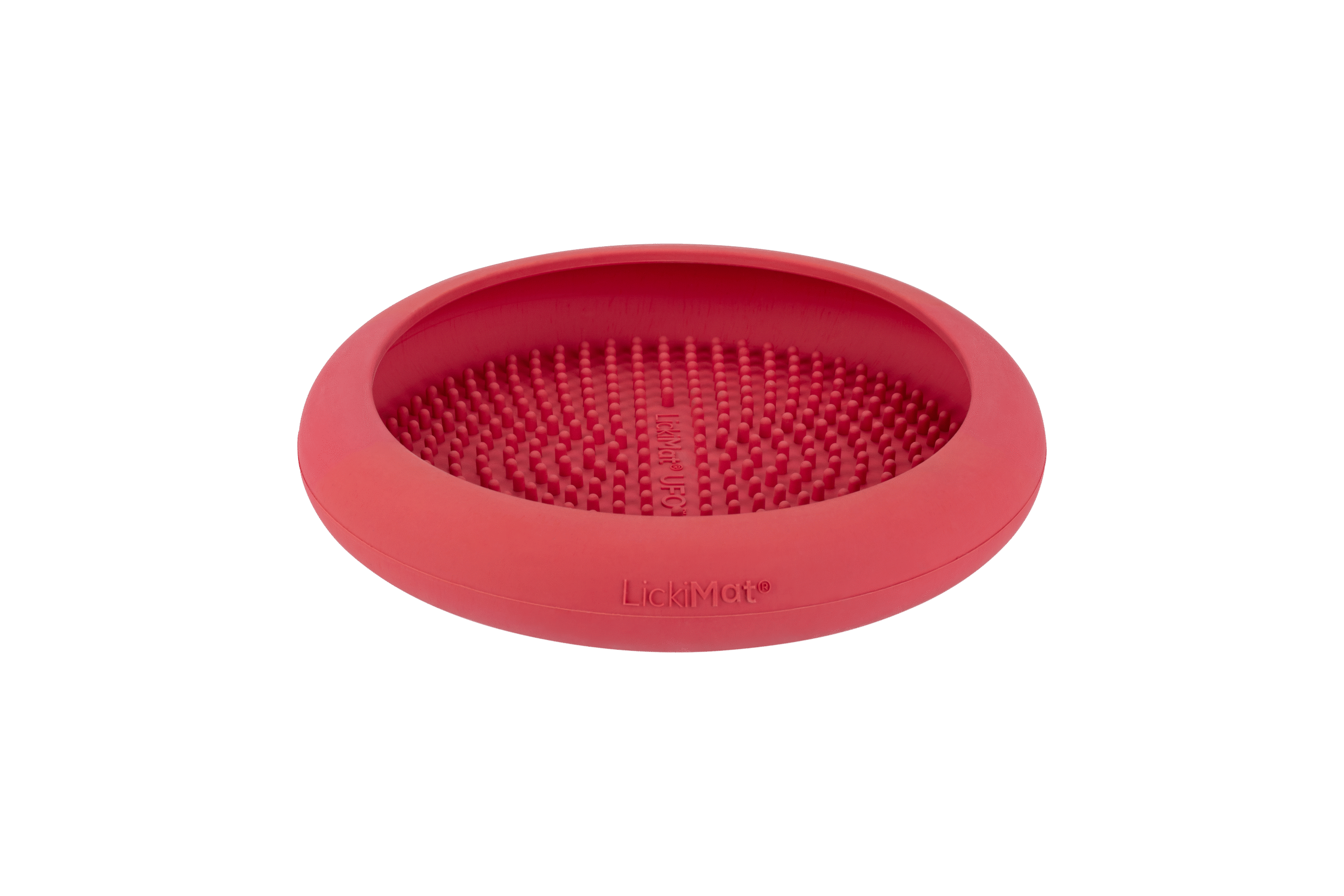 | LickiMat® UFO™ Slow Feed is an anti-anxiety dog food and treat bowl, designed with soother nubs to help pets relax when licking. This rubber bowl features suction cups on the base to stick to a smooth surface vertically (Eg: windows, shower walls) to change the positioning of the bowl for entertainment, and anxiety relief. |