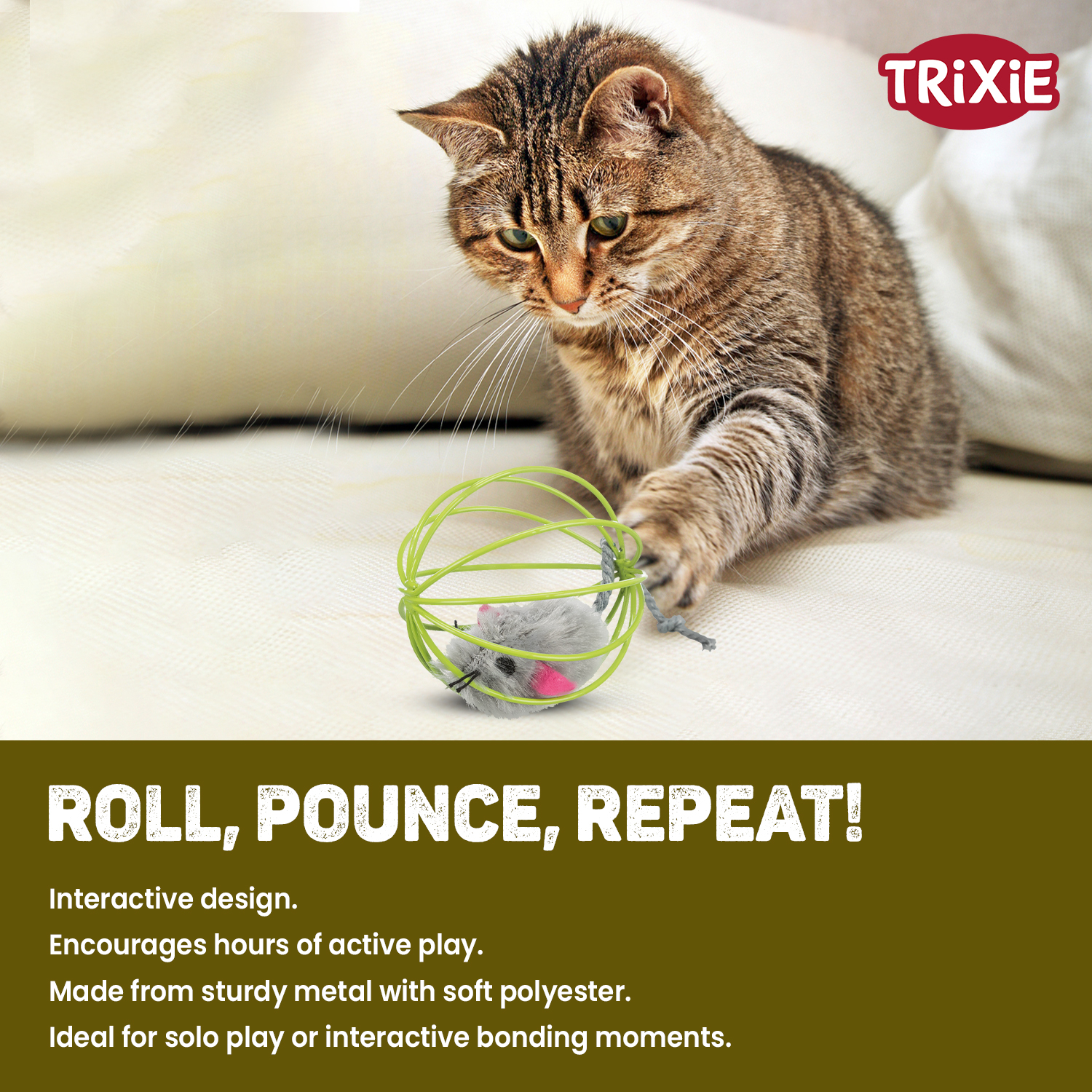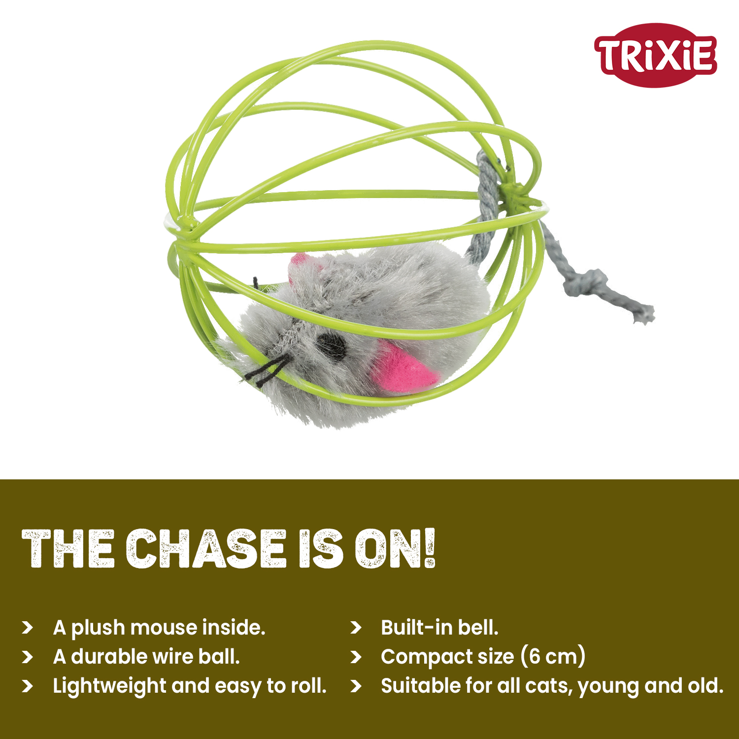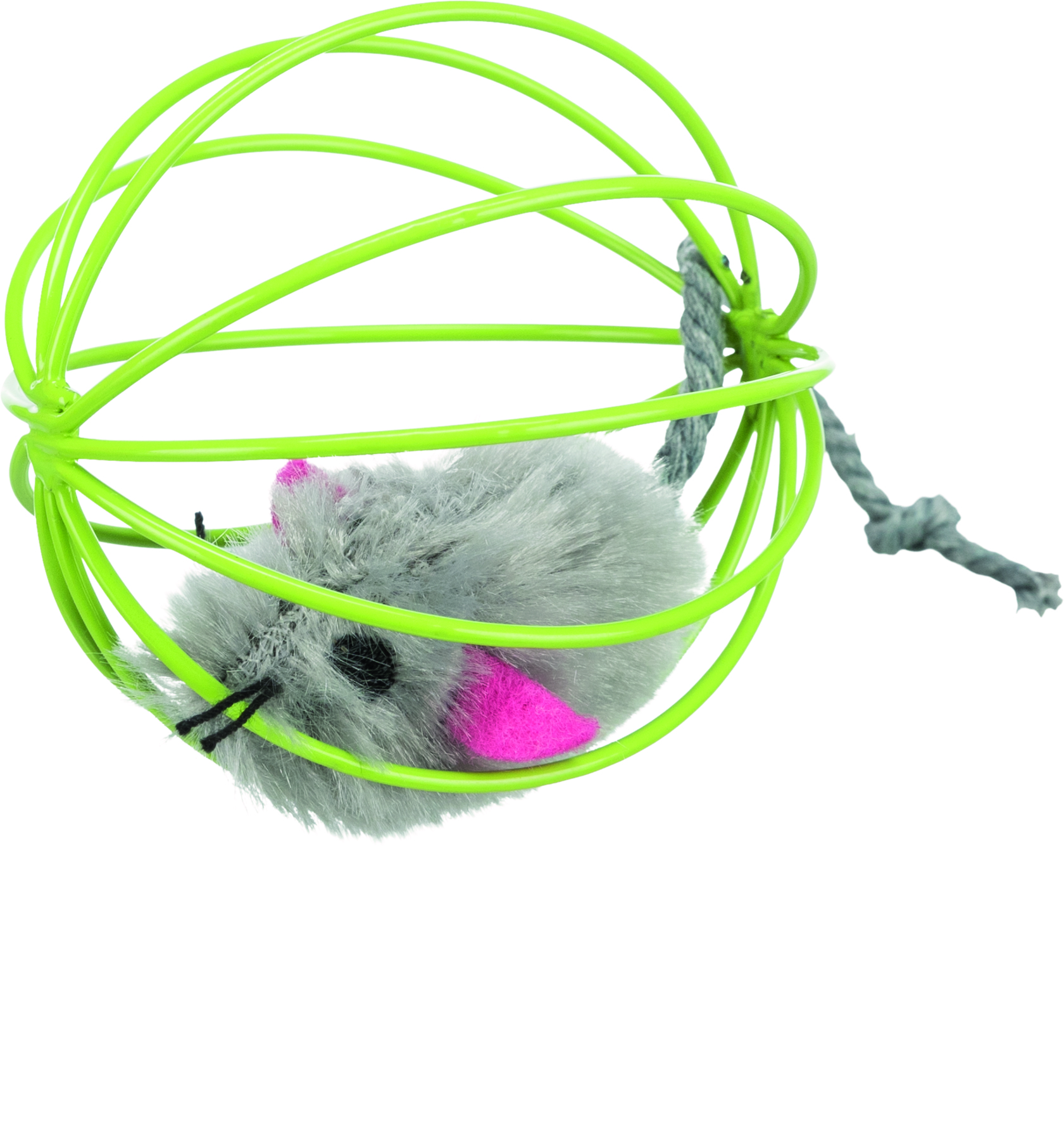 A mouse encased in a wire ball – rolls, jingles, and keeps cats curious.