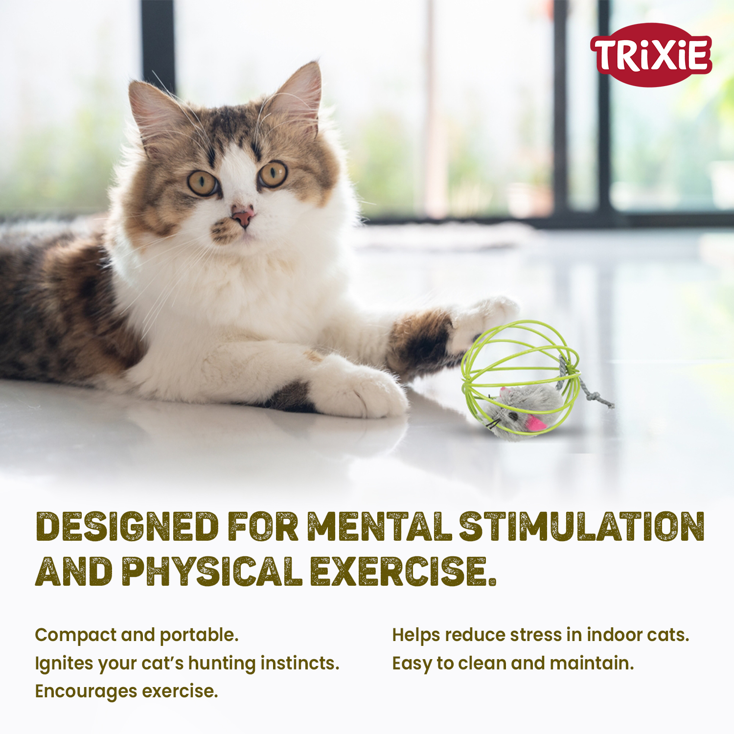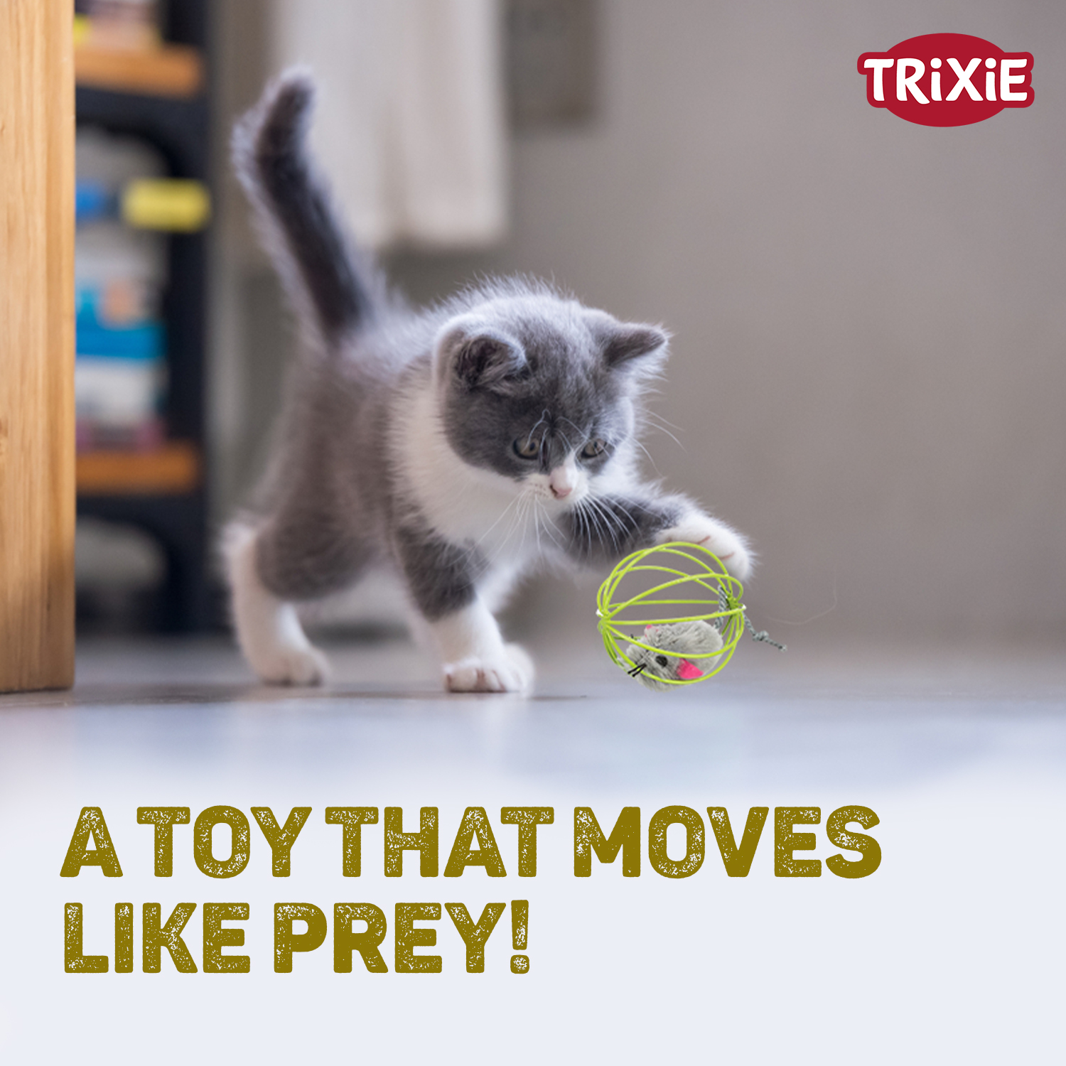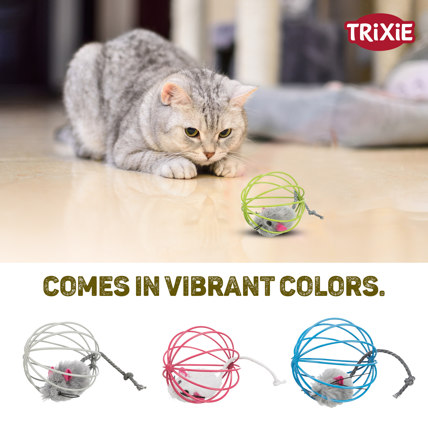 A mouse encased in a wire ball – rolls, jingles, and keeps cats curious.