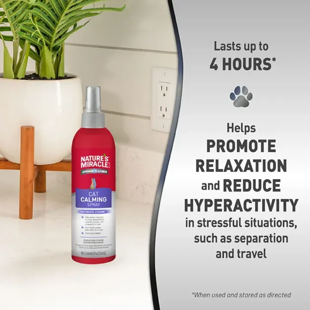 | Nature’s Miracle Cat Calming Spray, a soothing potion that conjures relaxation and banishes hyperactivity, easing stress within minutes. Ideal for travel or routine changes and is safe for pets and your home. |