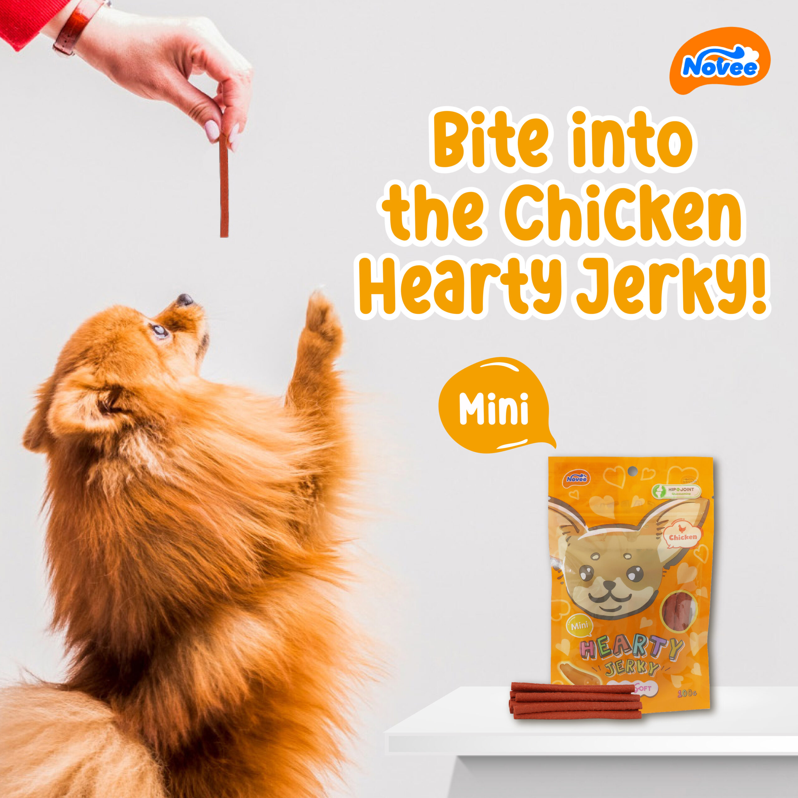 Novee Hearty Jerky Mini in Chicken Flavour delivers small, chewy bites of real chicken that are perfect for training or rewarding your dog. Soft in texture yet packed with protein, these mini treats are ideal for puppies and small breeds.