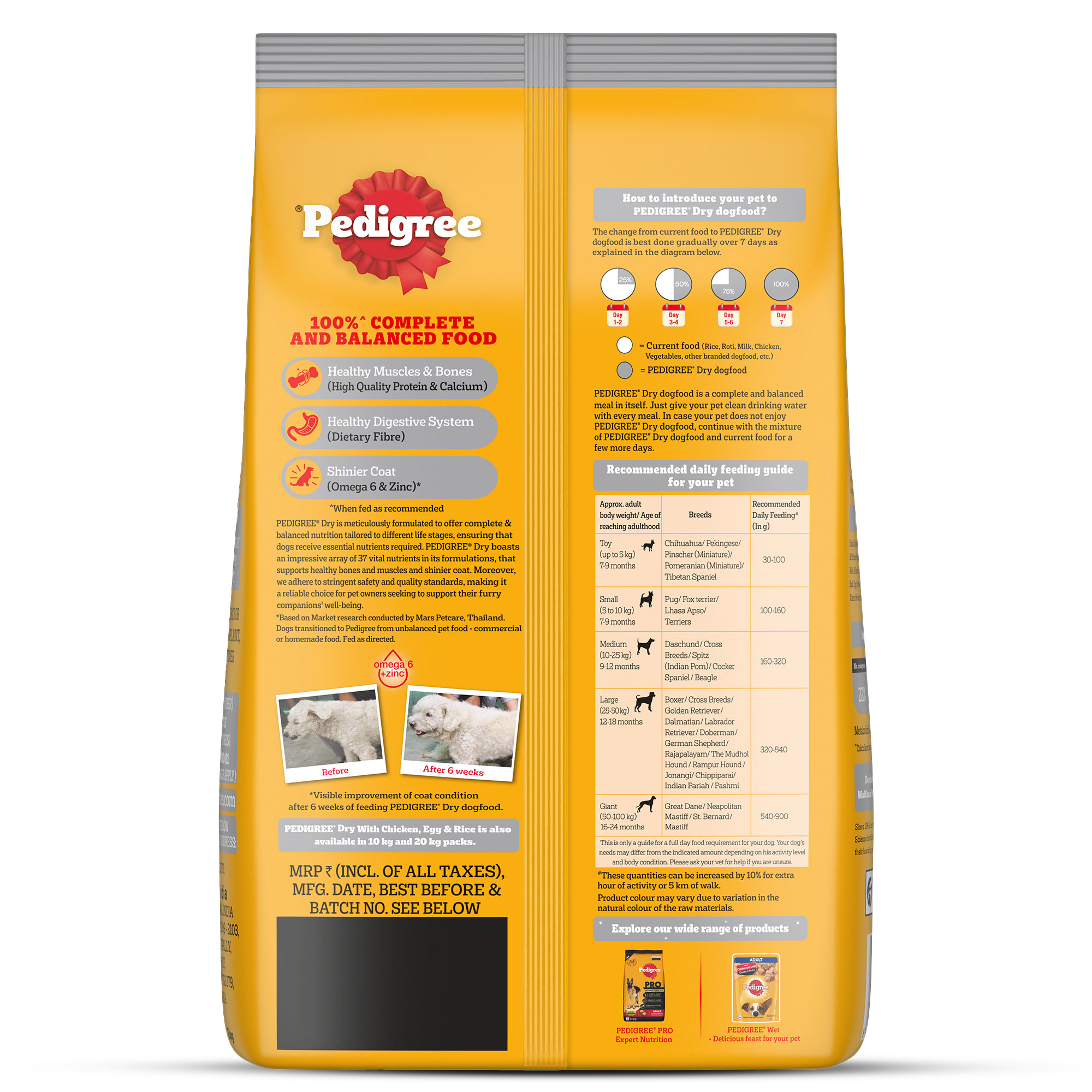 Pedigree provides 100% complete and balanced food for dogs to support their well-being. Pedigree Adult Dry Dog Food, Chicken, Egg & Rice, is a wholesome meal containing 37 essential nutrients. The goodness of quality ingredients, including chicken, egg and rice, blends into a tasty and nutritious diet for your furry friend. This adult dog food is developed with experts. When fed as recommended (refer to the back of the pack for feeding guidelines), this dry dog food supports healthy muscles & bones (High Quality Protein & Calcium), a healthy digestive system (Dietary Fibre) and a shinier coat (Omega 6 & Zinc). At Pedigree, recipes are developed based on research from the Waltham Centre for Pet Nutrition. Every product from Pedigree meets the requirements laid down by NRC 2006 of the U.S. National Academy of Science. Give your furry companion healthy and lip-smacking mealtimes with Pedigree.