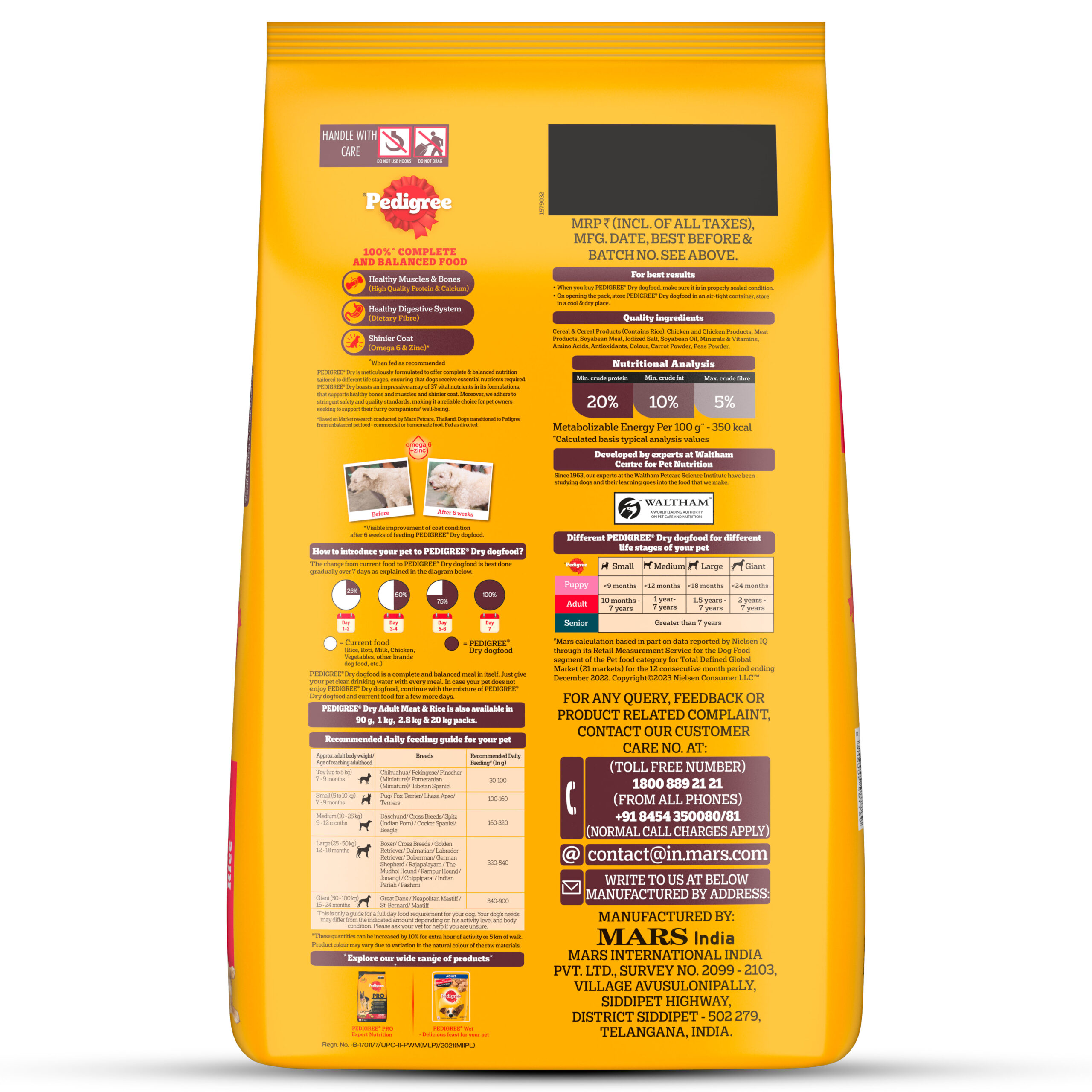 Pedigree provides 100% complete and balanced food for dogs to support their well-being. Pedigree Adult Dry Dog, Meat & Rice, Food is a wholesome meal containing 37 essential nutrients. The goodness of quality ingredients, including meat and rice, blends into a tasty and nutritious diet for your furry friend. This adult dog food is developed with experts. When fed as recommended (refer to the back of the pack for feeding guidelines), this dry dog food supports healthy muscles & bones (High Quality Protein & Calcium), a healthy digestive system (Dietary Fibre) and a shinier coat (Omega 6 & Zinc). At Pedigree, recipes are developed based on research from the Waltham Centre for Pet Nutrition. Every product from Pedigree meets the requirements laid down by NRC 2006 of the U.S. National Academy of Science. Give your furry companion healthy and lip-smacking mealtimes with Pedigree.