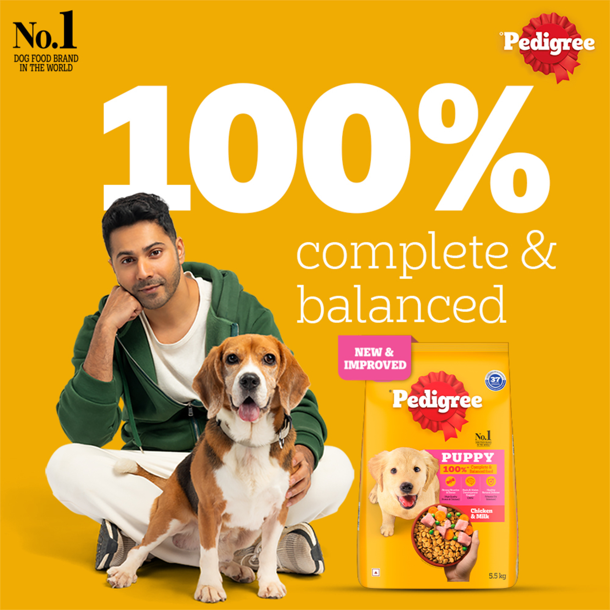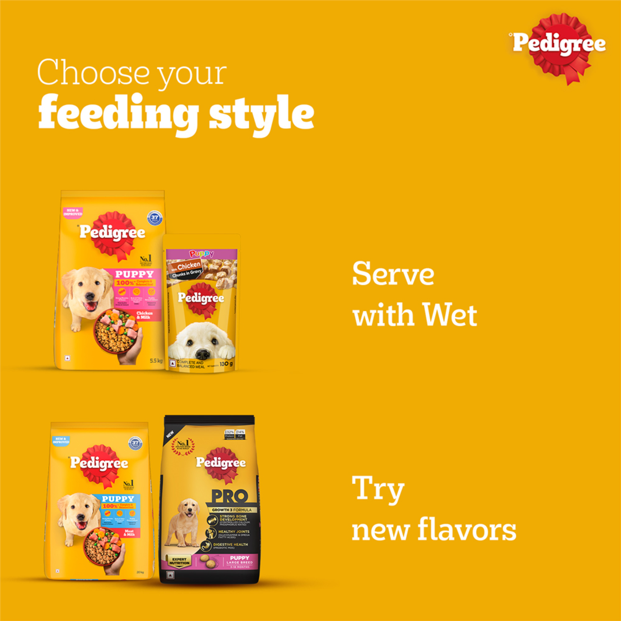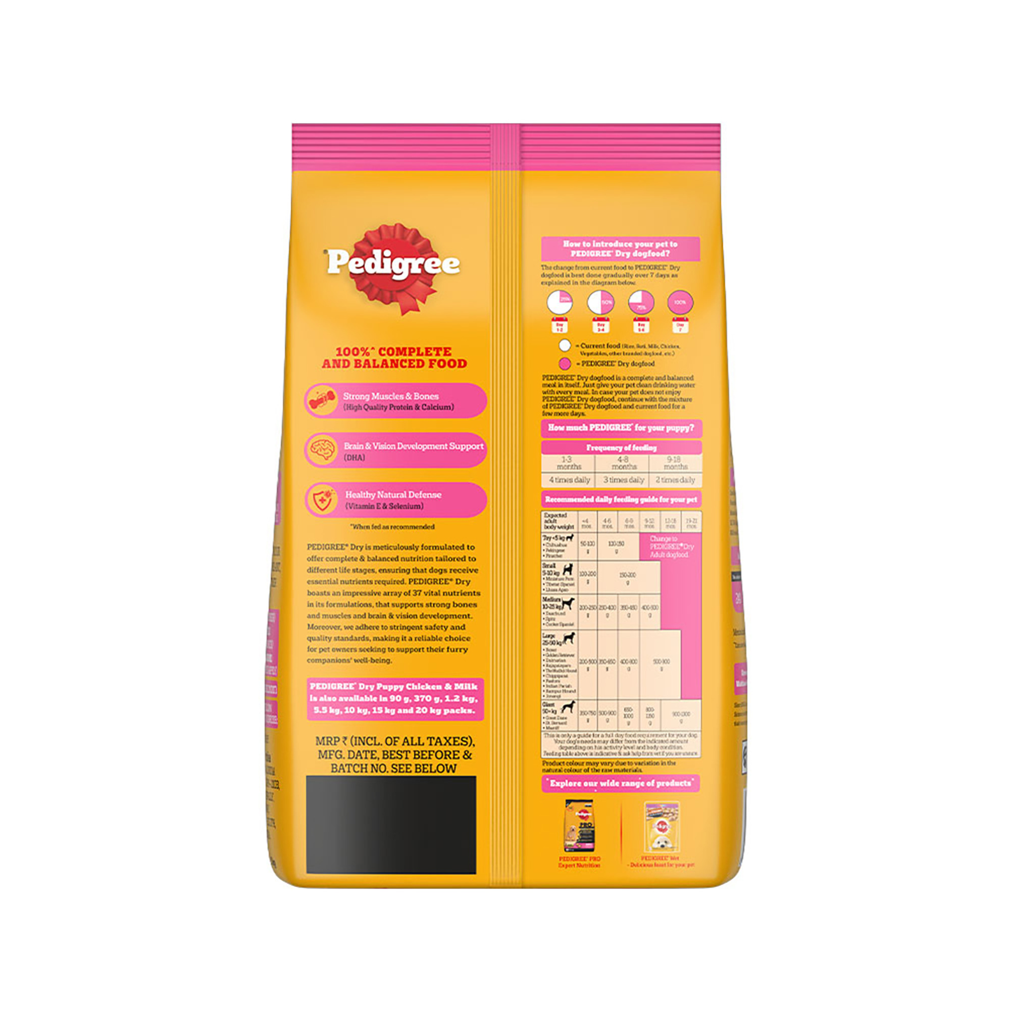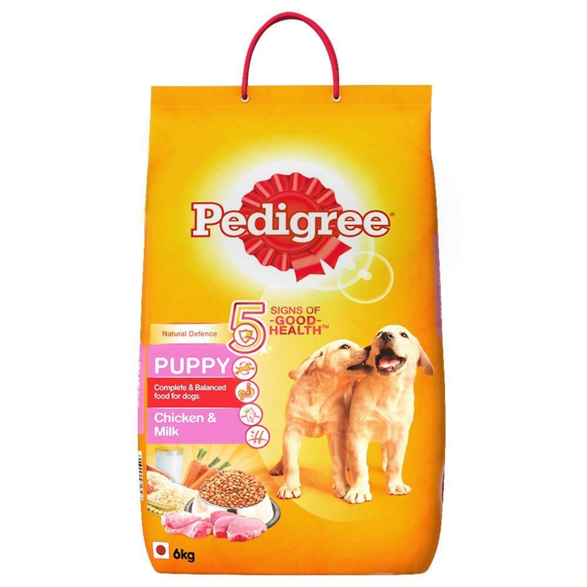 Pedigree provides 100% complete and balanced dog food for puppies to support their well-being. Pedigree Puppy Dry Dog Food, Chicken & Milk, is a wholesome meal containing 37 essential nutrients. The goodness of quality ingredients, including chicken and milk, blends into a tasty and nutritious diet for your little furry friend. This puppy dog food is developed with experts. When fed as recommended (refer to the back of the pack for feeding guidelines), this dry dog food supports strong muscles & bones (High Quality Protein & Calcium), brain & vision development (DHA) and healthy natural defense (Vitamin E & Selenium). At Pedigree, recipes are developed based on research from the Waltham Centre for Pet Nutrition. Every product from Pedigree meets the requirements laid down by NRC 2006 of the U.S. National Academy of Science. Give your furry companion healthy and lip-smacking mealtimes with Pedigree.