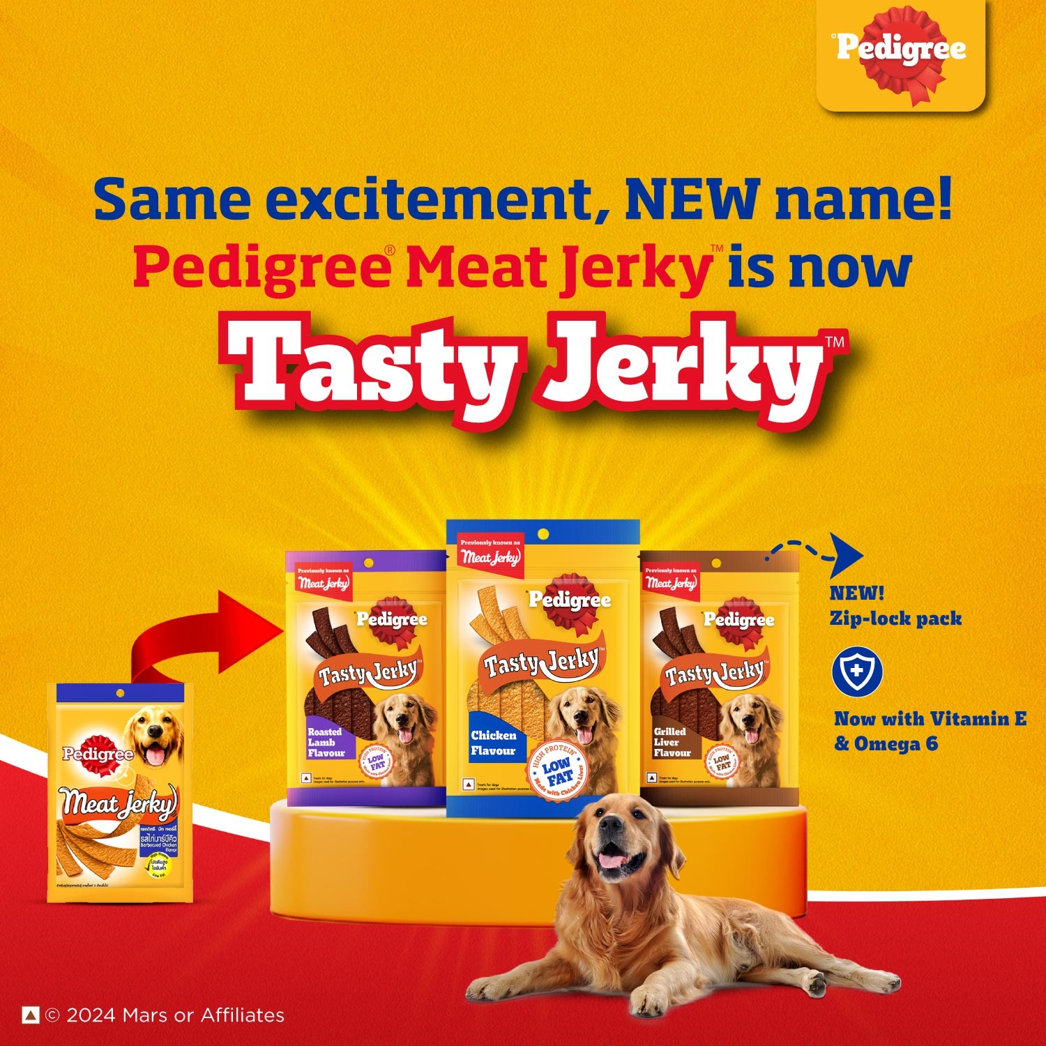 😋 DELICIOUS FLAVOR: Pedigree® Tasty Jerky™ Chicken Flavour dog treat is a great combination of good taste and soft chewy texture.