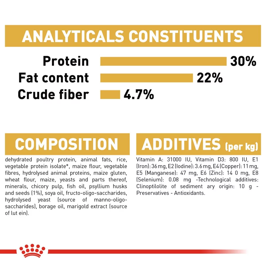 Digestive performance : Highly digestible protein (L.I.P.*) to support healthy digestion, and prebiotics to promote a balance in the intestinal flora. *L.I.P.: protein selected for its very high digestibility.