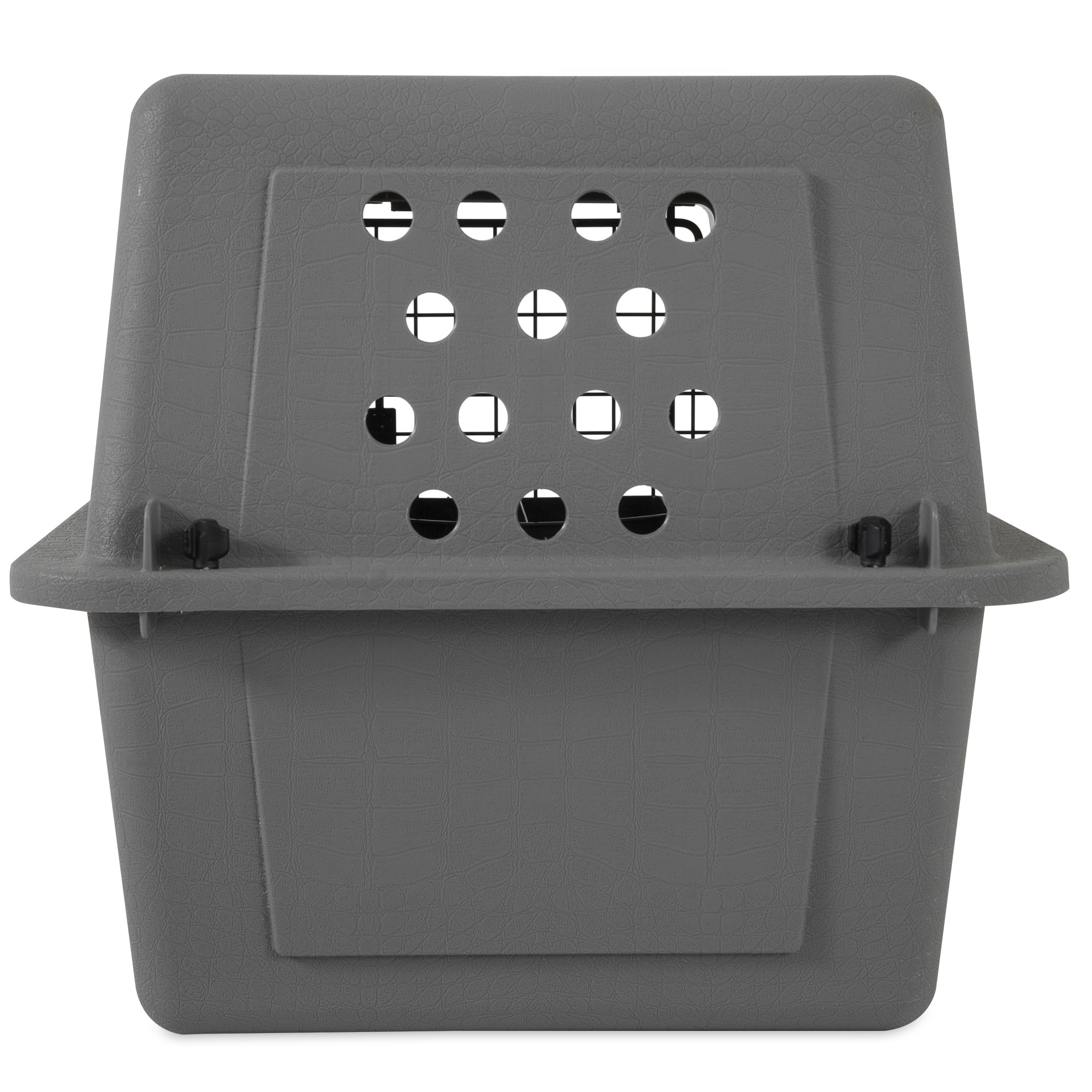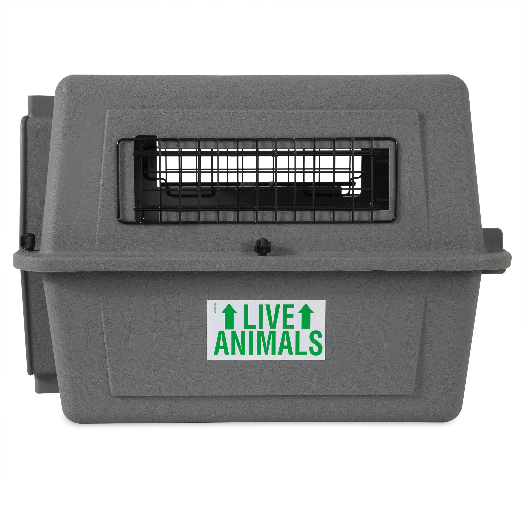 This heavy-duty travel kennel features high-strength construction made with 90% pre-consumer recycled plastic, 360-degree wire ventilation windows for plenty of healthy airflow, and non-corrosive wing-nuts and bolts for durable assembly.