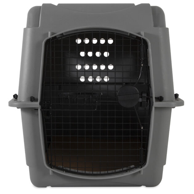 This heavy-duty travel kennel features high-strength construction made with 90% pre-consumer recycled plastic, 360-degree wire ventilation windows for plenty of healthy airflow, and non-corrosive wing-nuts and bolts for durable assembly. |