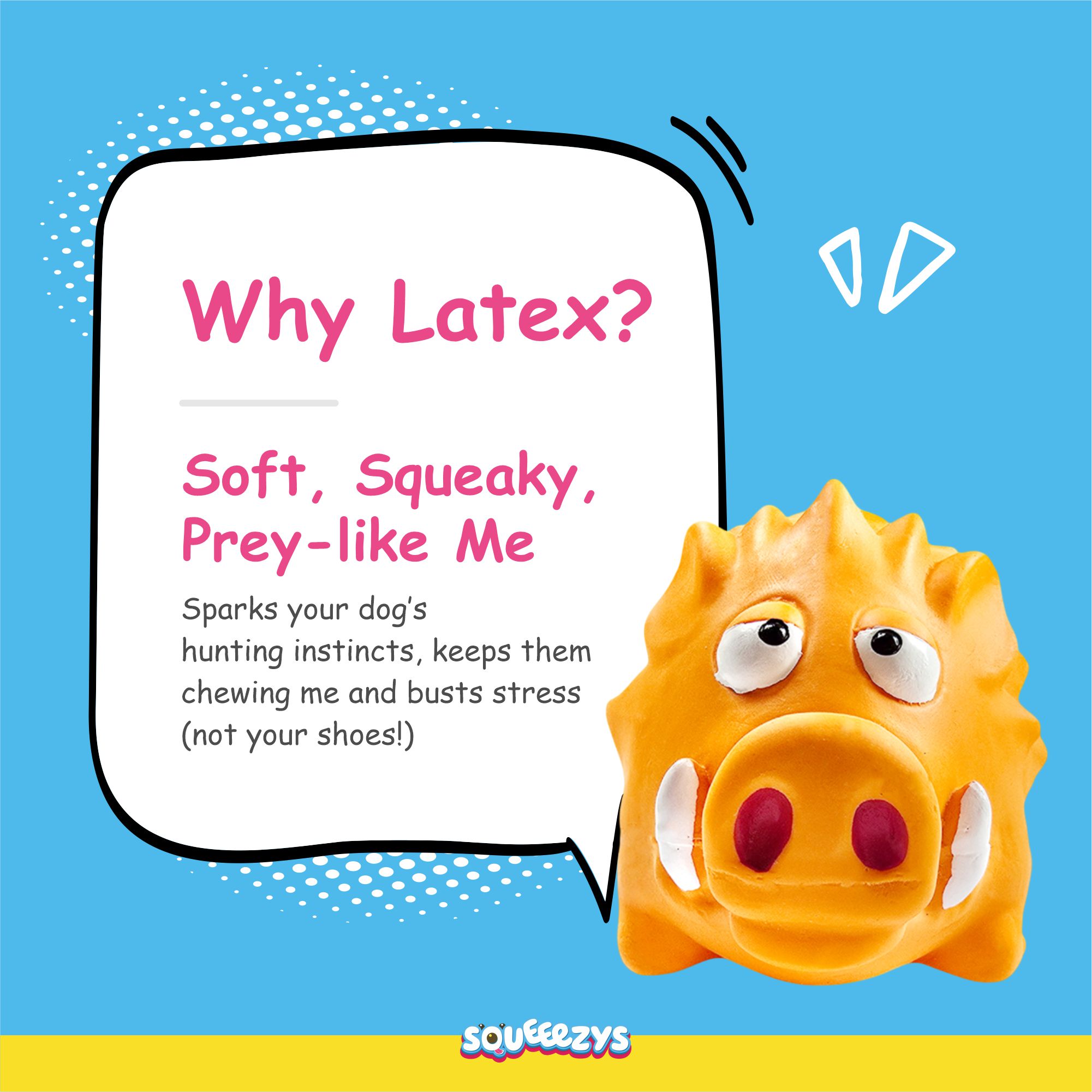 Hey there, future best buddy! I’m WARTHOG! I’m not just any dog toy – I’m part of the Squeeezys Collection, a fun, homegrown dogs toys brand that keeps you entertained while giving your hooman peace of mind. I’m designed especially for extra small to medium-sized pups, with a durable yet gentle build that can handle all your playful bites and tugs. We’re going to have tons of fun together, making memories with each game of fetch, tug, and chew!