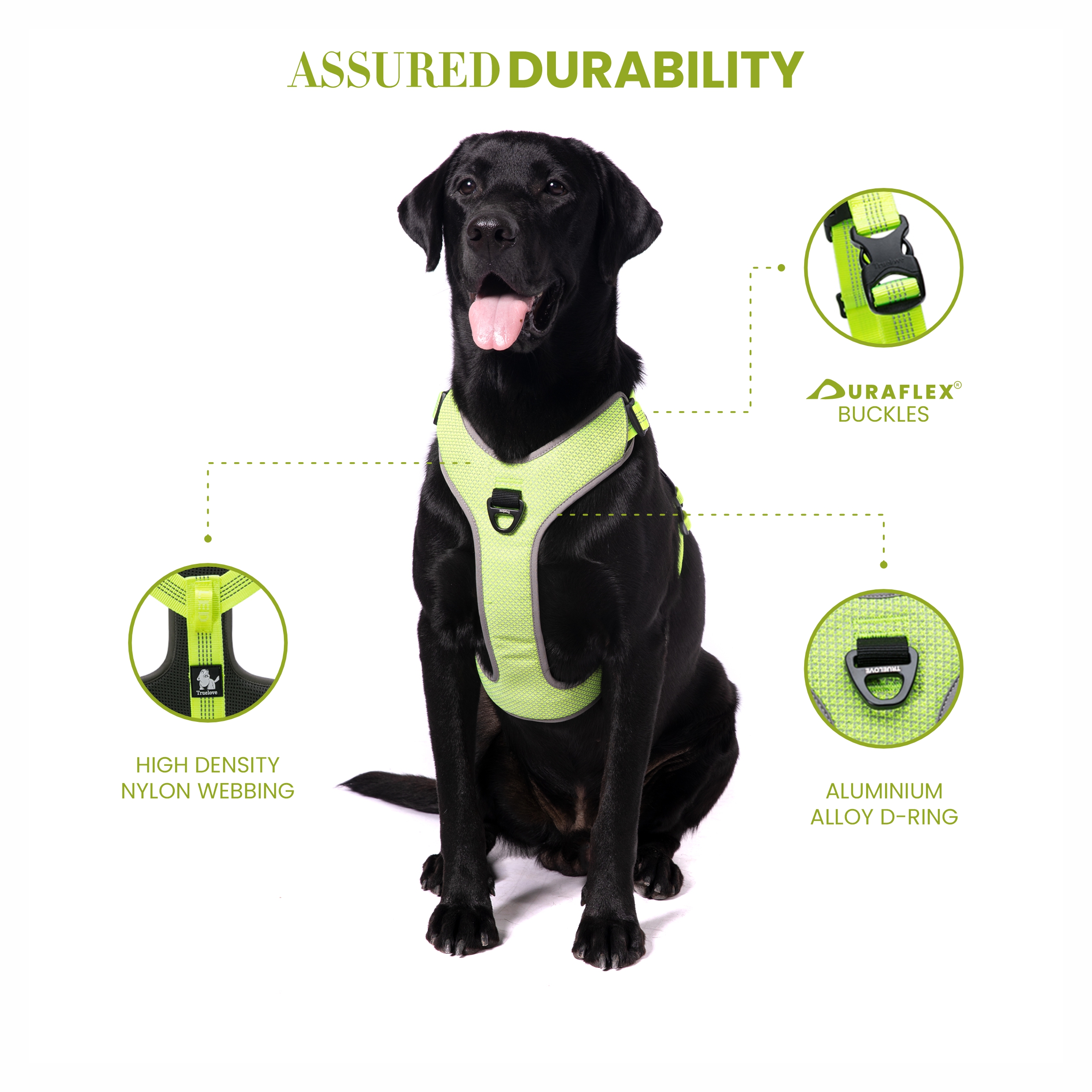 Barkbutler x Truelove Reflective No-Pull, no choke dog padded harness is the only H harness you need for your doggy. What makes Truelove pet vest one of the best in the world? This cute chest harness design has been equipped with patented, heavy load-bearing capacity Duraflex buckles for enhanced security, High-density nylon webbing for longevity, the aluminium alloy D-rings keeps the harness light while maintaining durability. When it comes to comfort, the ultra-soft & comfortable, breathable air mesh with high elasticity sponge padding, combined with low friction soft nylon straps makes it an extremely comfortable choice for long & short walks. The 3M reflective stitching & piping by 3M Scotchlite – pioneers in Safety equipment around the world, makes walking in the dark with this dog body harness brighter & much safer. For the perfect fit, this harness is made adjustable at the chest & neck area. For maximum control, a Safety/Support handle has been provided on the back of the harness as well. Measure your pet before purchase, refer to the sizing chart in our product images section. Matching leash option available with this Y harness. Hand Wash, only. Pro Tip: Does your dog pull? Connect the leash to the chest or front clip and say goodbye to pulling.