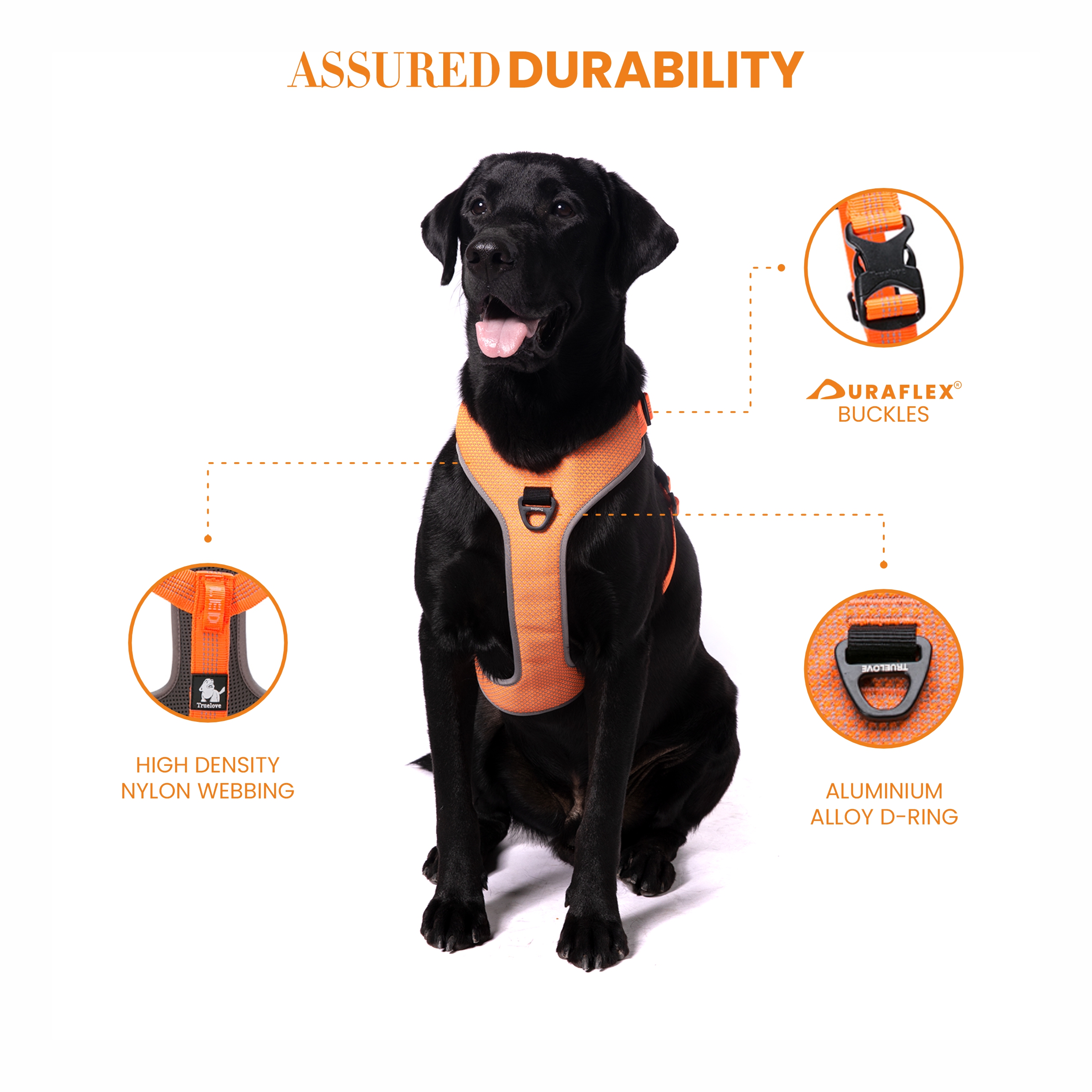 Barkbutler X Truelove Reflective No-Pull, no choke dog padded harness is the only H harness you need for your doggy. What makes Truelove pet vest one of the best in the world? This cute chest harness design has been equipped with patented, heavy load-bearing capacity Duraflex buckles for enhanced security, High-density nylon webbing for longevity, and the aluminium alloy D-rings keeps the harness light while maintaining durability. When it comes to comfort, the ultra-soft & comfortable, breathable air mesh with high elasticity sponge padding, combined with low friction soft nylon straps makes it an extremely comfortable choice for long & short walks. The 3M reflective stitching & piping by 3M Scotchlite – pioneers in Safety equipment around the world, makes walking in the dark with this dog body harness brighter & much safer. For the perfect fit, this harness is made adjustable at the chest & neck area. For maximum control, a Safety/Support handle has been provided on the back of the harness as well. Measure your pet before purchase, refer to the sizing chart in our product images section. Matching leash option available with this Y harness. Hand Wash, only. Pro Tip: Does your dog pull? Connect the leash to the chest or front clip and say goodbye to pulling.