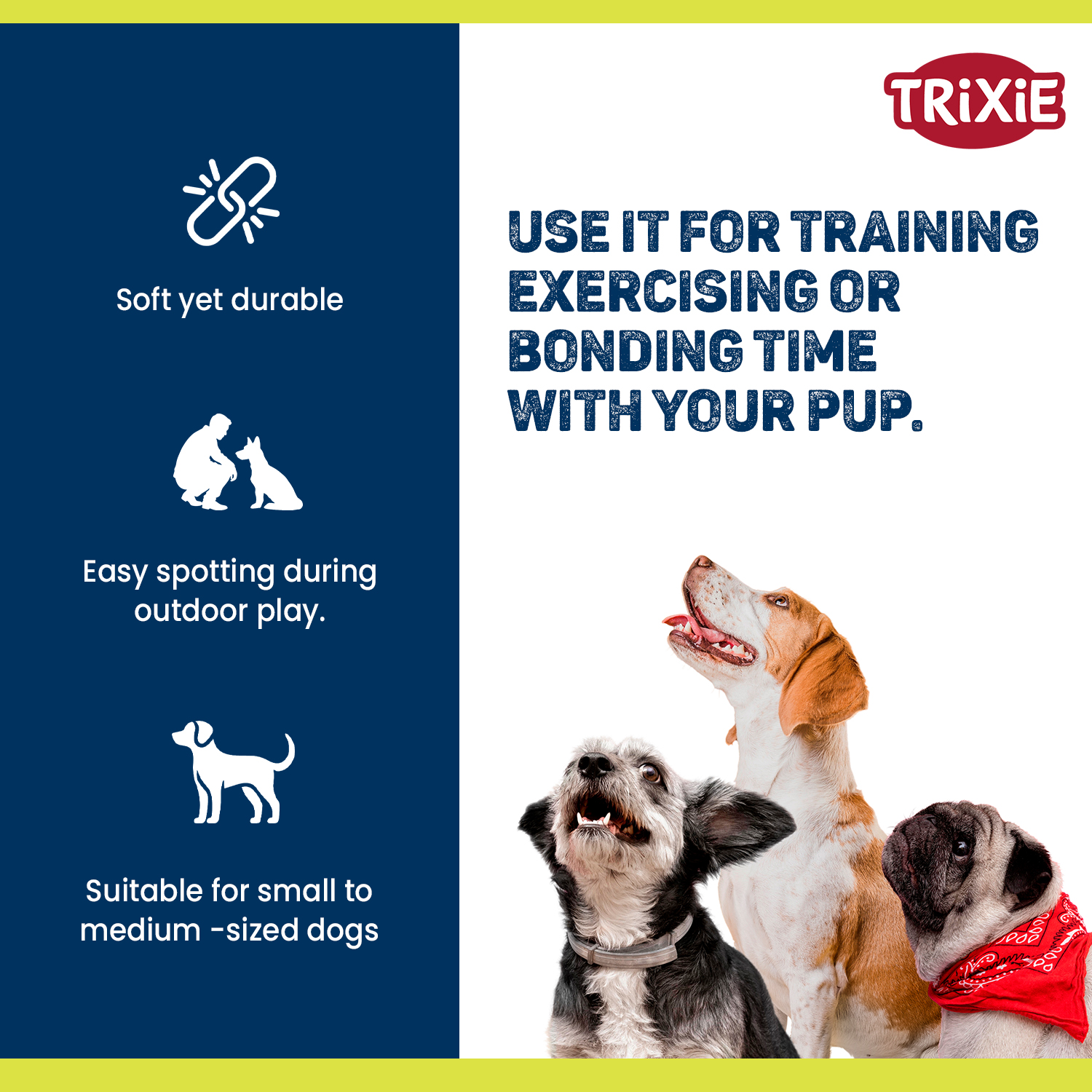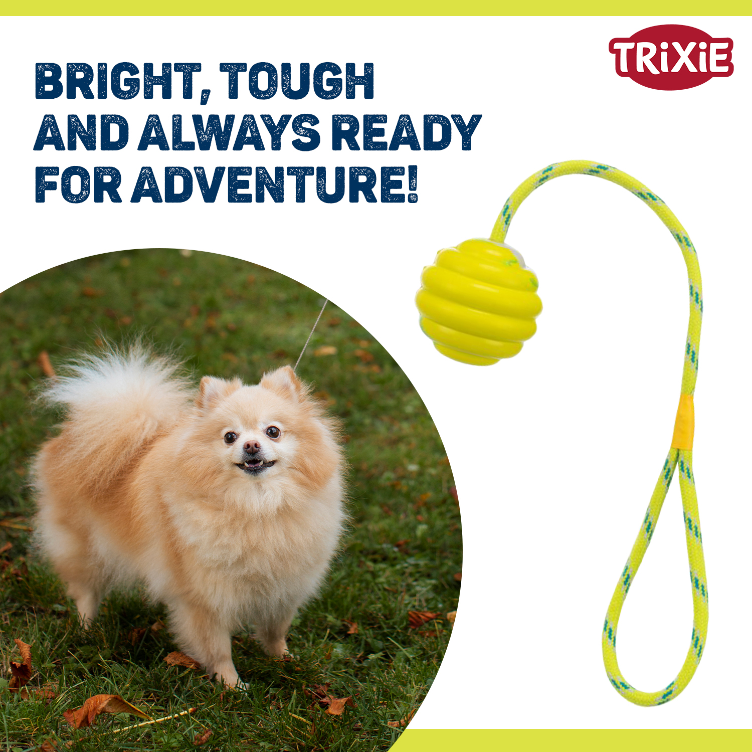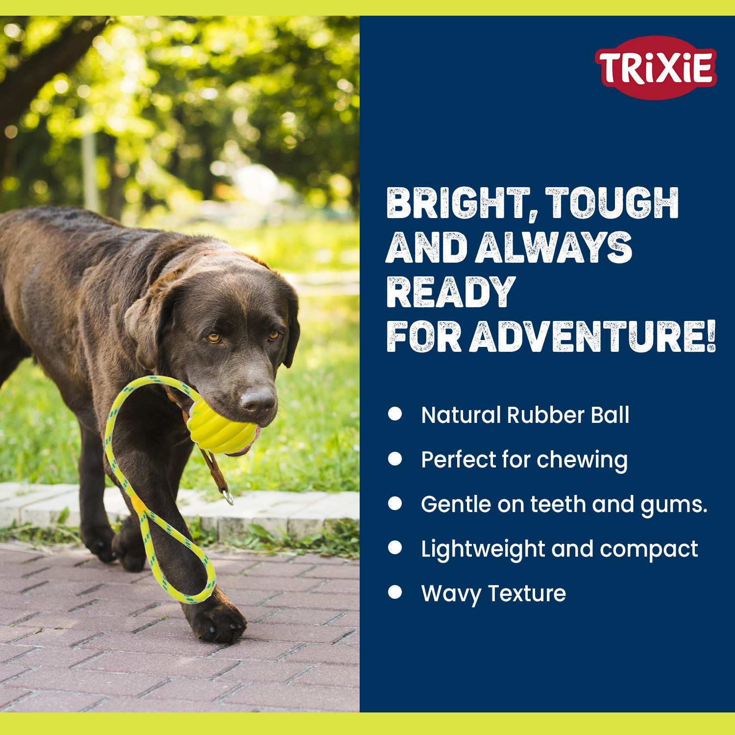 | This wavy rubber ball on a sturdy rope is designed for active chewing and interactive fetch. |